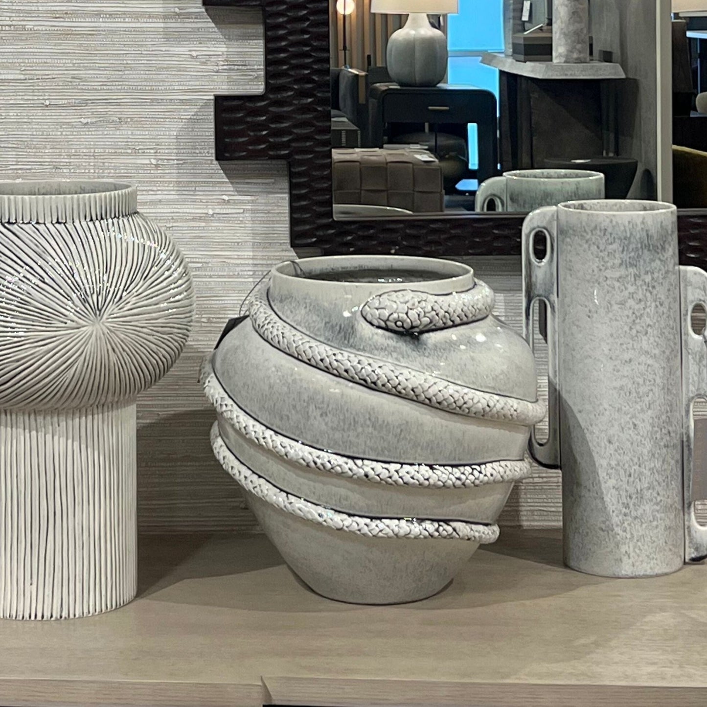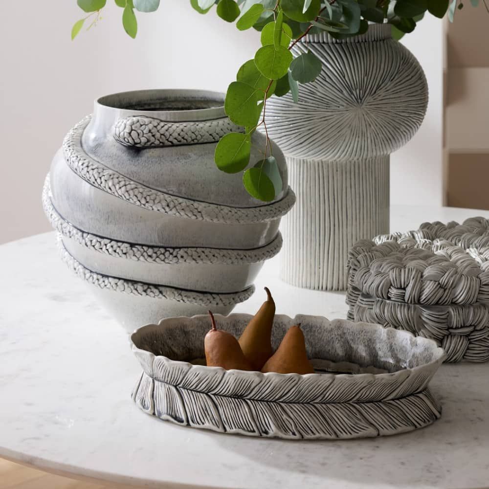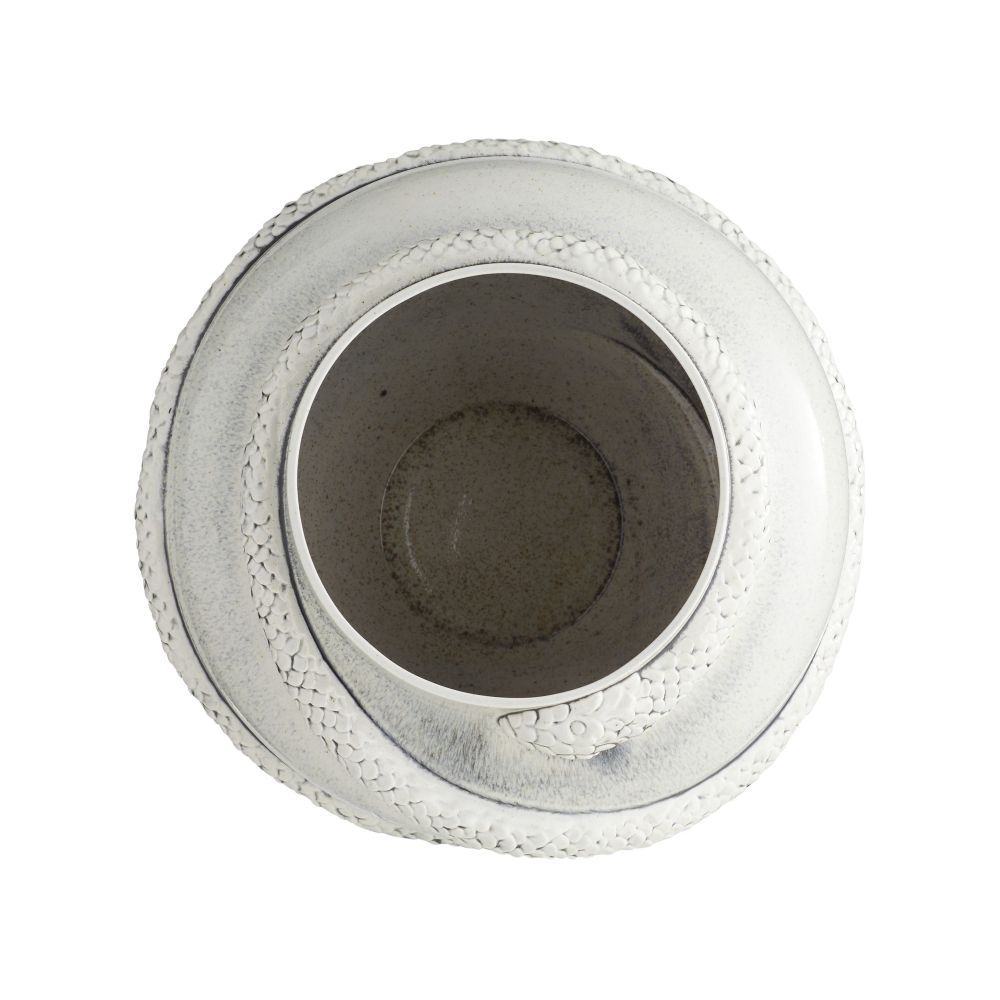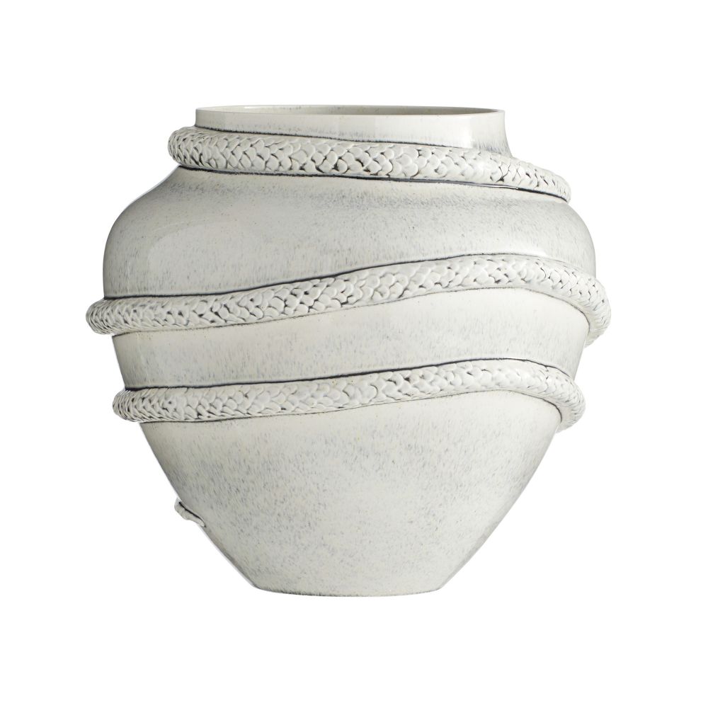 The Godsick Vase Glazed by Arteriors Home features a striking serpentine shape that showcases its impressive size. Made of porcelain and finished with an ice-reactive glaze, this vase captures the essence of animal energy and accentuates its intricate sculptural elements.
