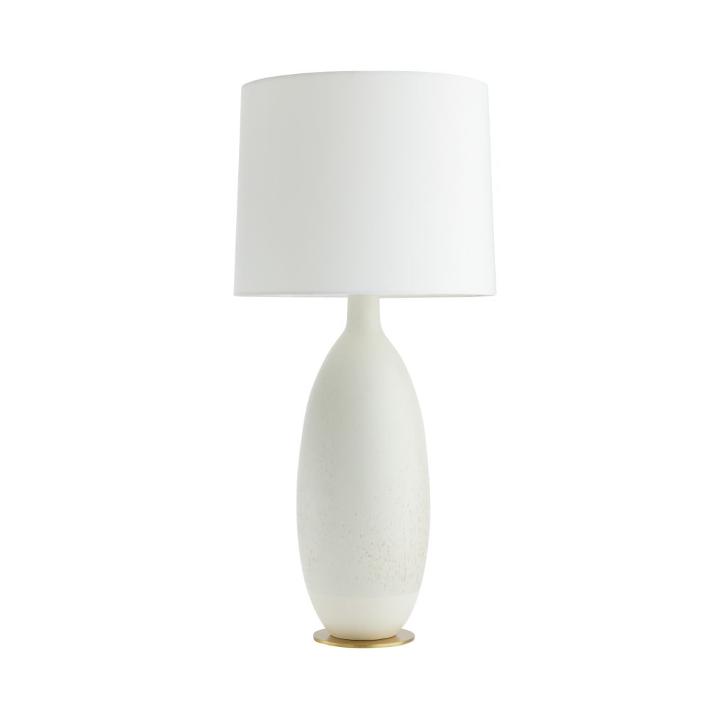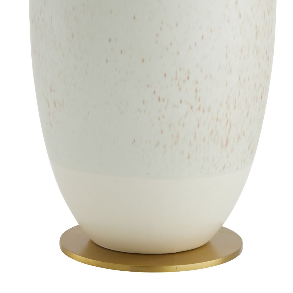The Gola Lamp in Quail Egg by Arteriors Home features a reactive glaze that highlights the sleek design of the Gola. With antique brass-plated steel hardware and a matching finial, this porcelain lamp adds a serene touch to any surface.