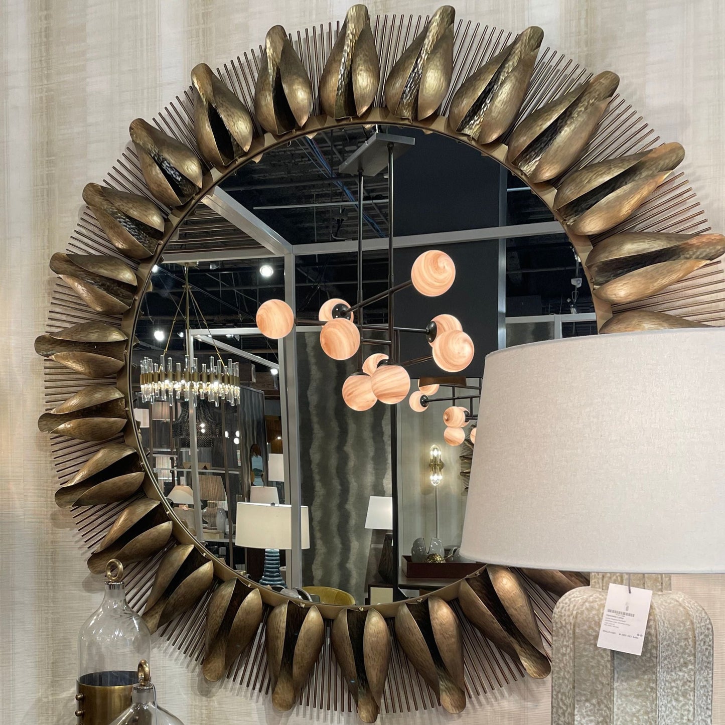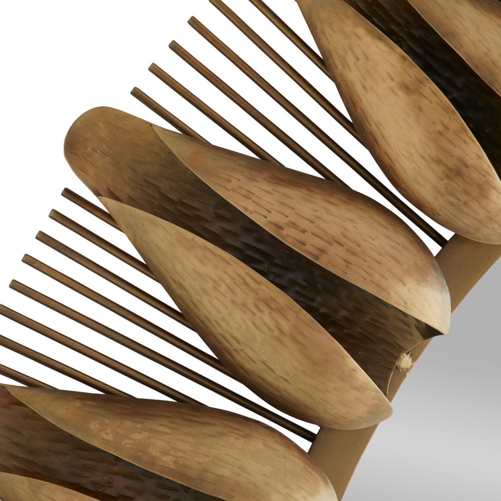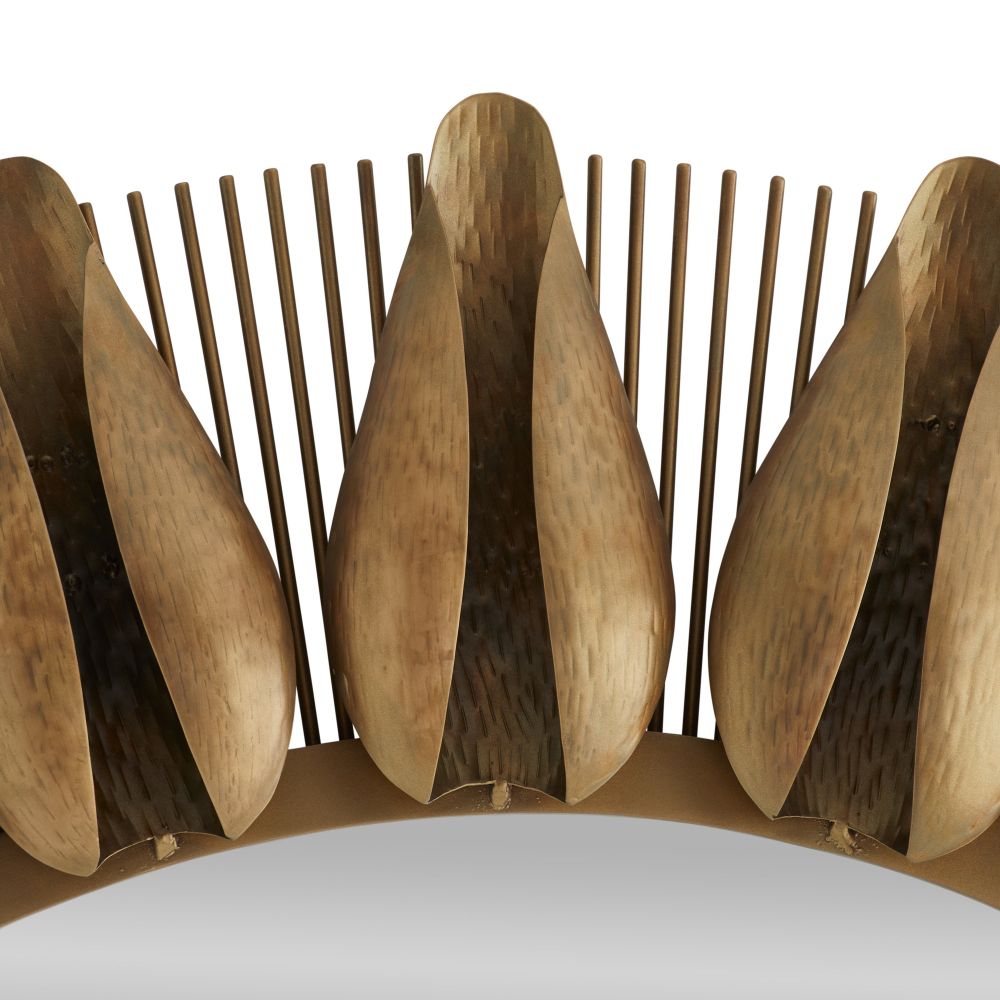 The Goldie Mirror in Antique Brass from Arteriors Home showcases a mid-century-inspired iron frame with hammered and folded flower buds. Its dynamic design is accented by a sunburst ray and plated with antique brass, and easily secured with a cleat attachment.