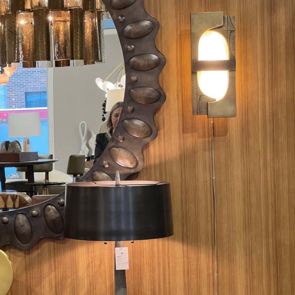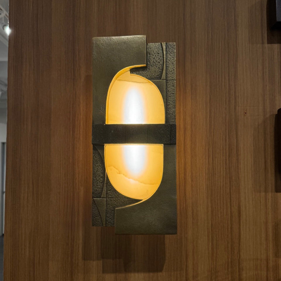 Crafted by Arteriors Home, the Graham Sconce in Antique Brass exudes a Brutalist aesthetic, featuring a suspended white onyx shade in an antique brass-plated cast iron frame. The masculine and feminine elements are perfectly balanced with the addition of a ribbed English bronze plated iron band. This museum-quality sconce also includes an integrated LED bulb.
