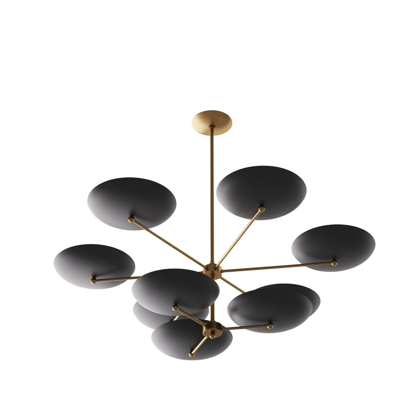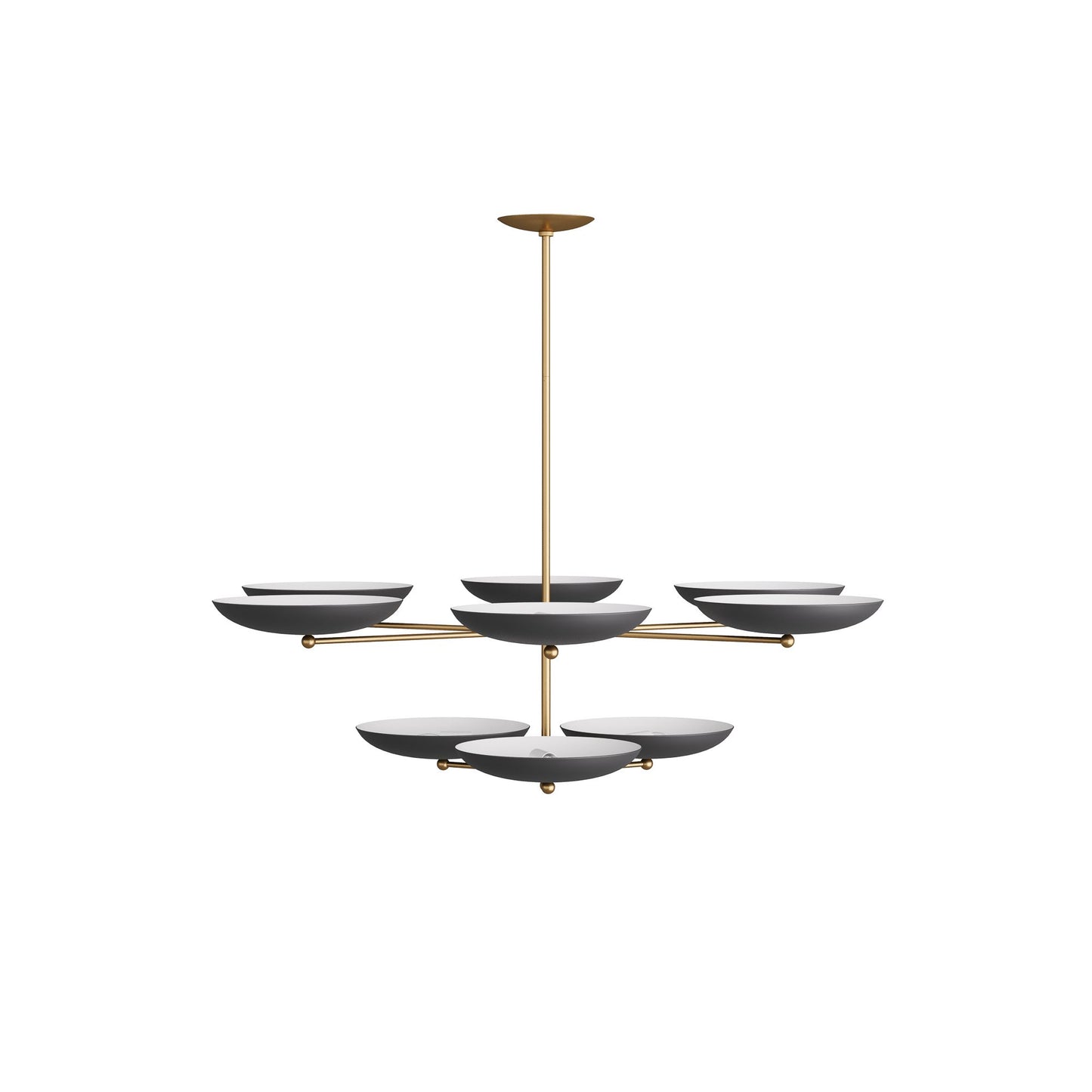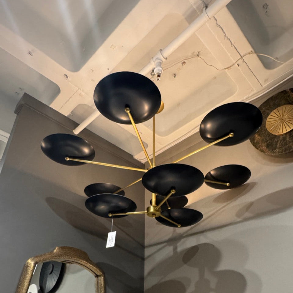 The Griffith Chandelier features a striking bronze design with antique brass accents, inspired by mid-century public spaces. Its upward-facing plates reflect light for a warm glow.