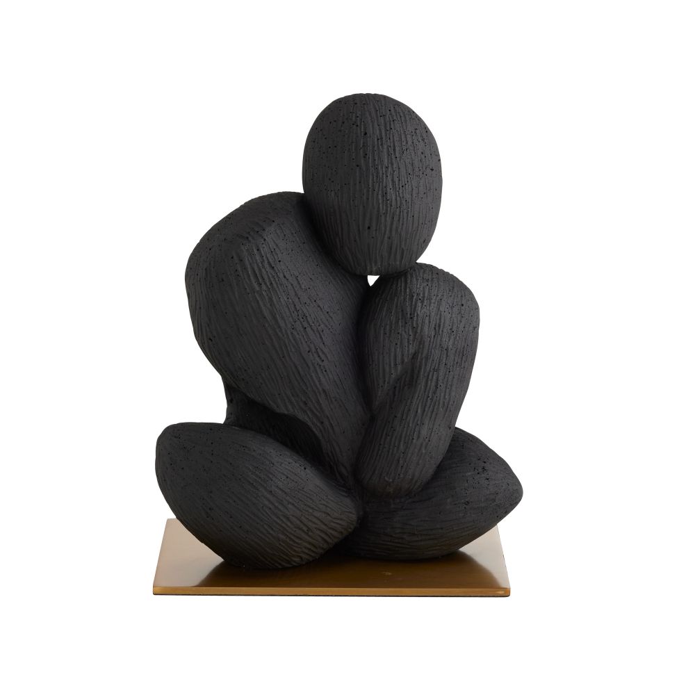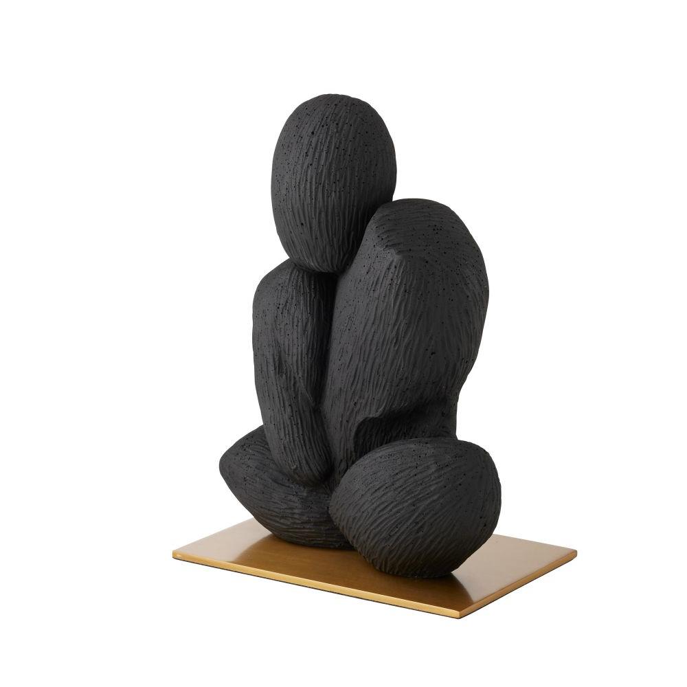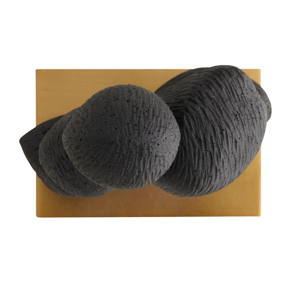 The Arteriors Home Grissom Sculpture Charcoal is a stunning totem made of ricestone composite, boasting an intricate free-form shape that exudes both tranquility and texture. With its changing appearance, this sculpture is a captivating addition to any space and is mounted on a steel base in antique brass finish.