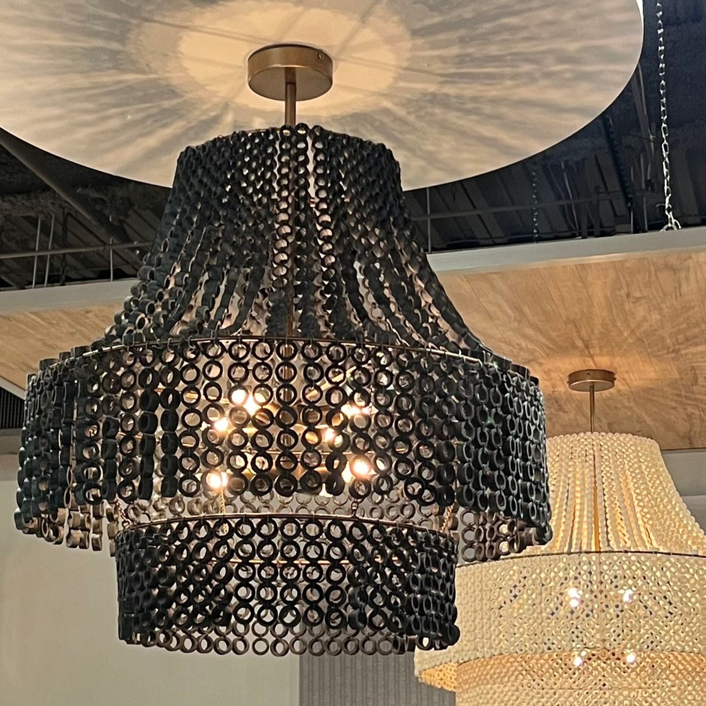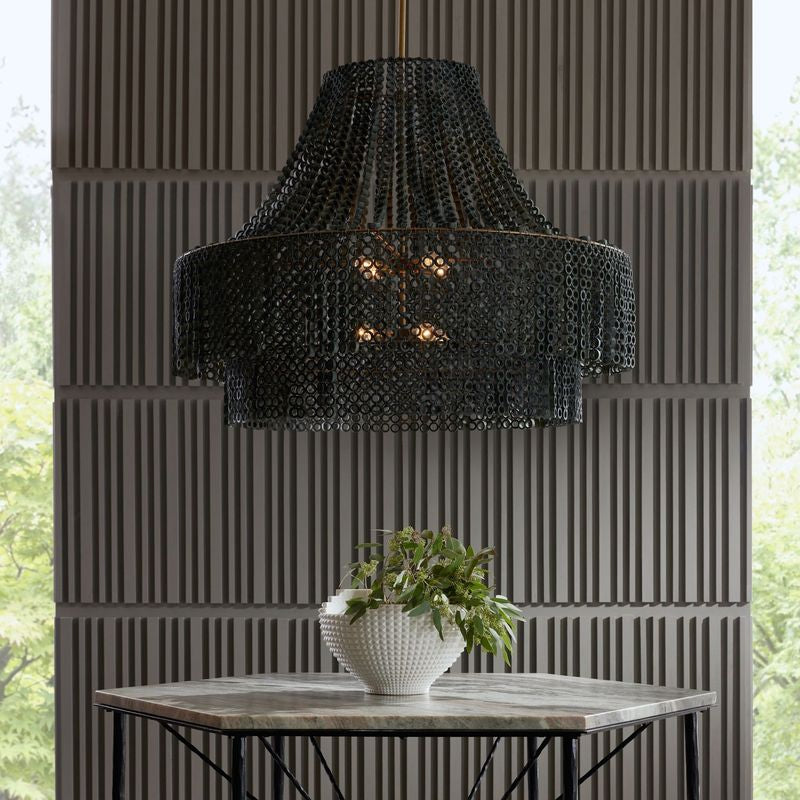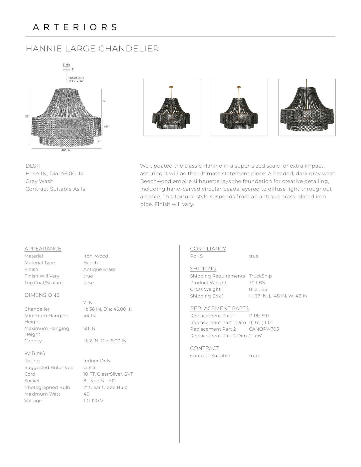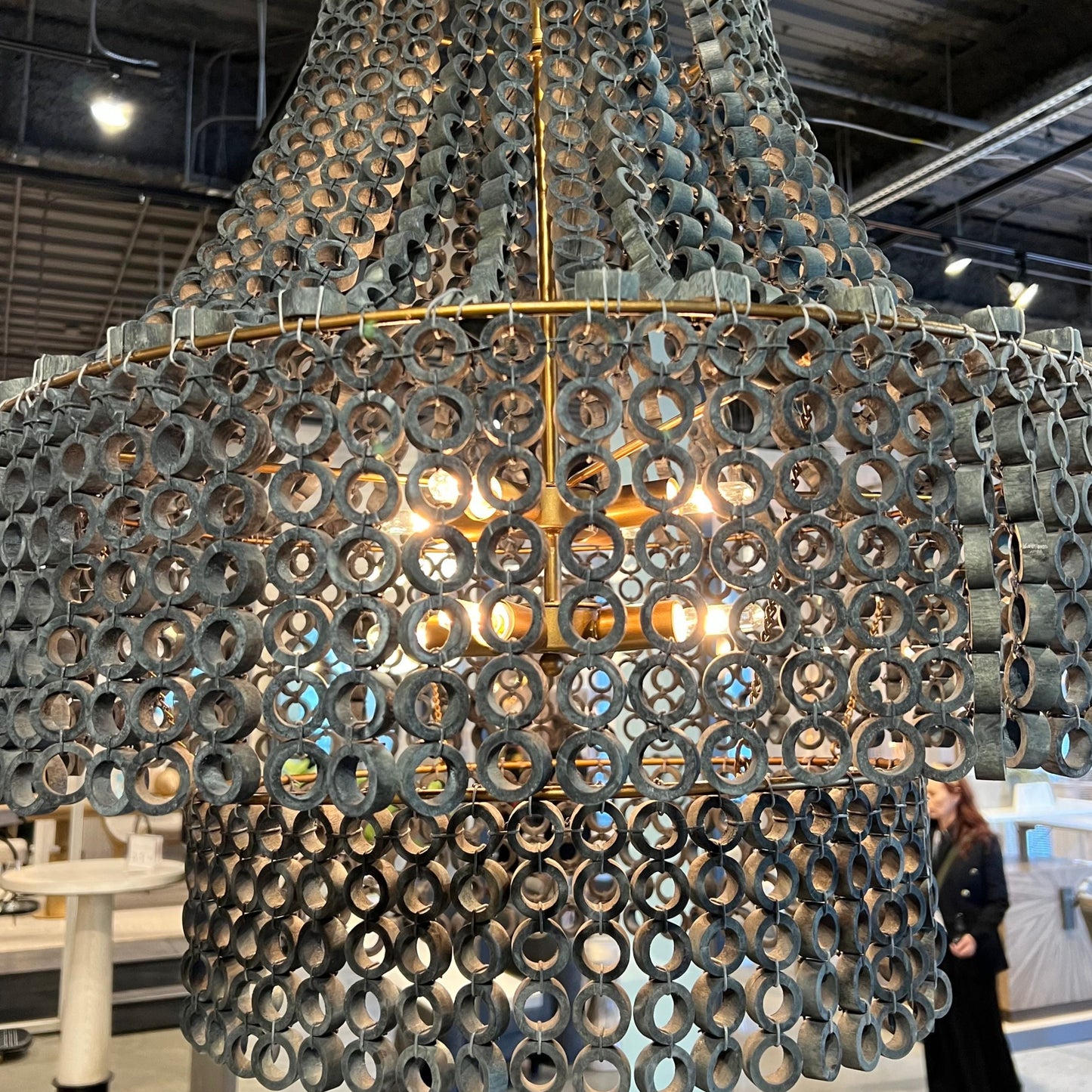 The Arteriors Home Hannie Chandelier in Gray Wash makes the ultimate statement with its oversized scale and beaded, gray wash beechwood empire silhouette. Creative detailing includes hand-carved circular beads that layer to diffuse light throughout your space. This textural piece suspends from an antique brass iron pipe.