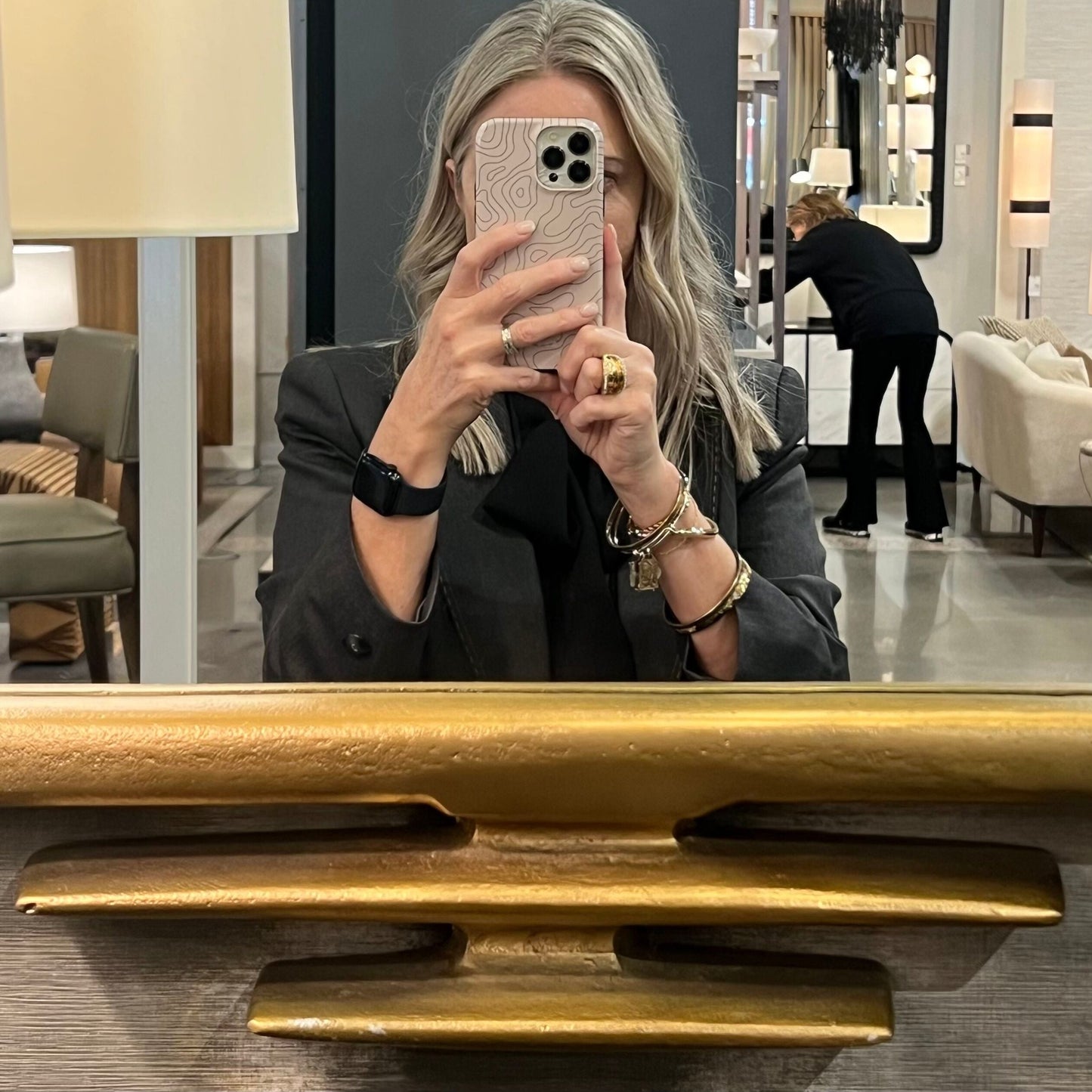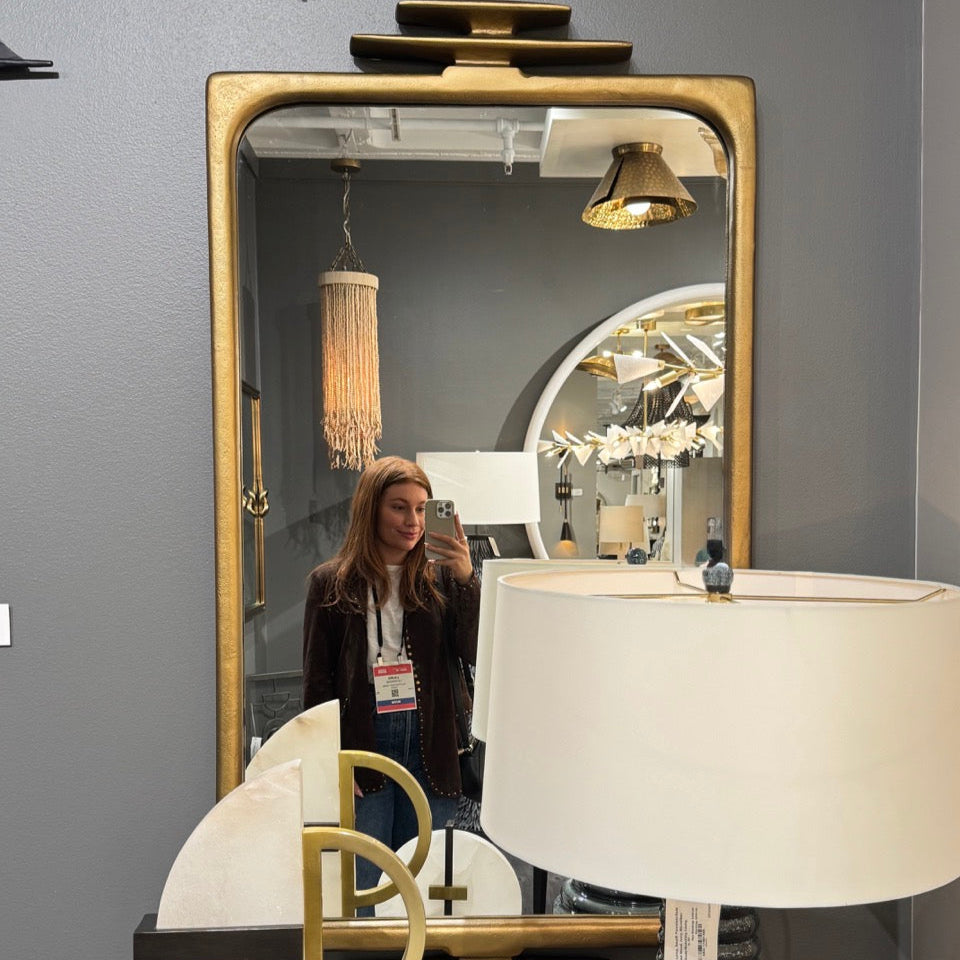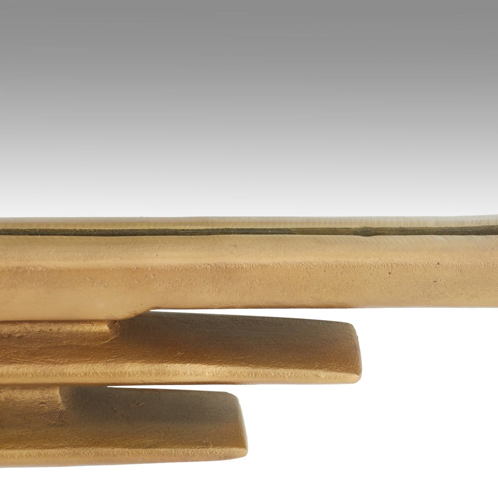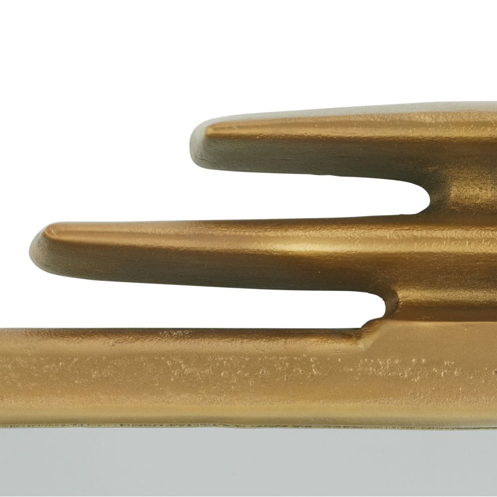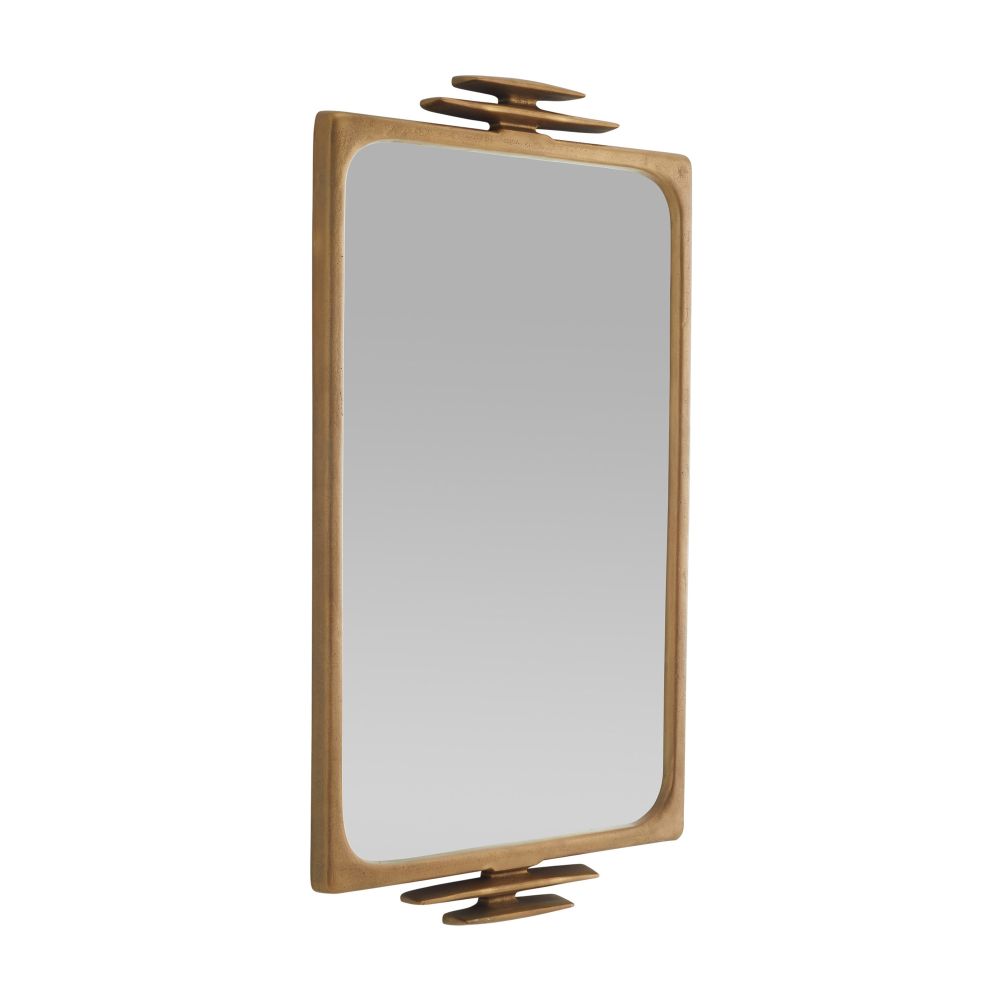 The Hardaway Mirror Antique Brass by Arteriors Home has curved edges and unique elements that evoke both classic accessories and futuristic aesthetics. Made of aluminum and coated with antique brass, the metal has a subtle unevenness that accentuates its genuine nature.