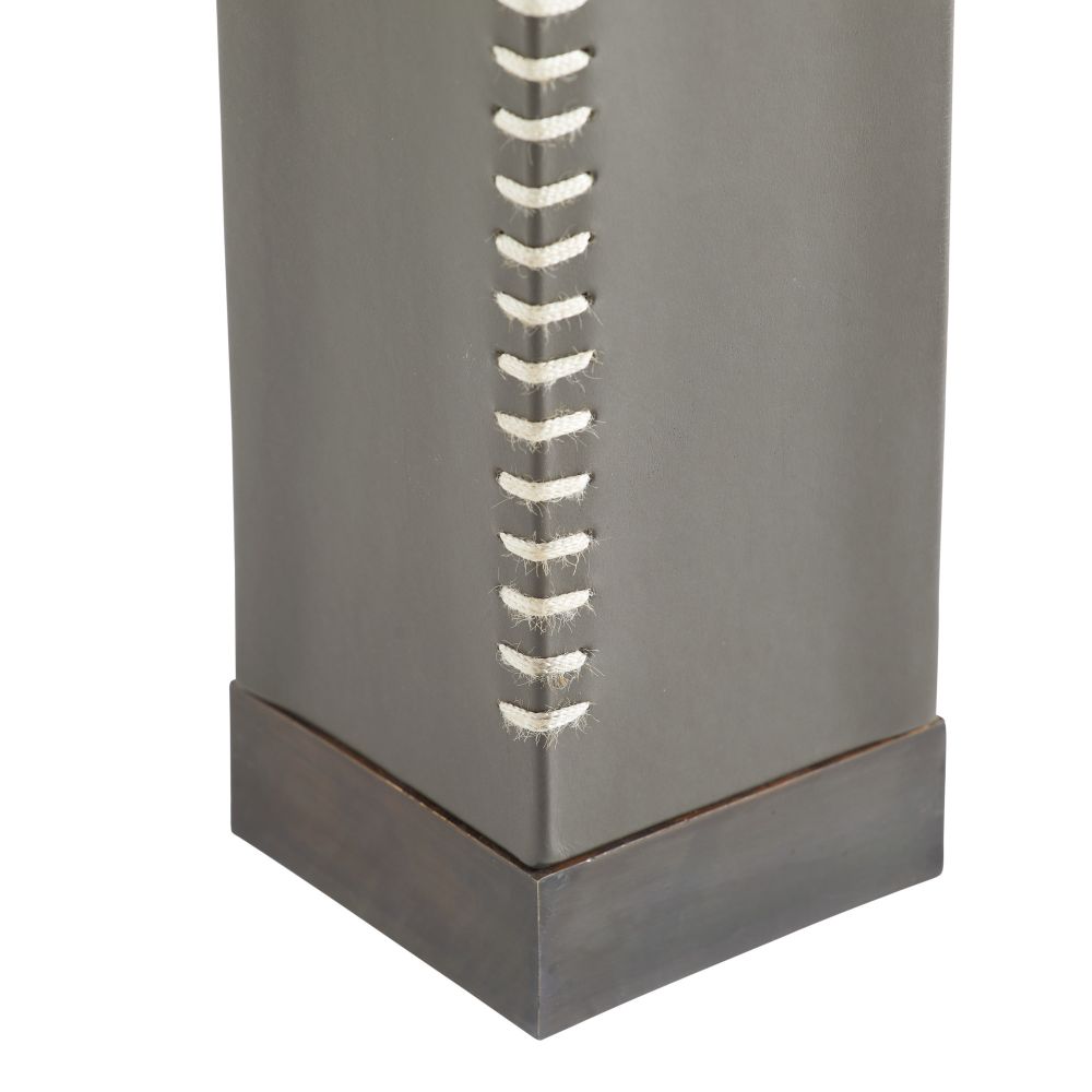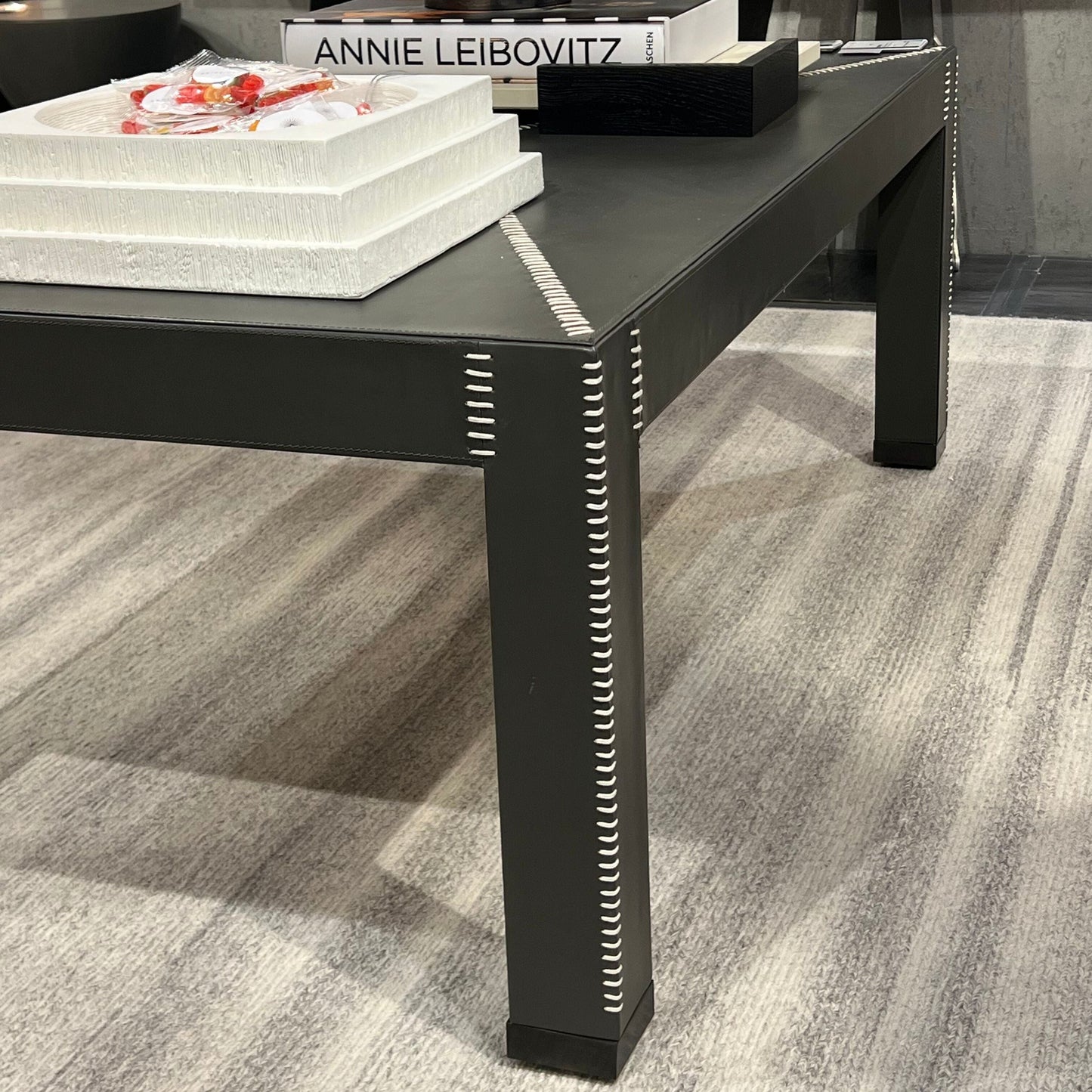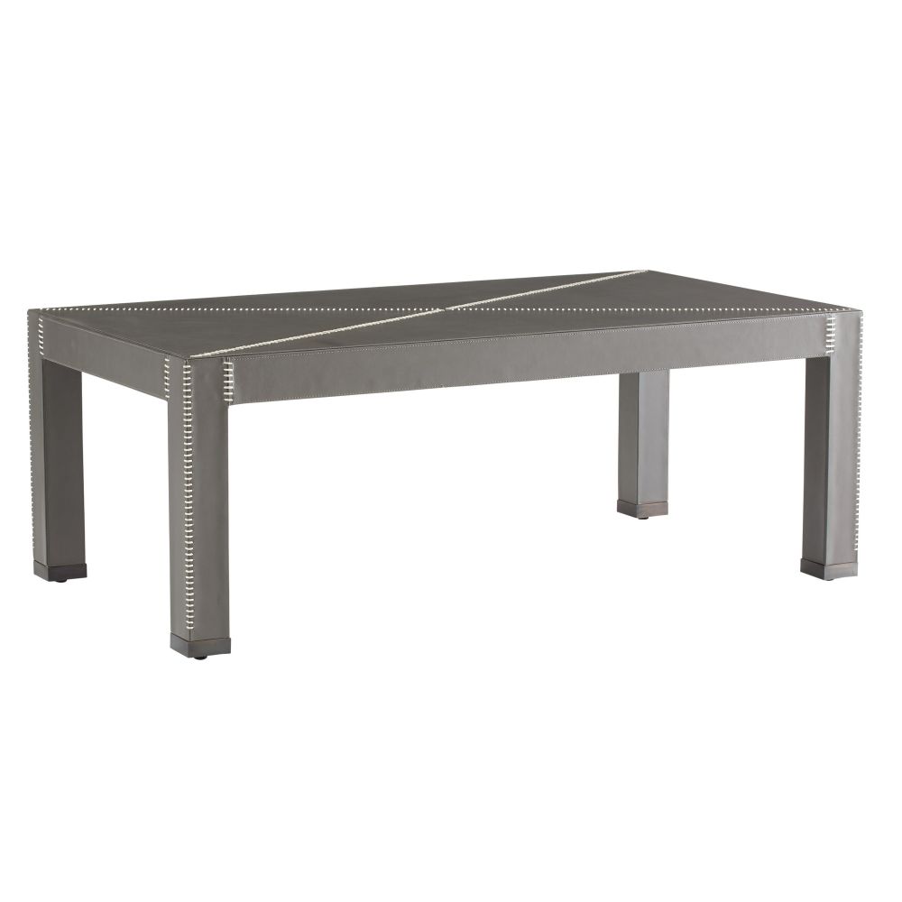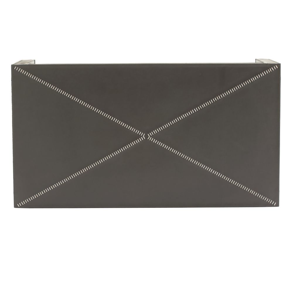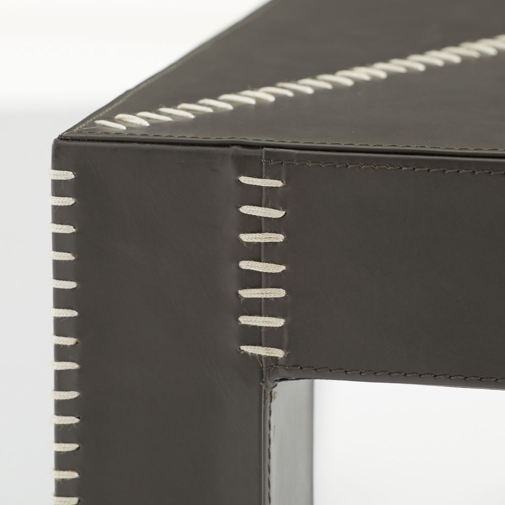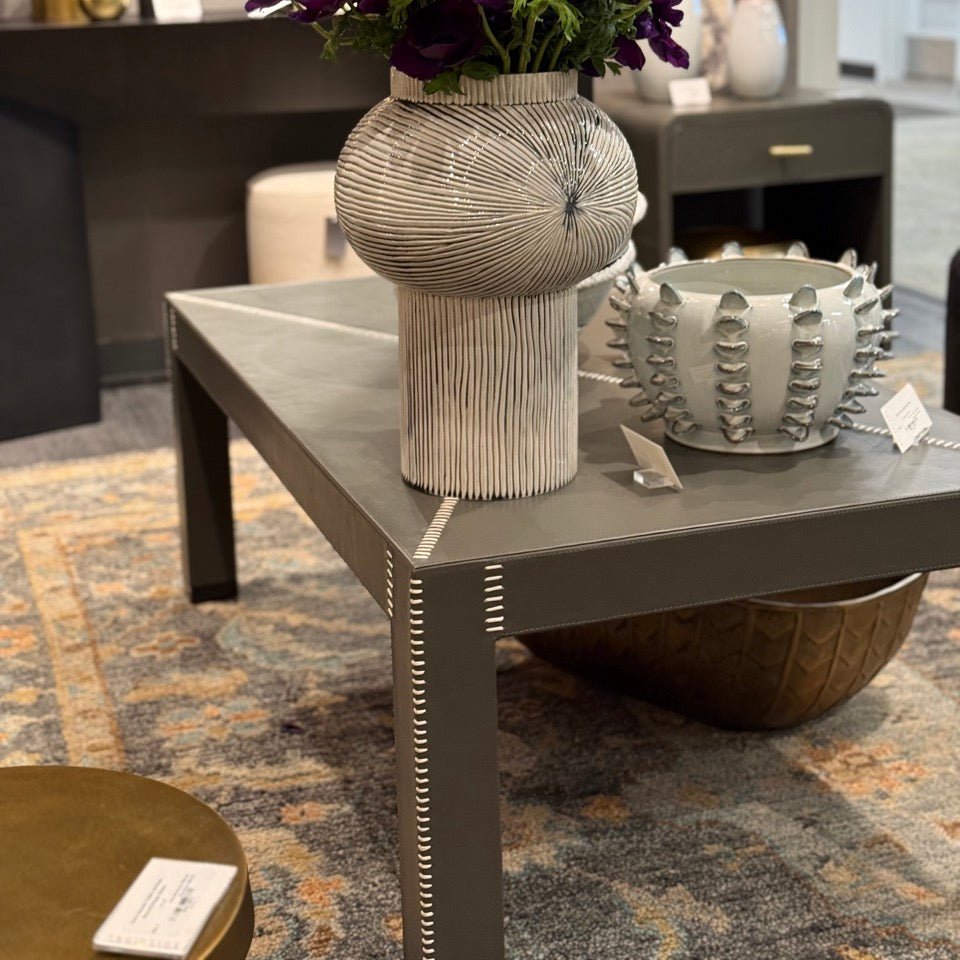 Featuring a stylish graphic X whipstitched design inspired by tailoring, the Hidalago Cocktail Table in Gray Leather from Arteriors Home exudes elegance. The entire surface is covered in dim gray leather, and the blackened bronze-tipped legs lend a touch of sophistication.