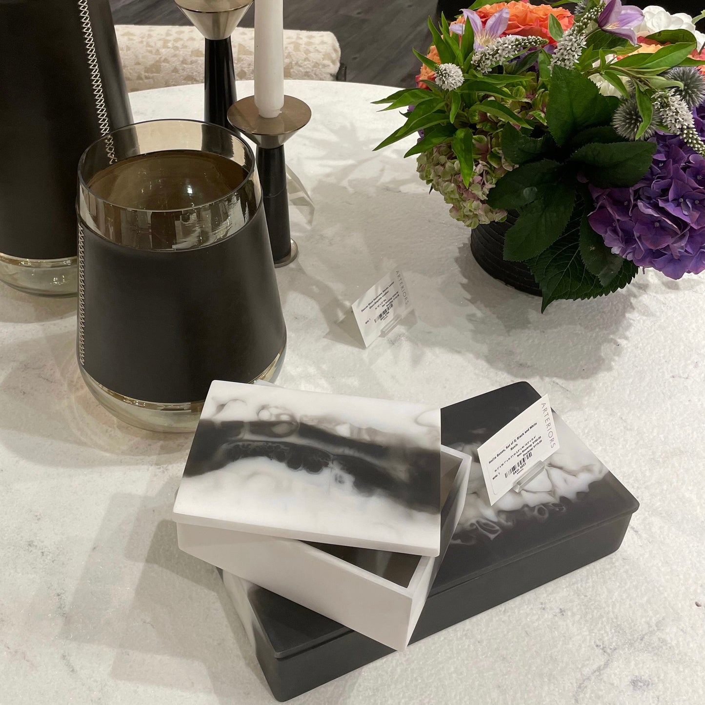 Discover yin and yang with Hollie Box Set from Arteriors Home. Resin foundations in black and white swirl patterns. Two sizes for stylish storage. Ideal for vanity, desk, or bookcase accents.