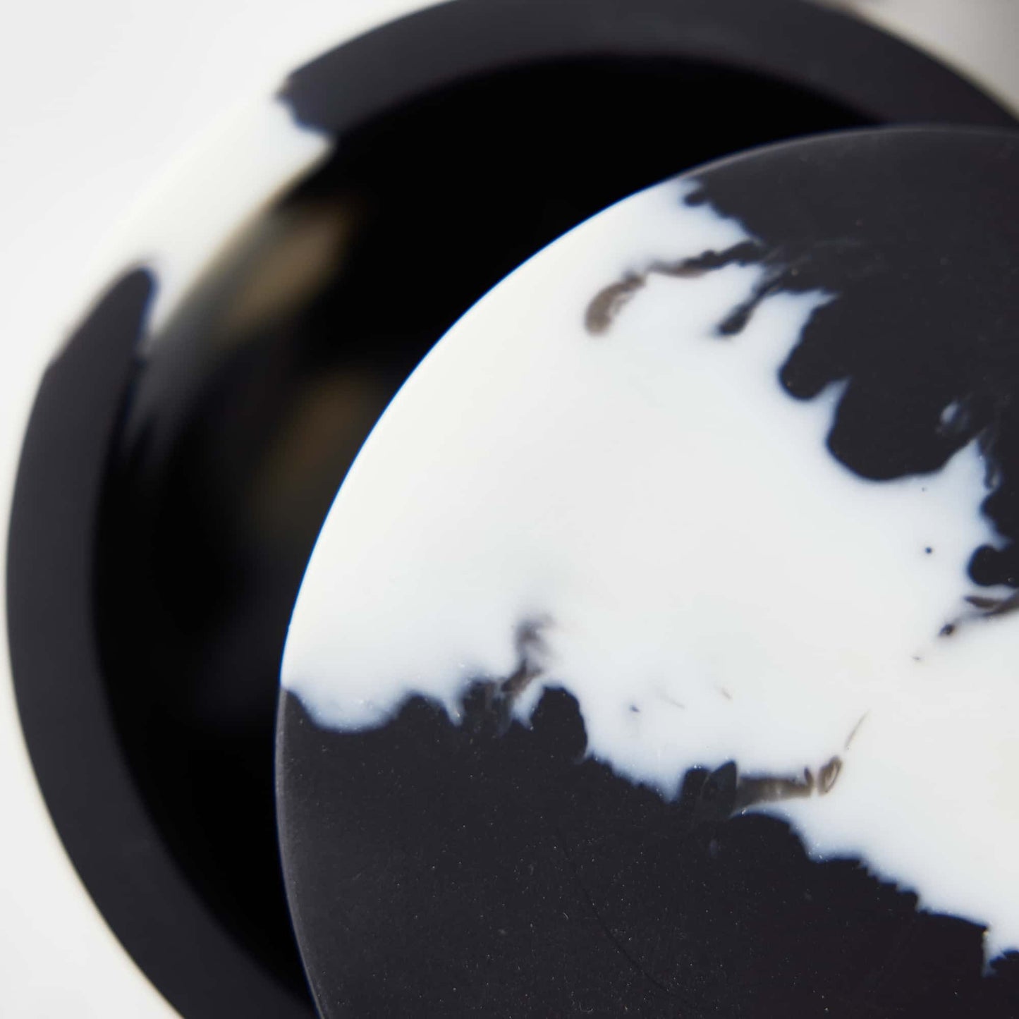 The Hollie Round Containers Set of 2 from Arteriors Home explores the concept of yin and yang by reversing color. A high-contrast combination of black and white sweep the resin vessels, each with its own distinct pattern. The pair of round containers is sure to stun in any space. Finish will vary. *Sold as a set of 2.