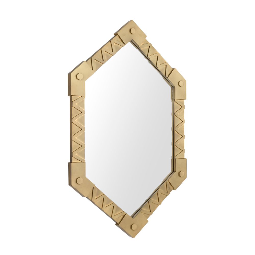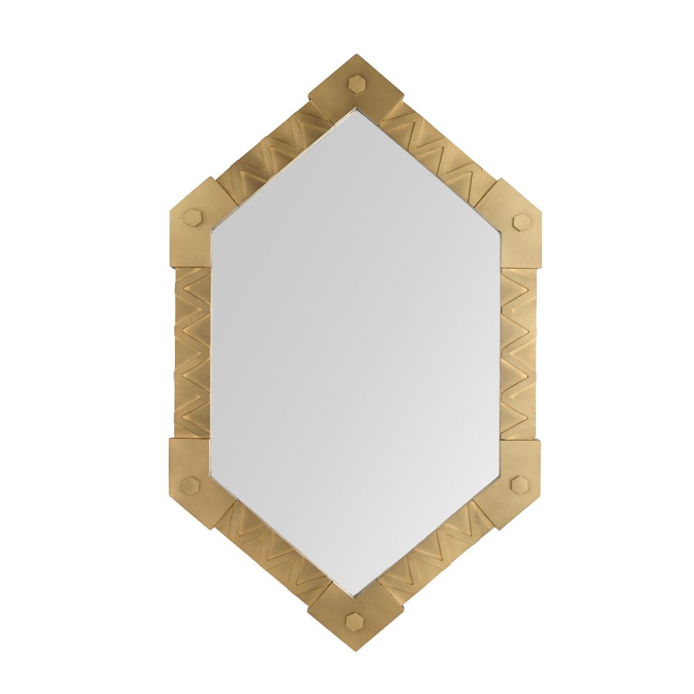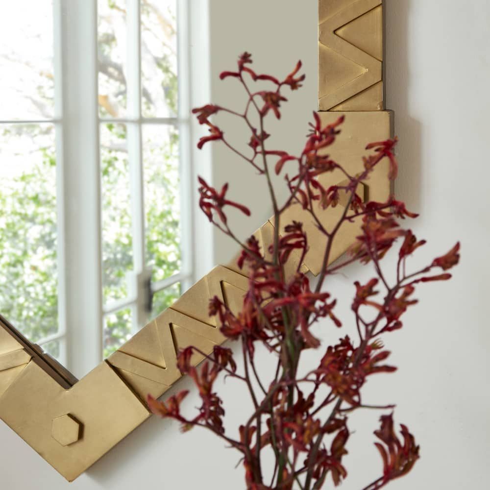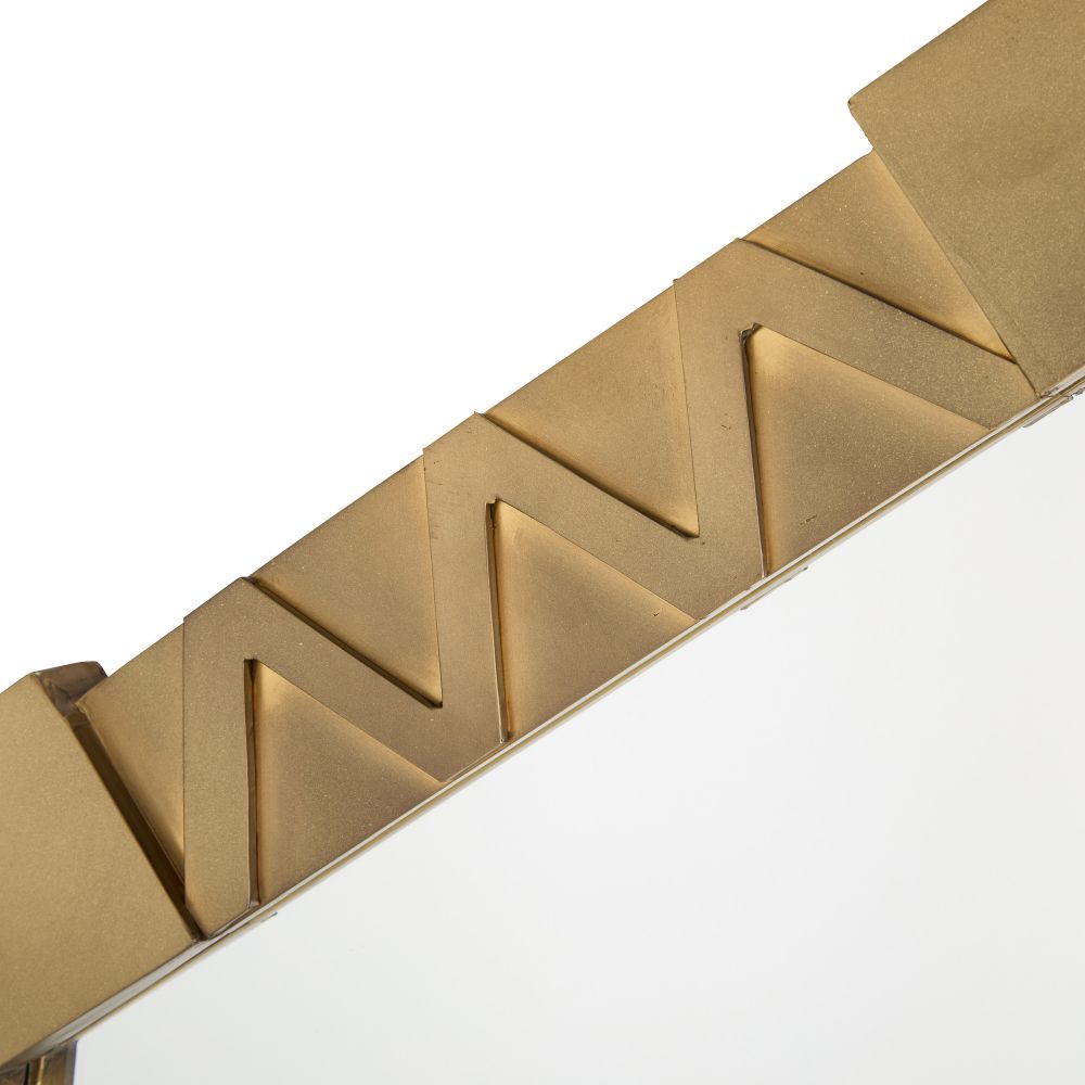 Arteriors Home's Holt Mirror exemplifies Arts and Crafts design principles through its antique brass-plated iron construction. The handcrafted layered metalwork enhances its geometric profile, while offering versatile vertical or horizontal mounting options.