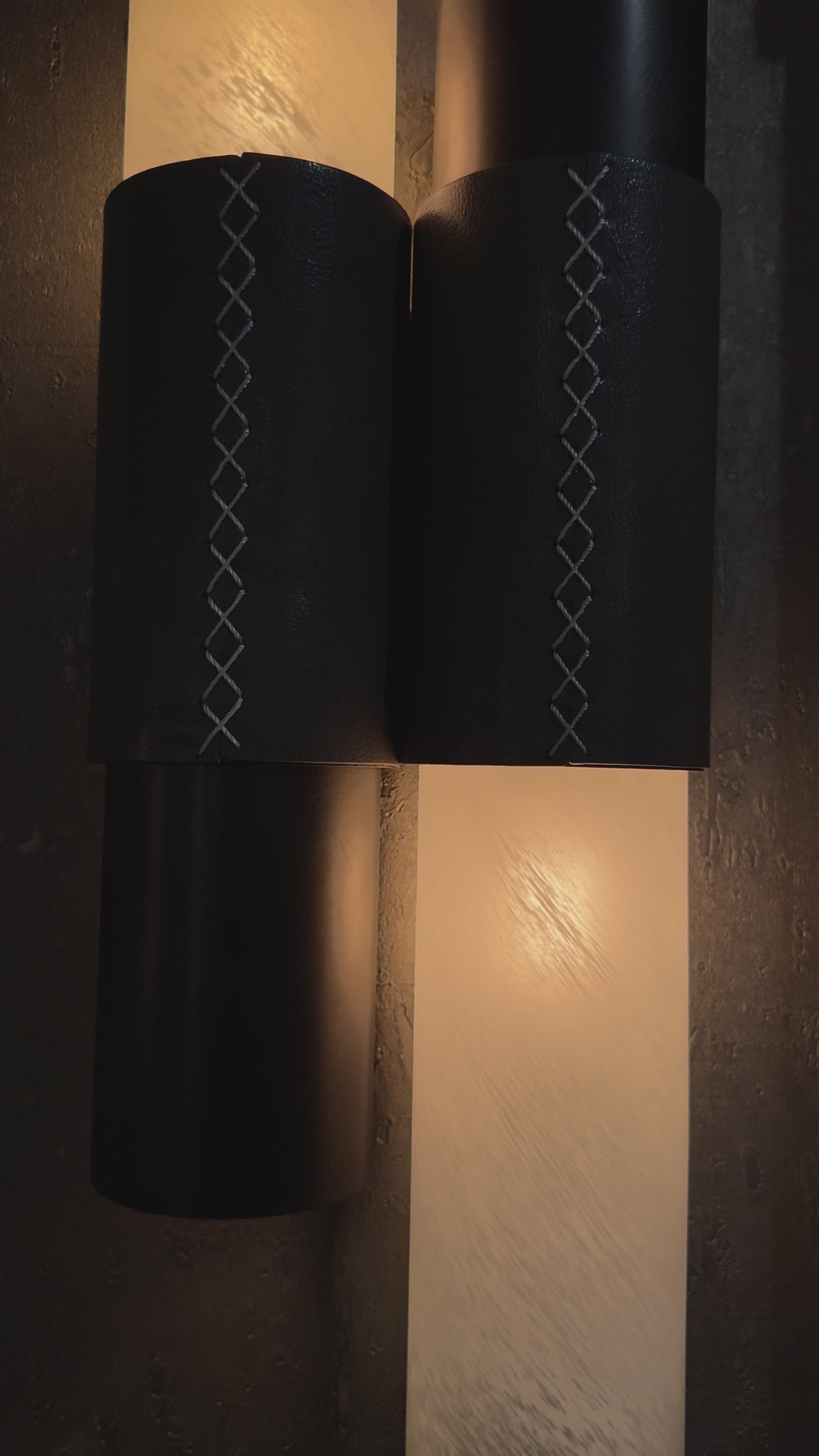 Meant to be mirrored in a pair, the clever Huntington Sconce in Charcoal Leather by Arteriors Home features interchangeable cuffs of matte swirl glass and English bronze-plated steel. Bands of topstitched charcoal leather add a tailored edge to the industrial vibe.