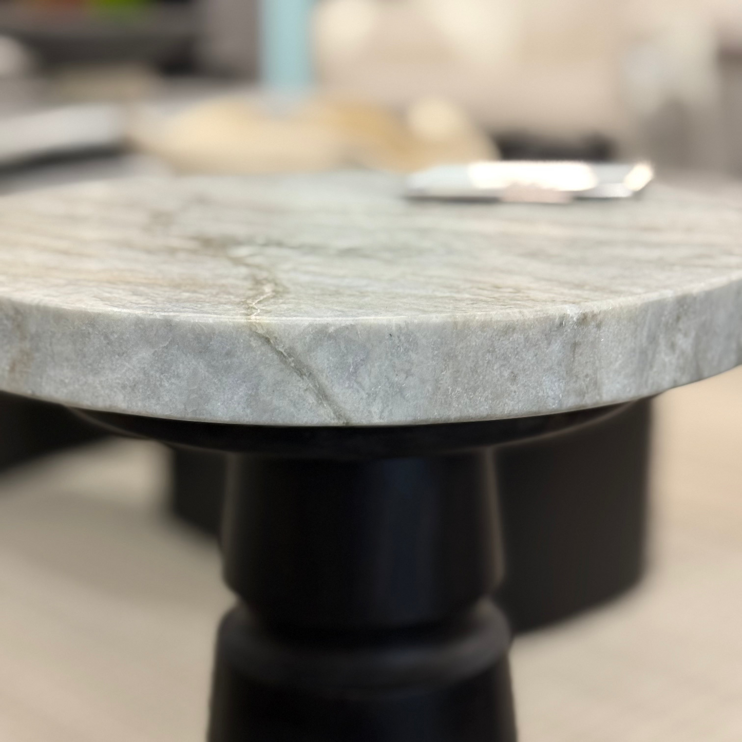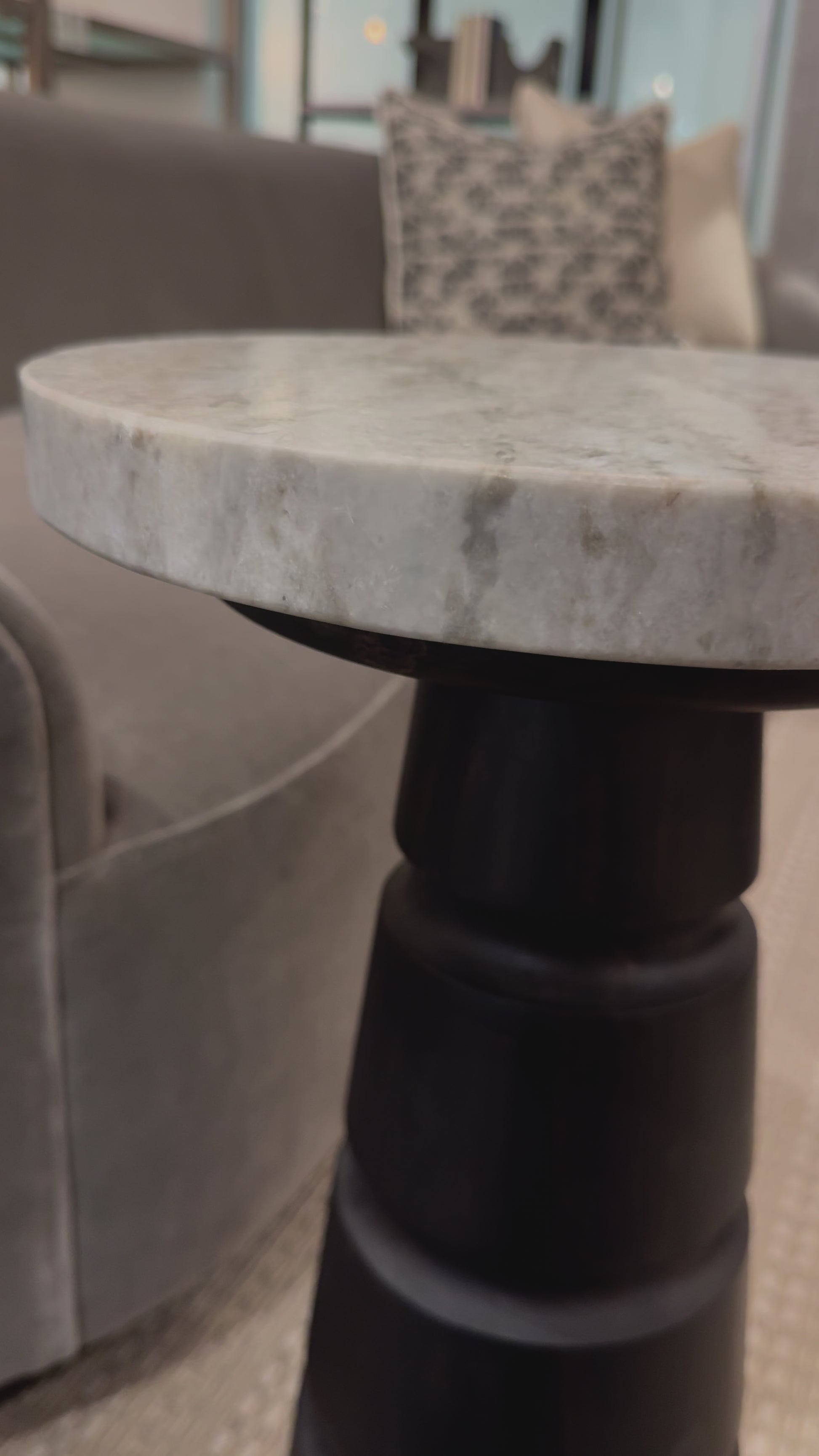 Arteriors Home's Imani Drink Table combines Toronto leathered marble with sable mango wood, creating a modernist silhouette with notched detailing. Its neutral palette and graduated stacked form make it an essential accent piece for contemporary interiors.