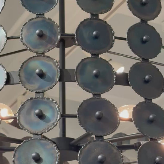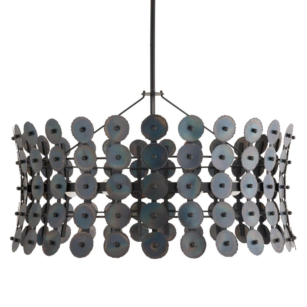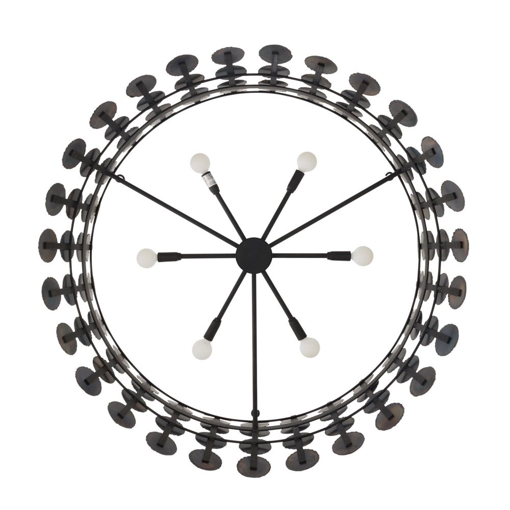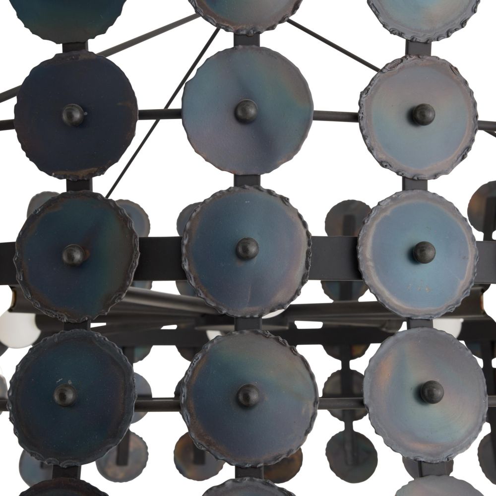 The Imperia Chandelier in Burnt Iron by Arteriors Home features a symmetrical circle pattern and an hourglass shape, enhanced by hand-torched details and suspended from a matching iron pipe.