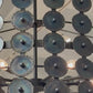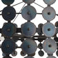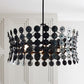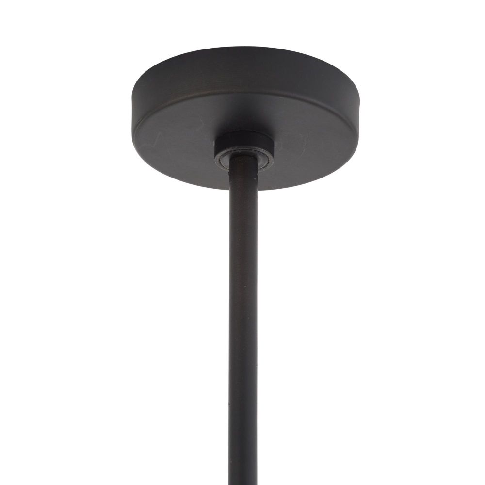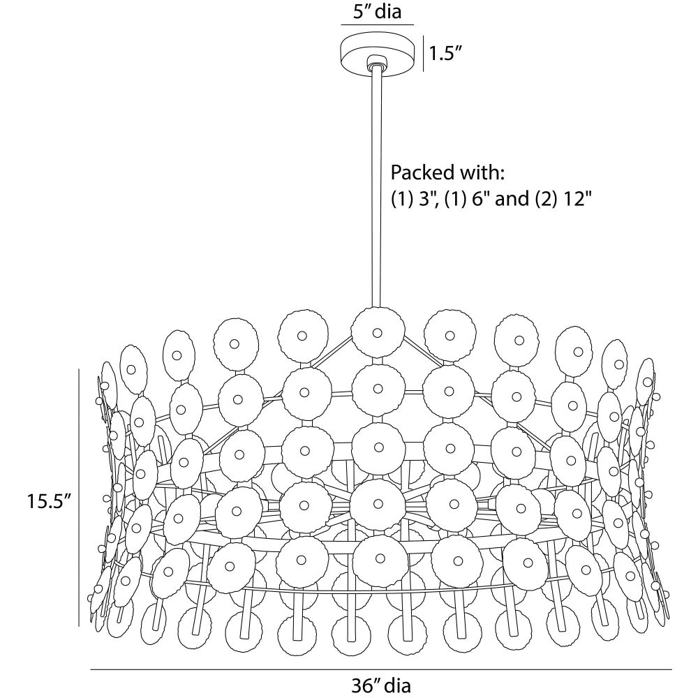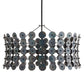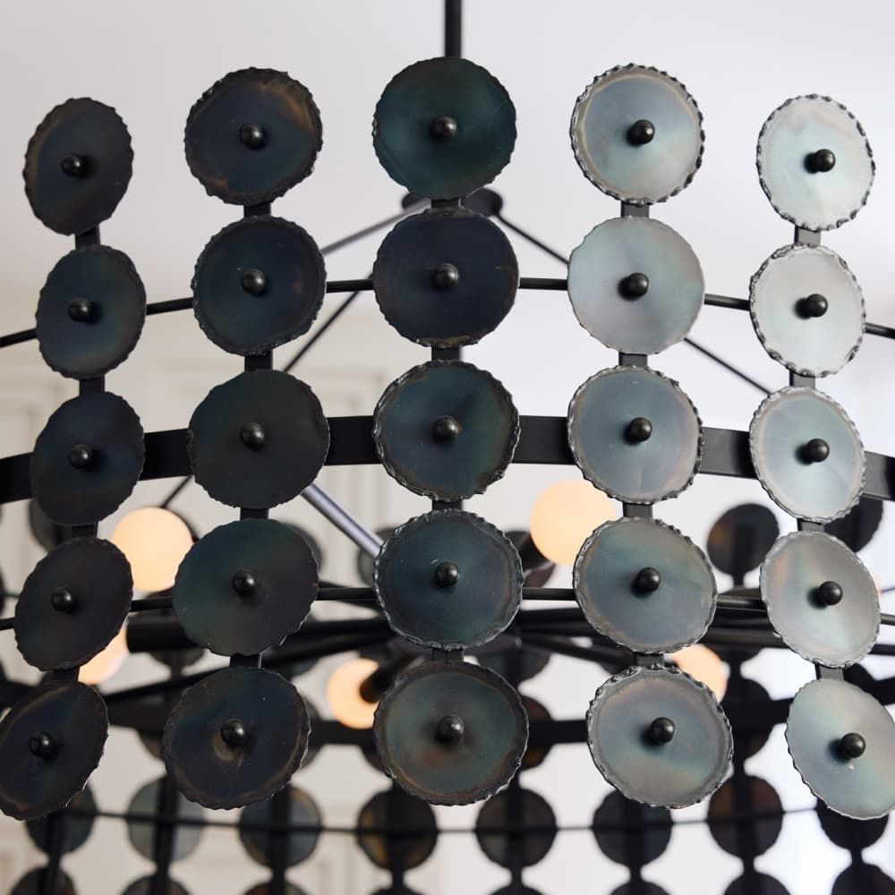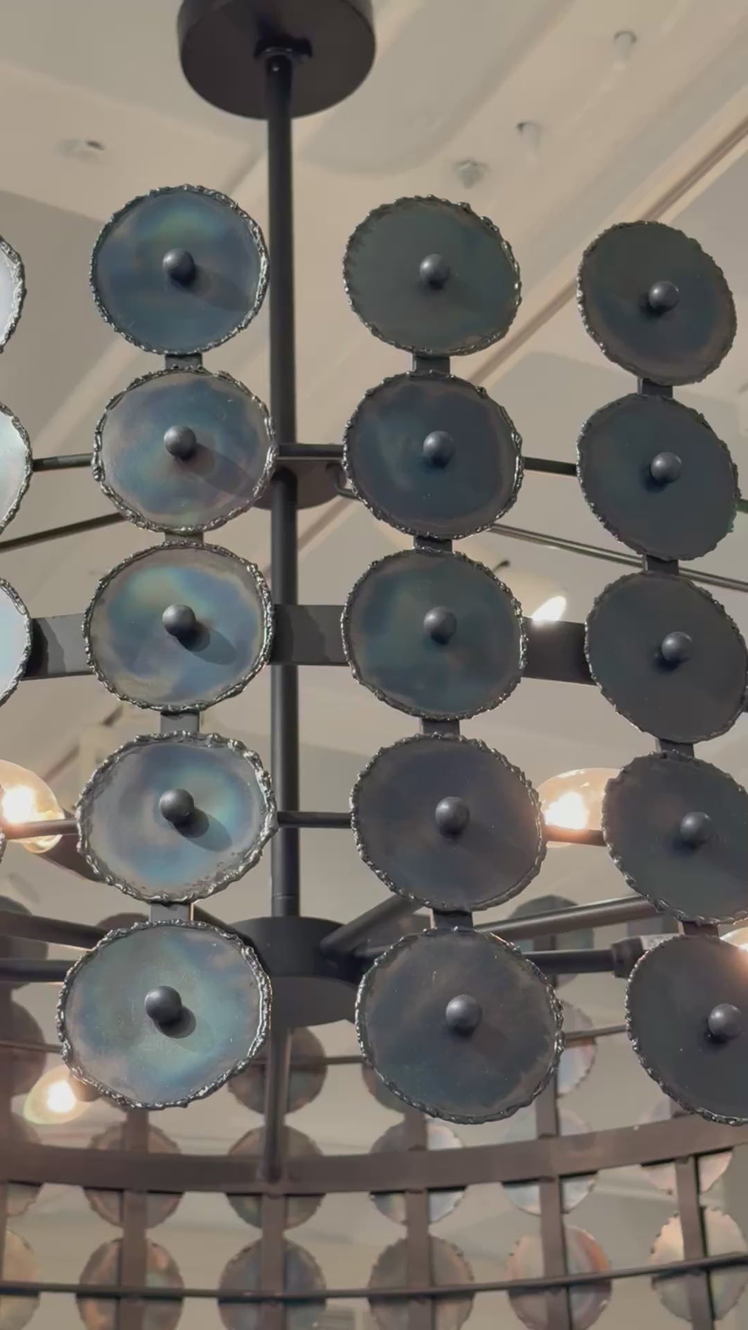 The Imperia Chandelier in Burnt Iron by Arteriors Home features a symmetrical circle pattern and an hourglass shape, enhanced by hand-torched details and suspended from a matching iron pipe.
