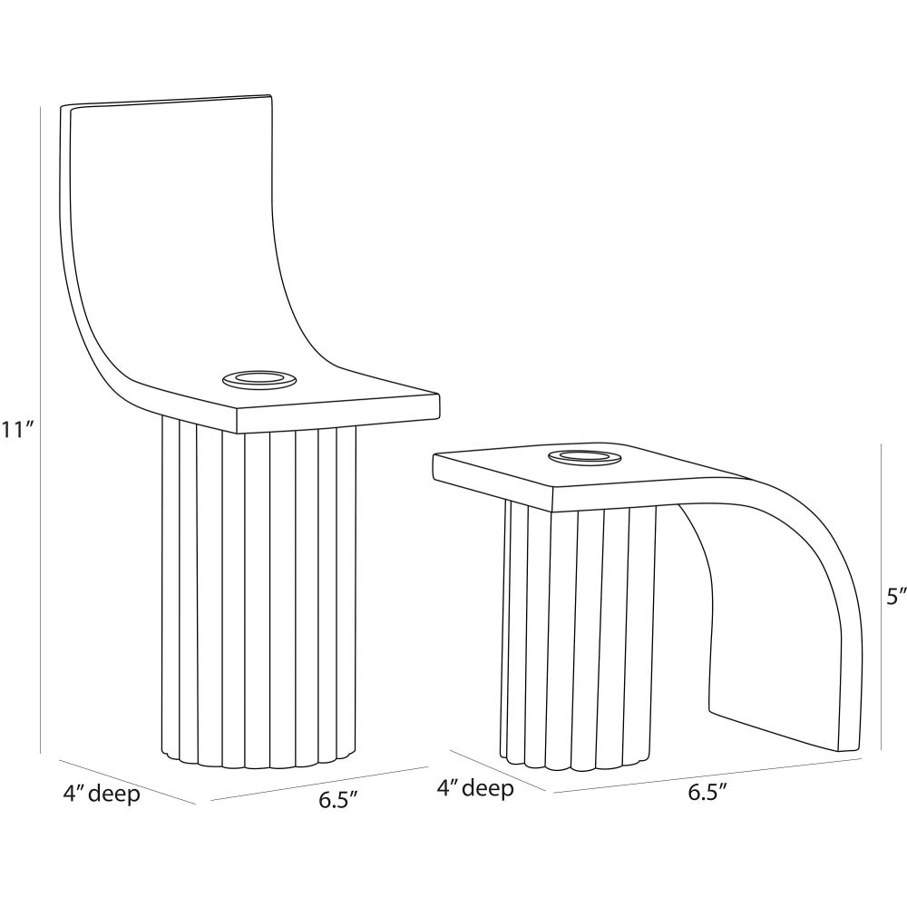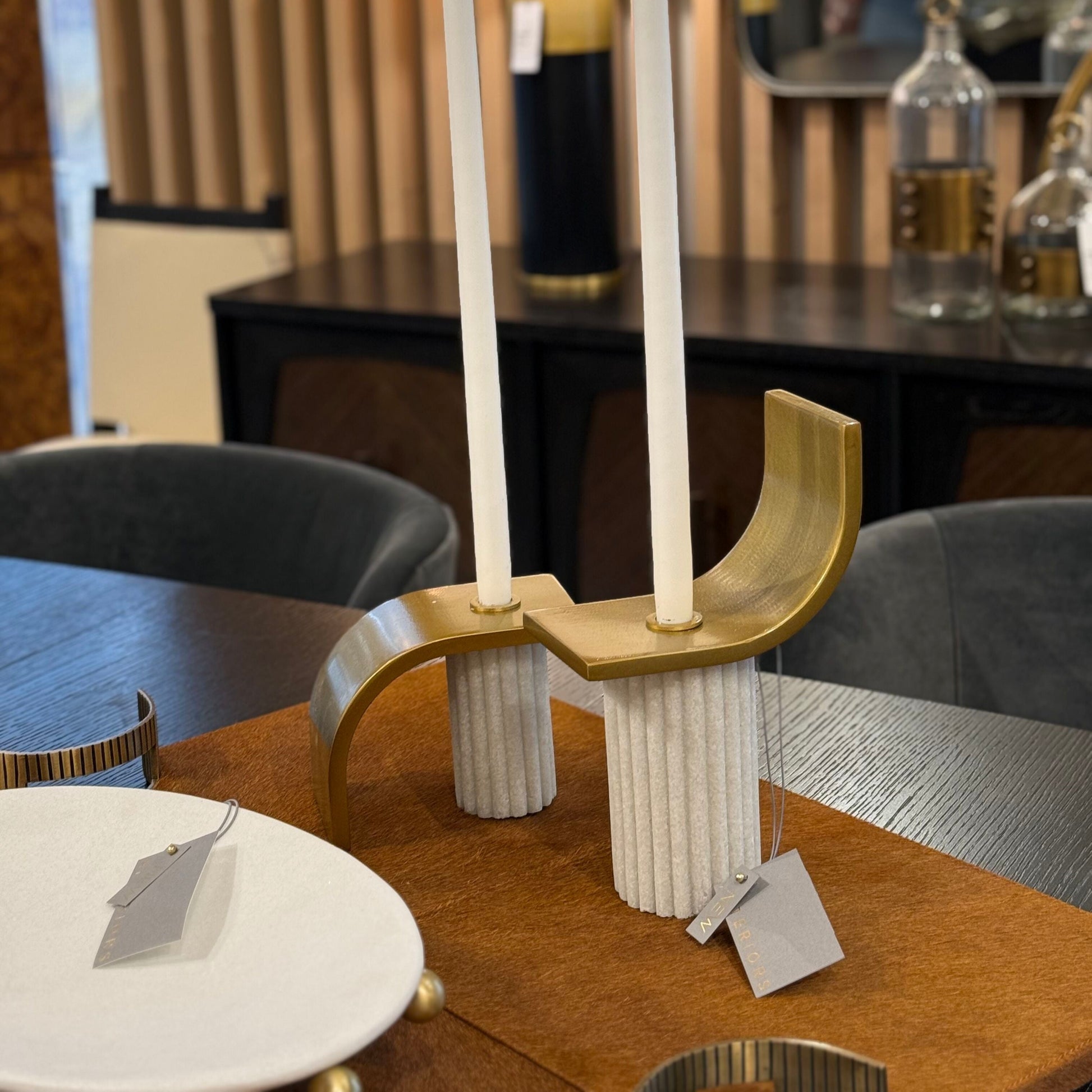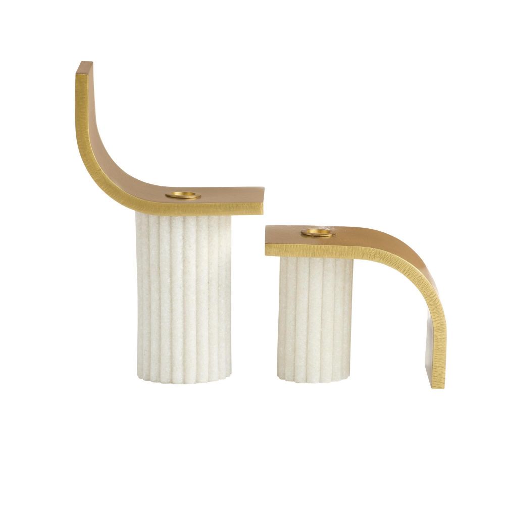 Arteriors Home's Ivanna Candleholders reimagine classical Greek architecture in ivory ricestone composite. This staggered pair features secure taper candle holders with contrasting antique brass accents that curve in opposite directions, creating visual intrigue when displayed together.