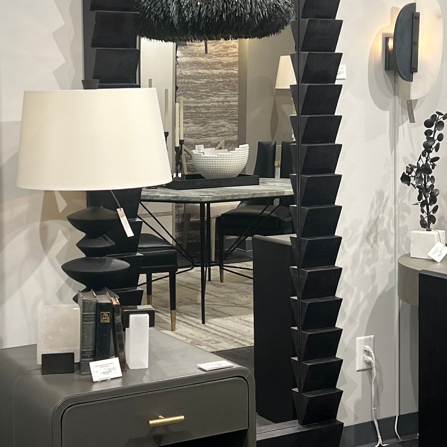 Sculptural art in functional form, the Jillian Lamp Charcoal in Lava Stone from Arteriors Home showcases an undulating formation of asymmetrical discs. The porous surface delivers a subtle texture, especially when caught by an illuminated glow. Topped with an ivory microfiber shade and matching lava stone finial.