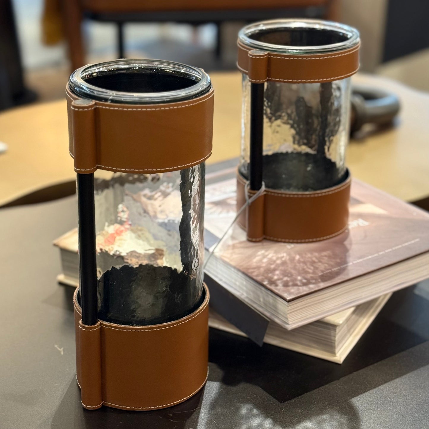 The Joseph Vases Set of 2 by Arteriors Home features clear hammered glass vases framed in brown leather with bronze iron supports, arranged at varying heights for a refined equestrian-inspired look.