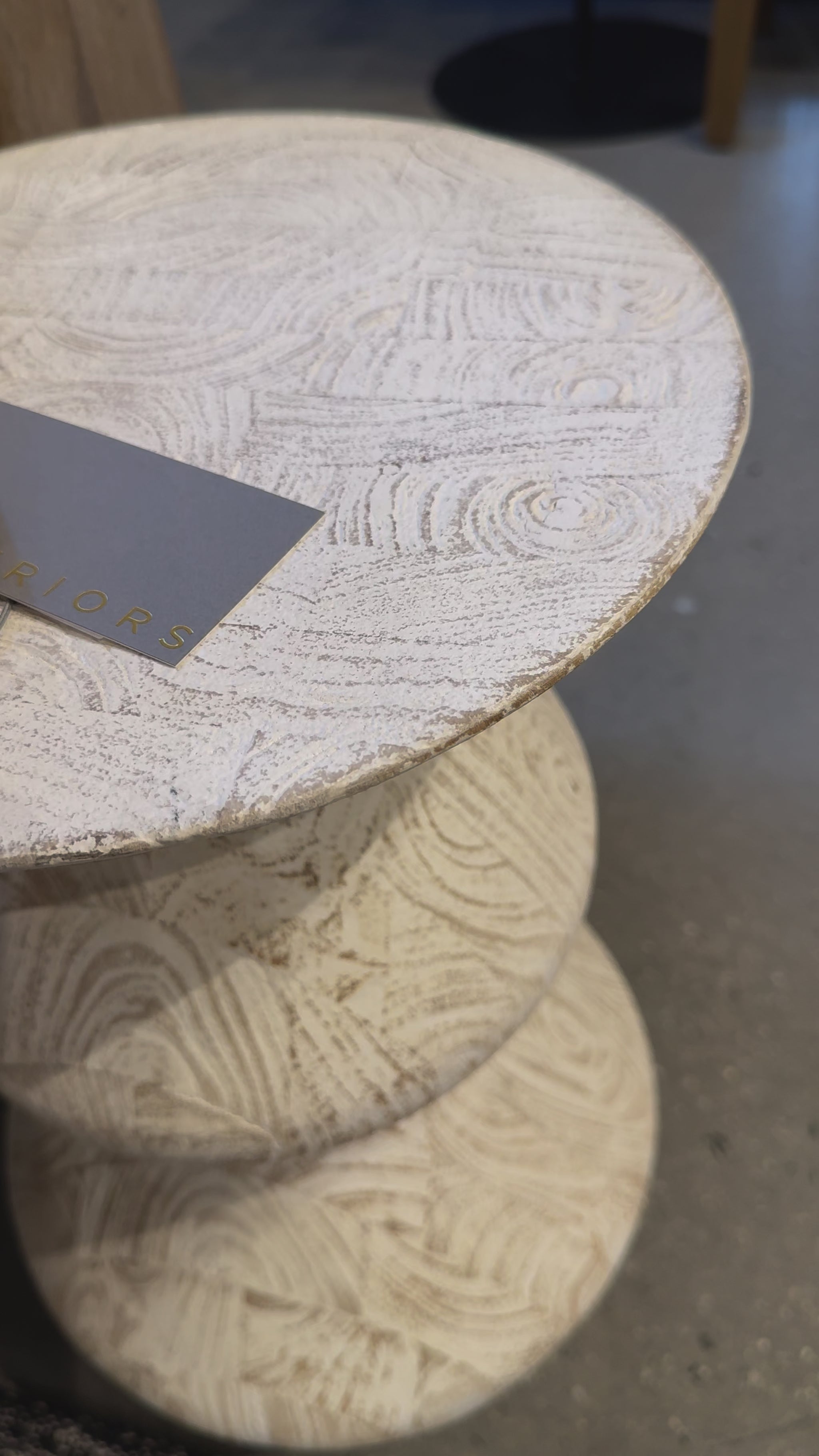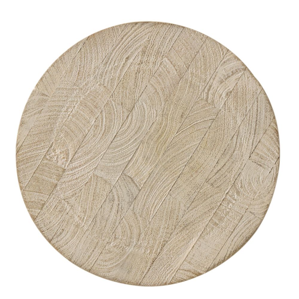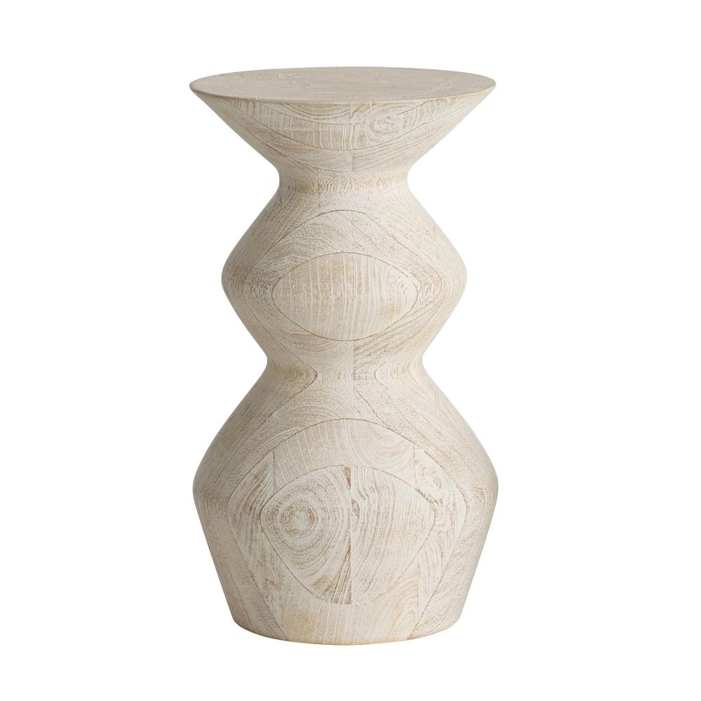 The Joyce Drink Table in Whitewash Mango Wood by Arteriors Home features elegant curves and carved side details, inspired by coastal wood sculptures, adding refined charm to any seating area.