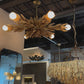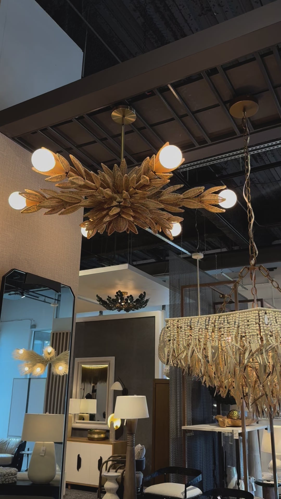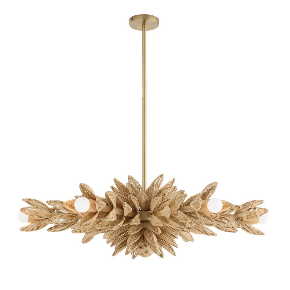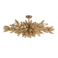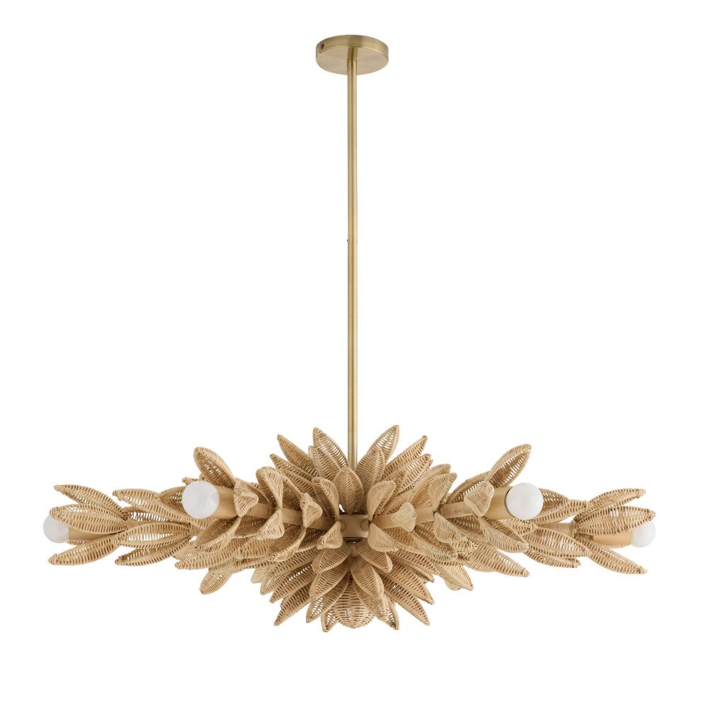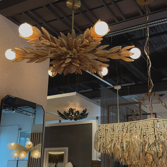 The Arteriors Home Kasai Semi Flush features hand-woven natural rattan leaves in botanical patterns, individually crafted for multi-dimensional appeal. Centered with a rattan orb and suspended from an antique brass canopy, this fixture provides comprehensive illumination throughout any space.