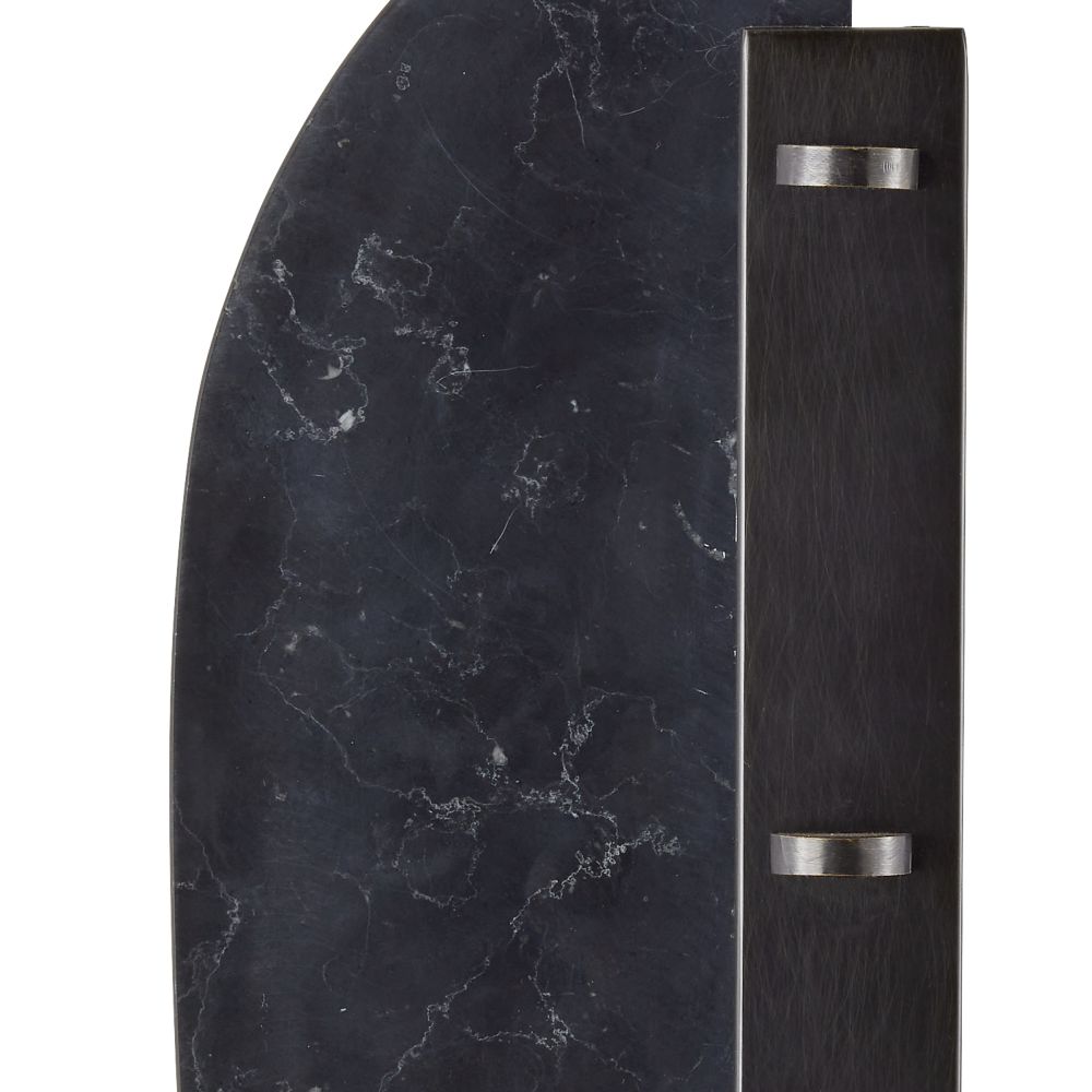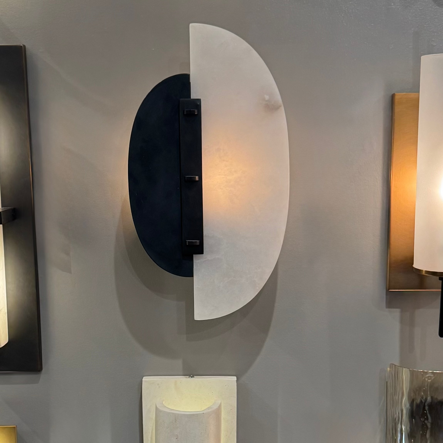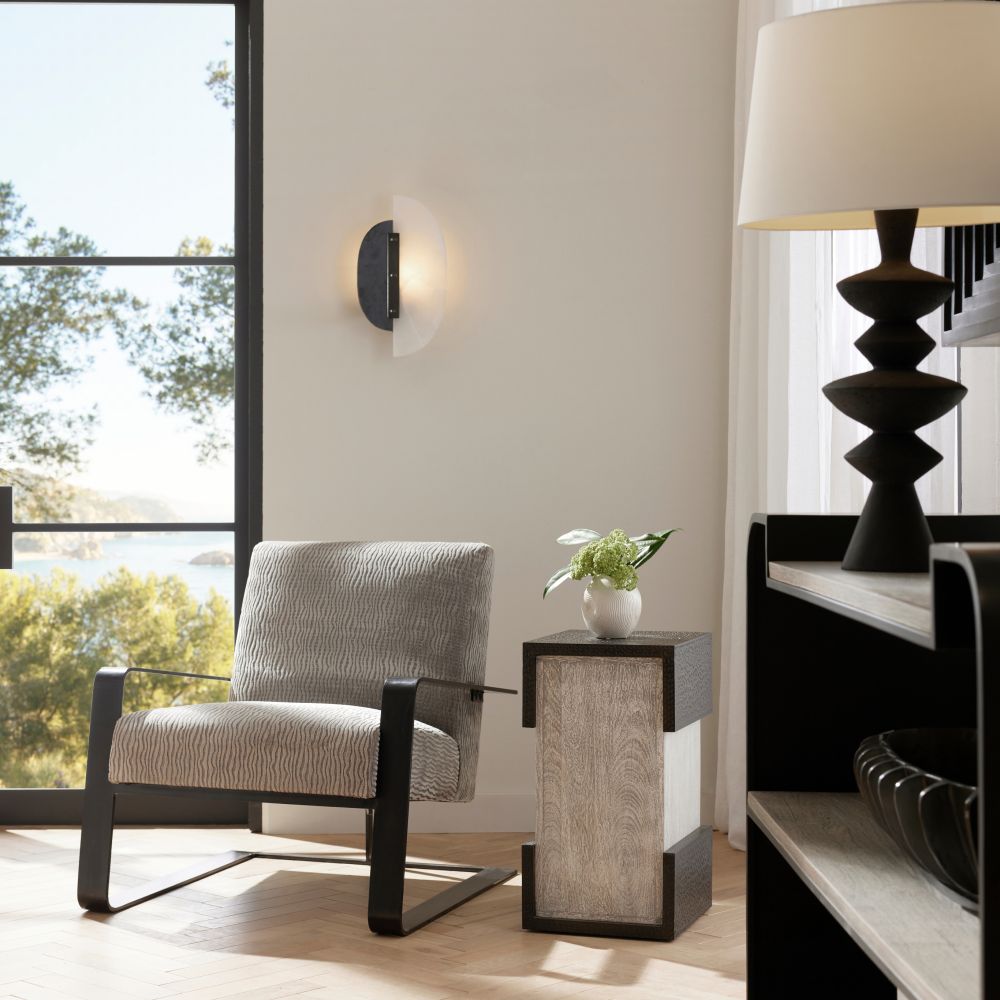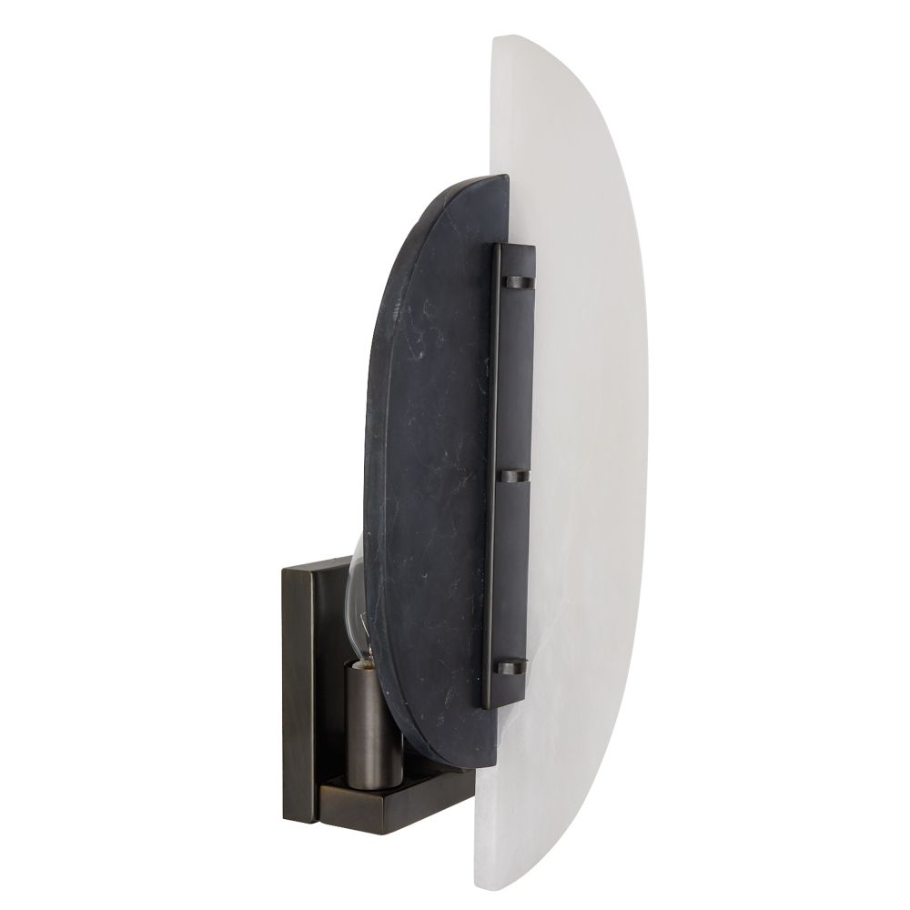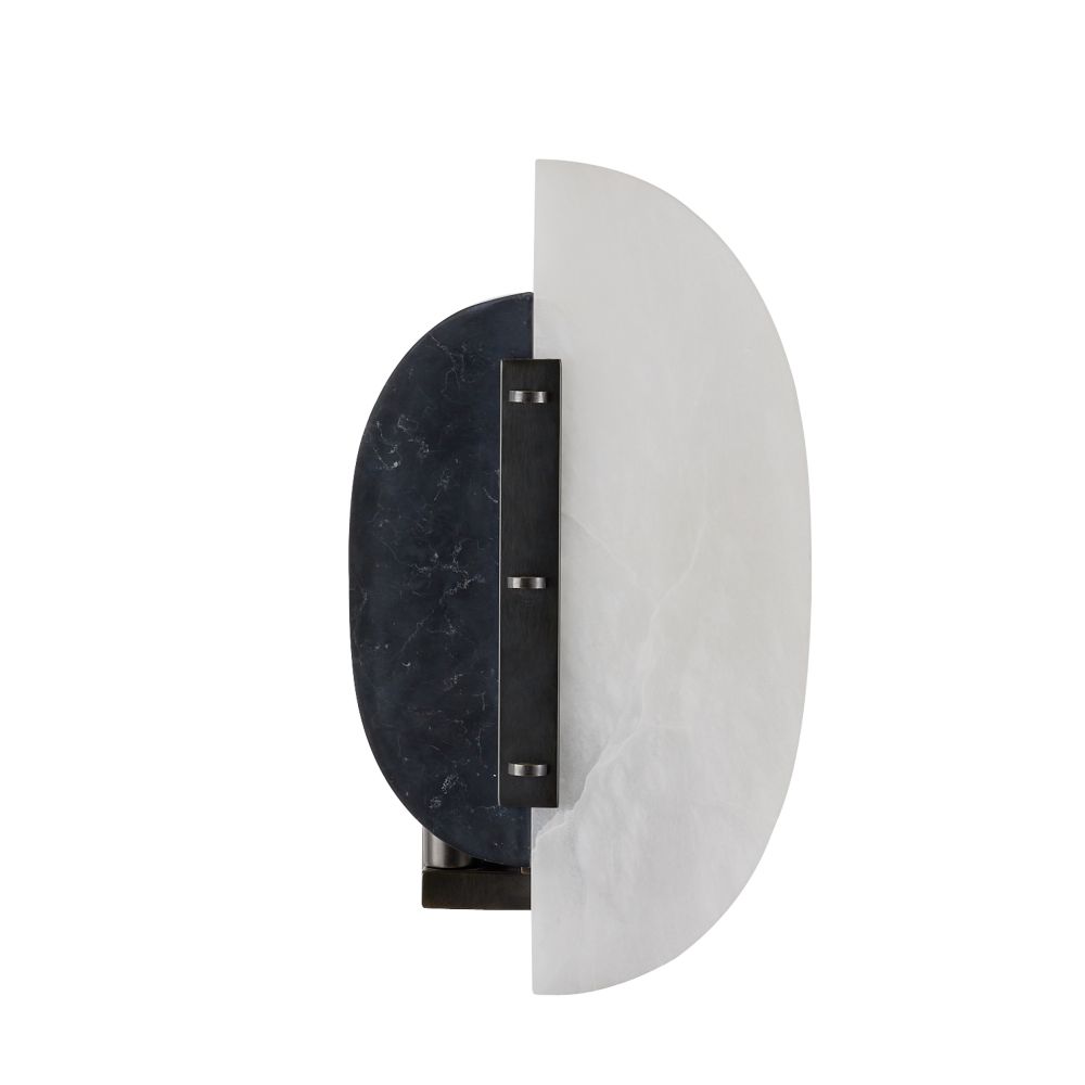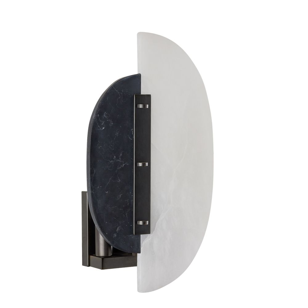 Crafted in alabaster overlaid with an asymmetrical plate of black marble, the Kianna Sconce in Alabaster and Marble from Arteriors Home delivers both style and function through artistic, architectural elements. Accented in english bronze steel.