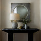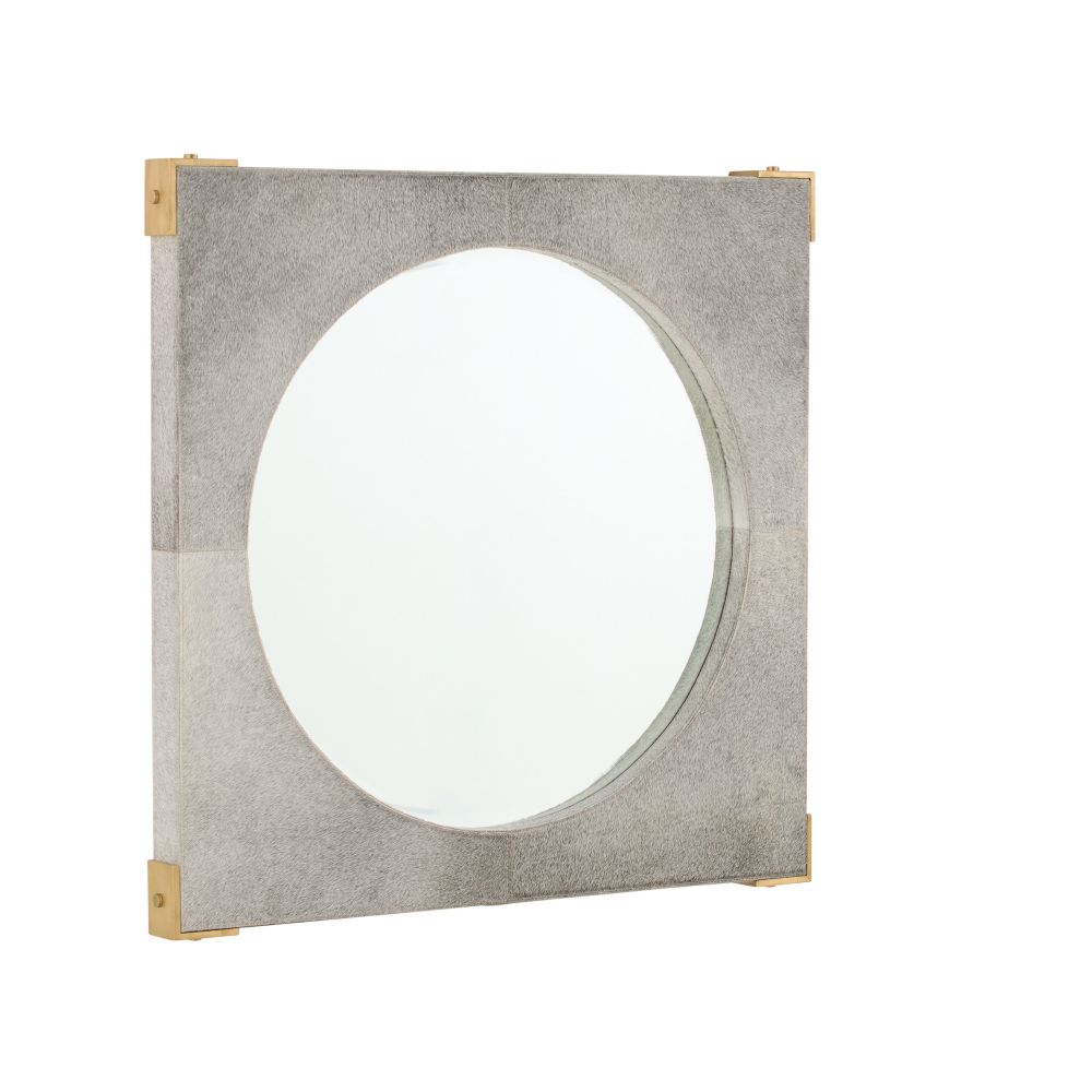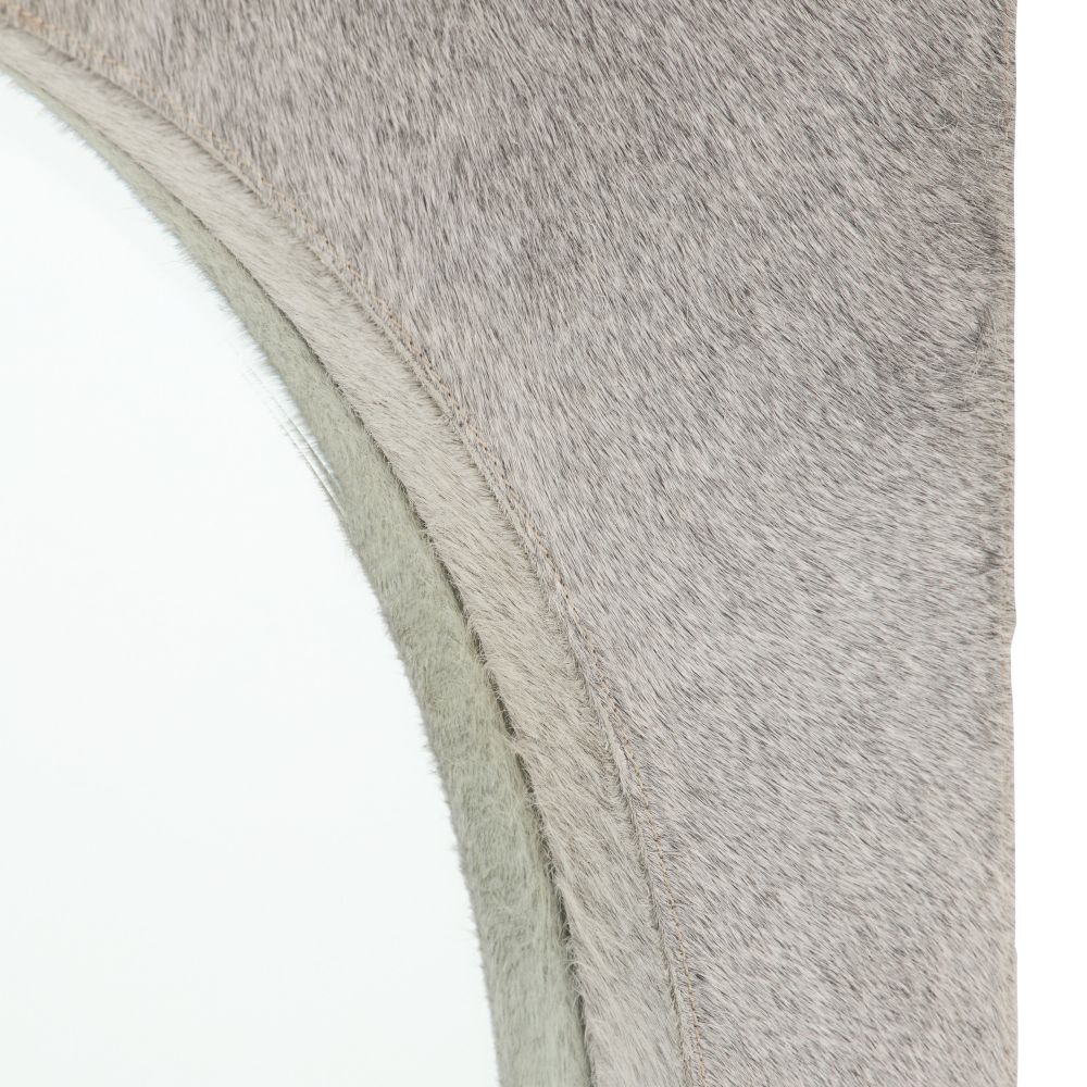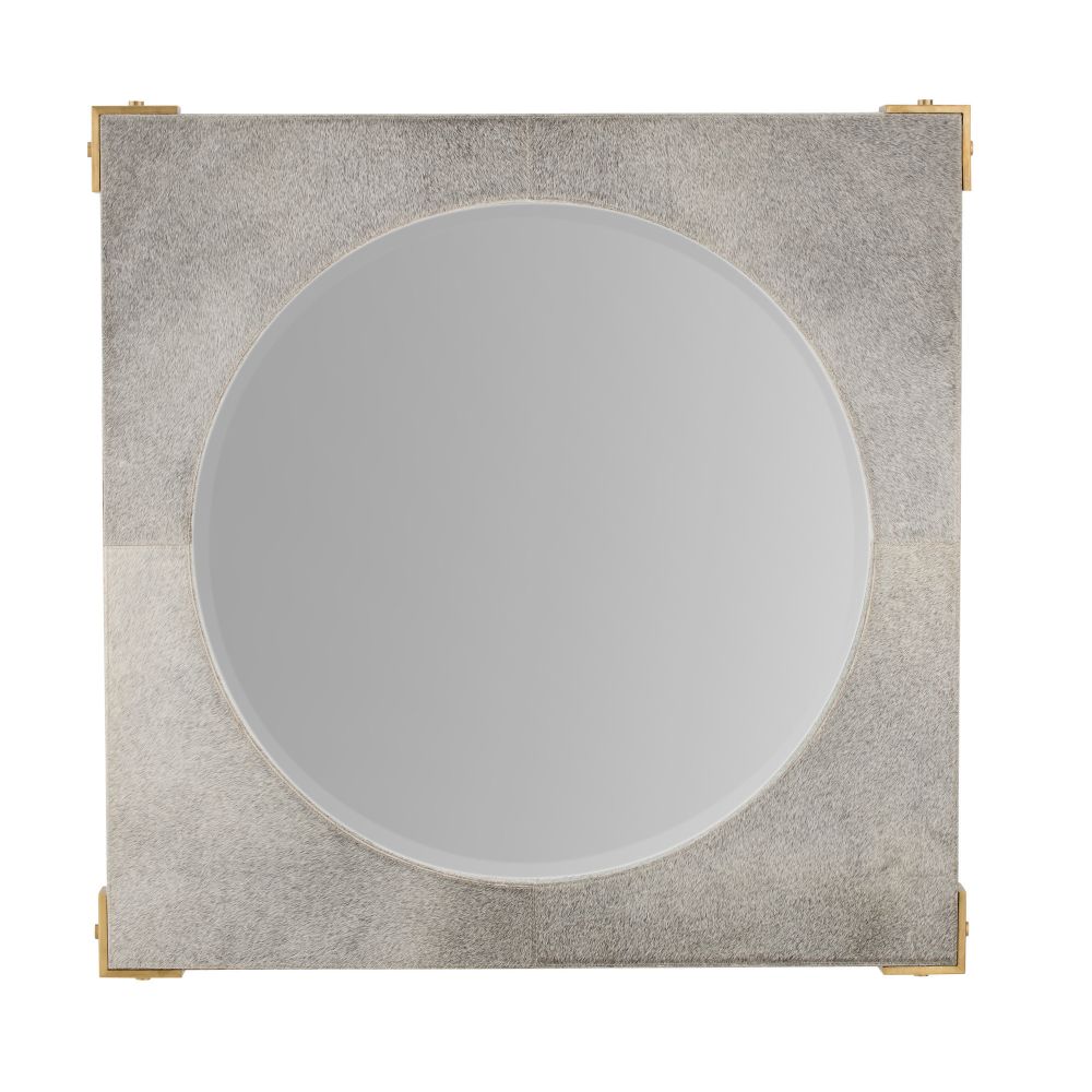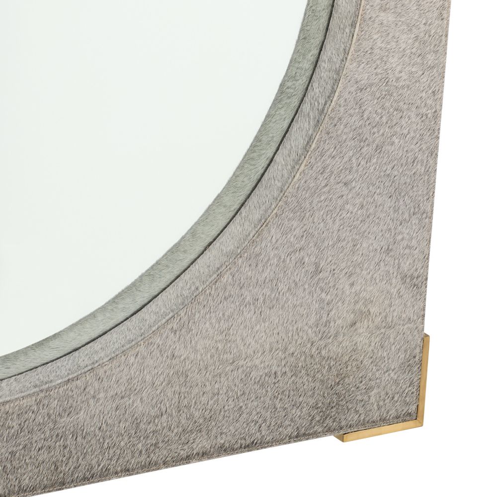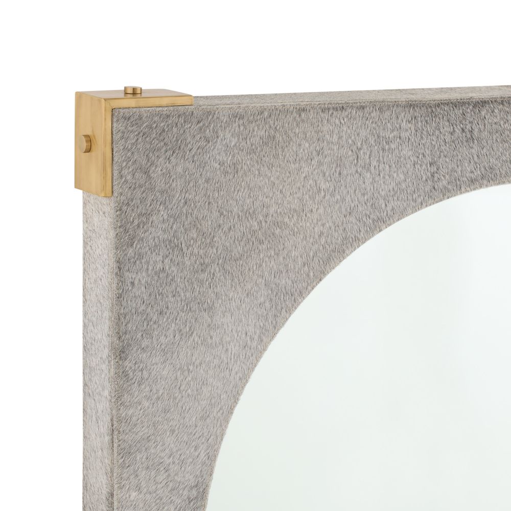 The Kristen Mirror in Gray Hair on Hide by Arteriors Home features textured gray hair-on-hide panels with unique tonal variations. Framed with antique brass accents, it surrounds a recessed beveled glass mirror. Designed for vertical hanging with included hardware.