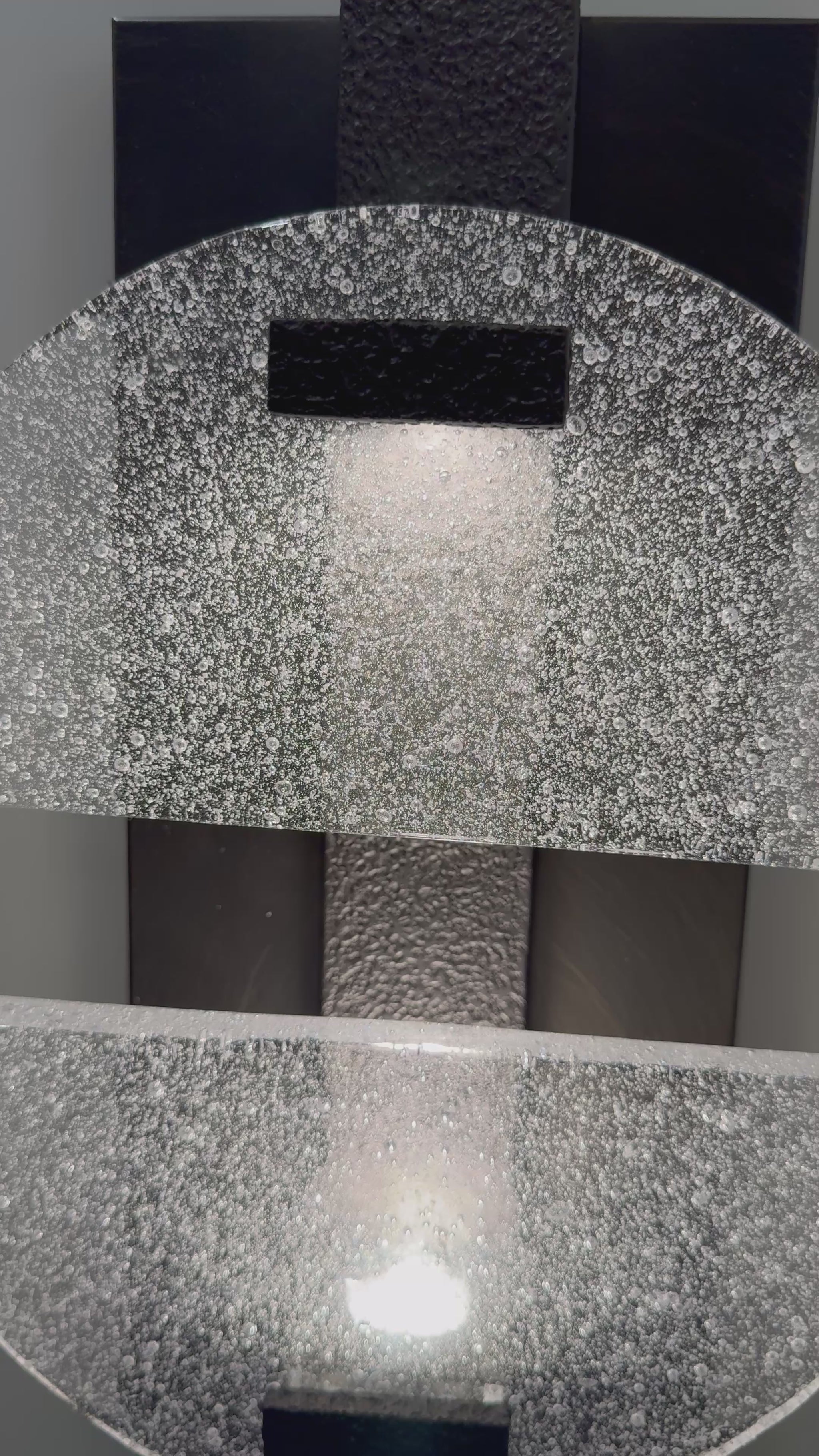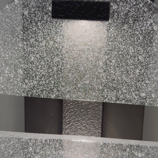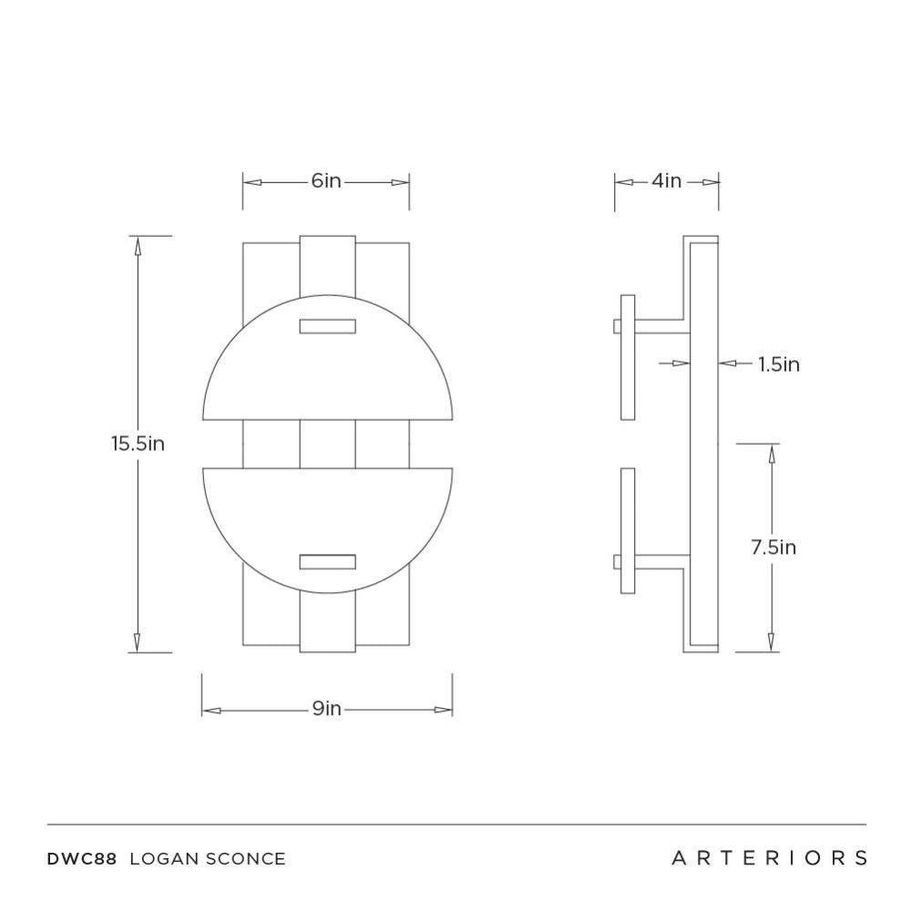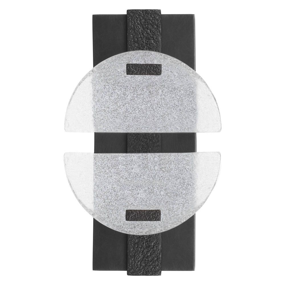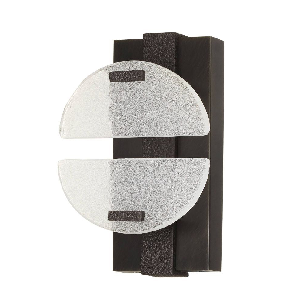 Logan Sconce in Seedy Glass by Arteriors Home captures lunar inspiration through stacked semi-circular segments of seeded slump glass mounted on a stepped English bronze-plated iron backplate. The geometric design disperses light elegantly across the wall, combining celestial aesthetics with refined metalwork.