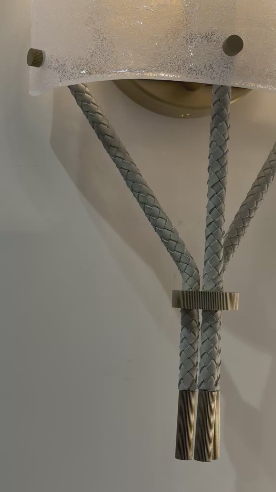 Braided bone leather suspension elements define the Lucien Sconce by Arteriors Home, a fixture that marries natural material with antique brass-plated steel. The seeded glass diffuser casts a soft, enveloping glow ideal for layered lighting in transitional spaces. Install as a singular statement or multiply for architectural presence in corridors, living areas, and intimate rooms.