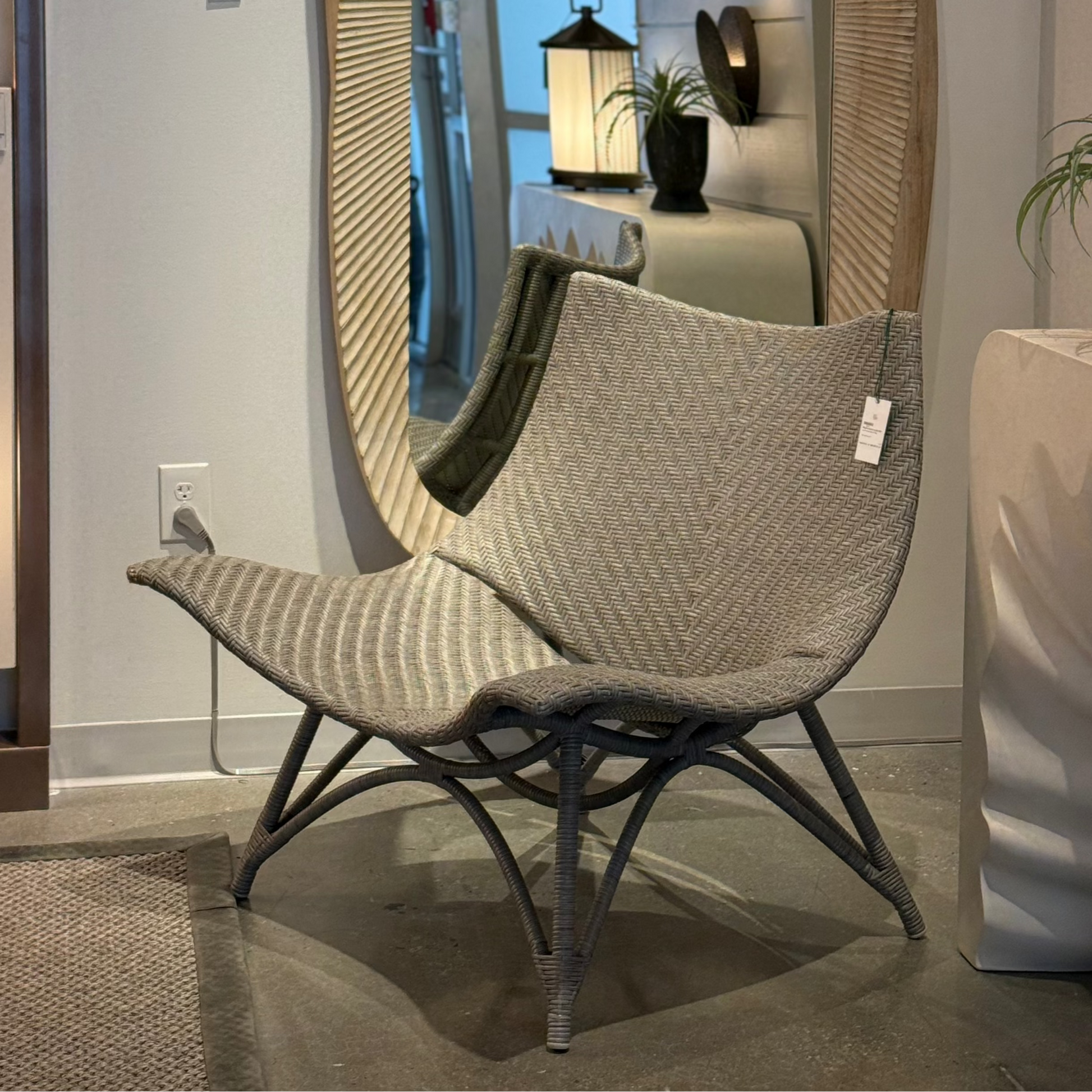 Crafted from gray synthetic rattan in a twill weave, the Margot Outdoor Lounge Chair by Arteriors Home is a stunning combination of style and comfort. With sleek planes and angular legs, it boasts a modern and distinctive design, and features a small opening between the seat and back to allow for drainage on rainy days.