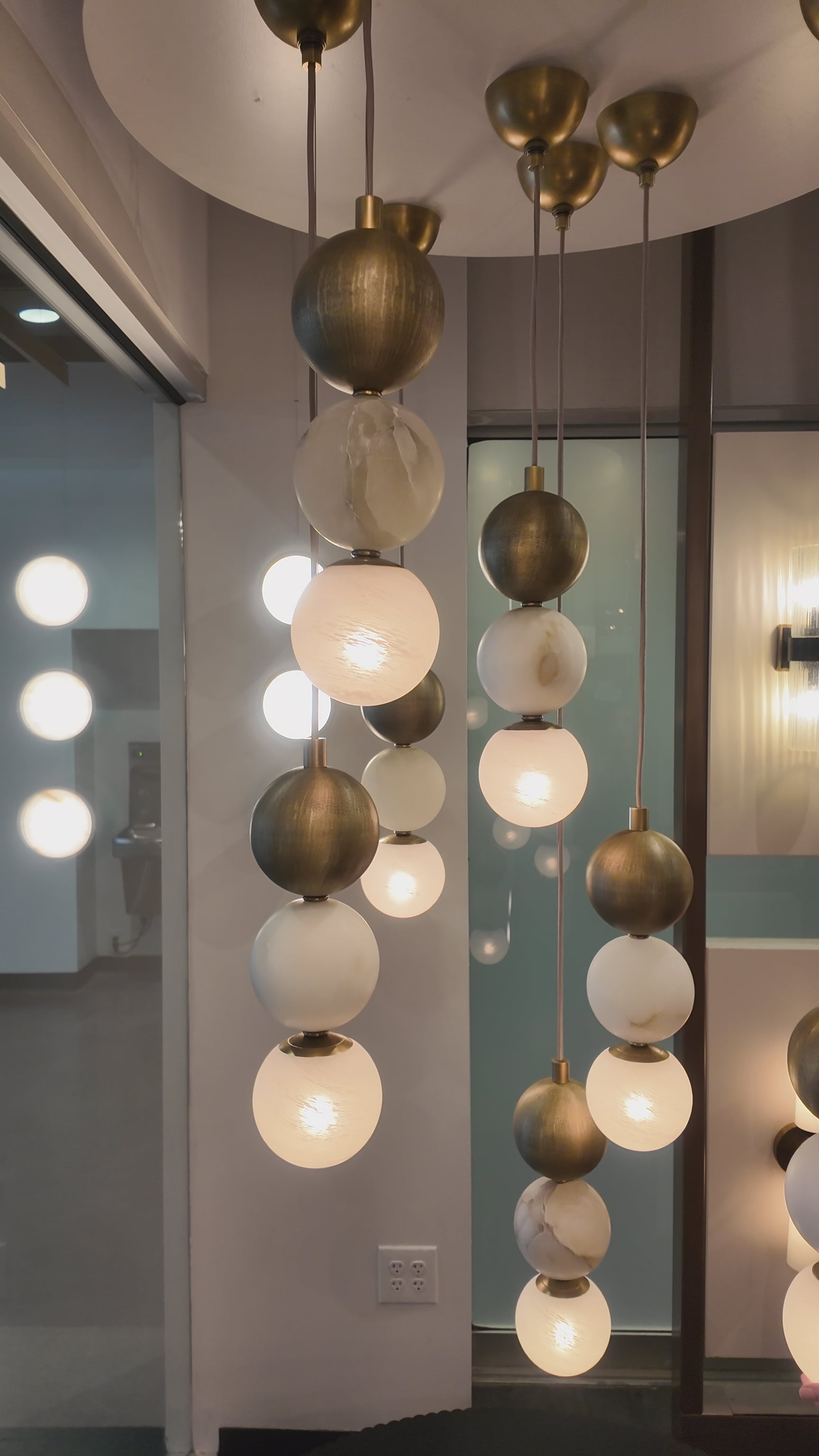 The Melody Pendant Matte Swirl by Arteriors Home combines antique brass-plated iron, white alabaster, and matte swirl glass in a stacked design, offering elegant texture and light. Perfect for small spaces and ideal for grouping.