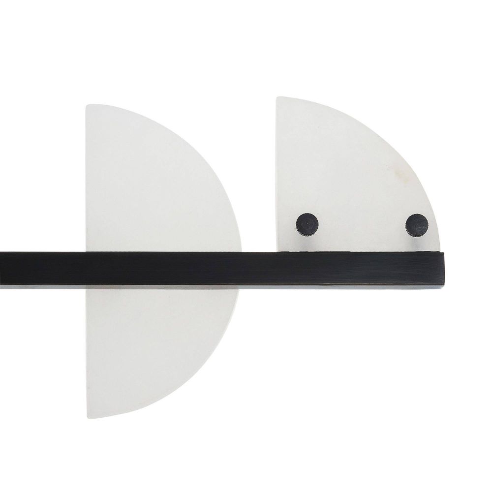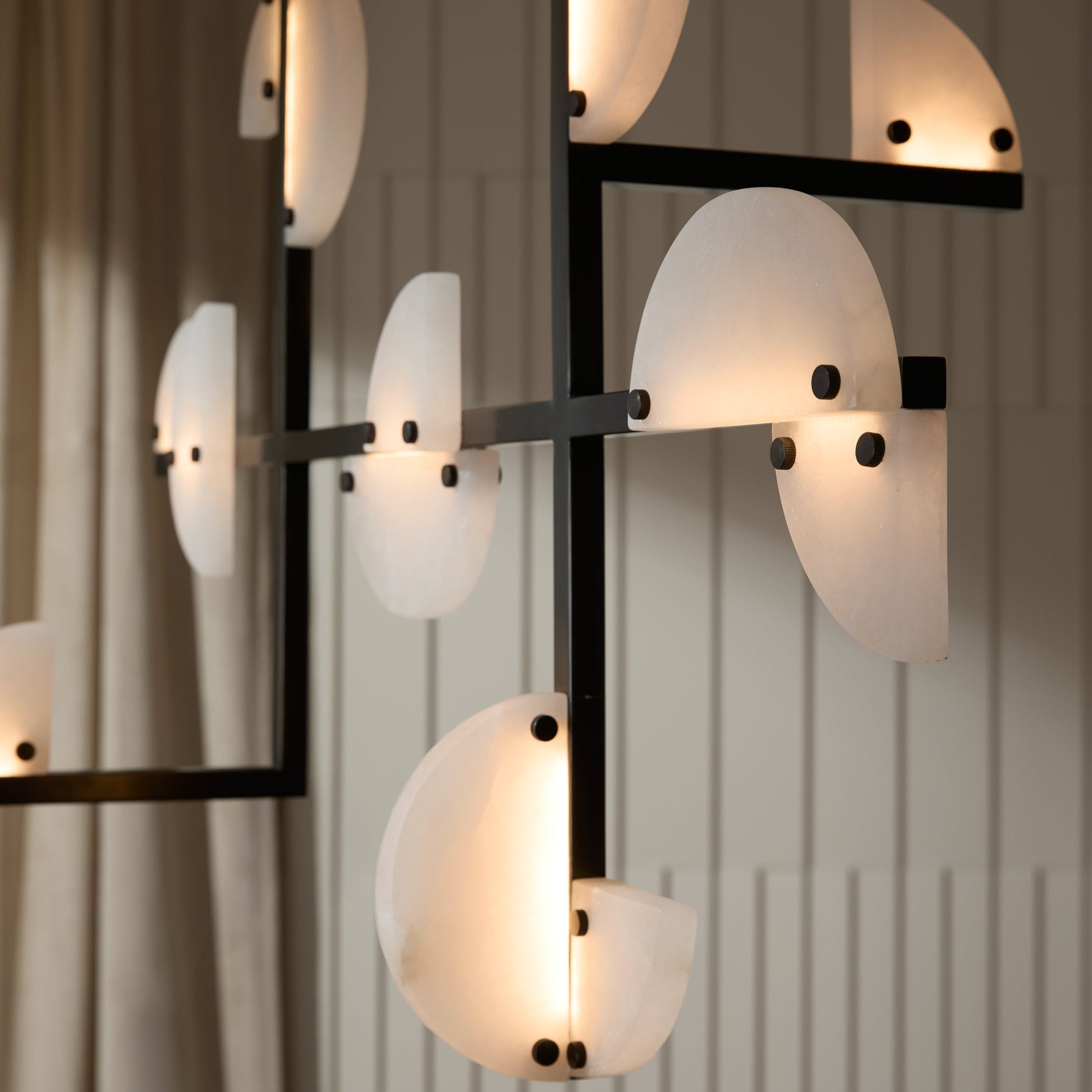 Drawing from lunar geometry, the Nova Alabaster Linear Chandelier by Arteriors Home pairs curved white alabaster segments with English bronze-plated iron rods. The alabaster discs emit a luminous, jewel-like radiance where they meet the metal framework, creating sophisticated visual depth. An expertly crafted LED fixture that elevates any interior with architectural refinement.