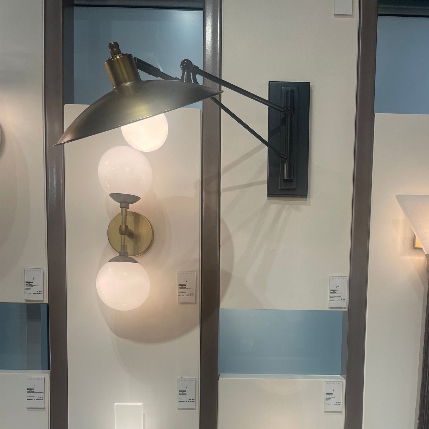 Made in stainless steel, the Nox Sconce in Bronze and Antique Brass from Arteriors Home features an antique brass exterior and a white painted interior. It is mounted on a 180-degree swivel arm and offers slight adjustability with its shade.