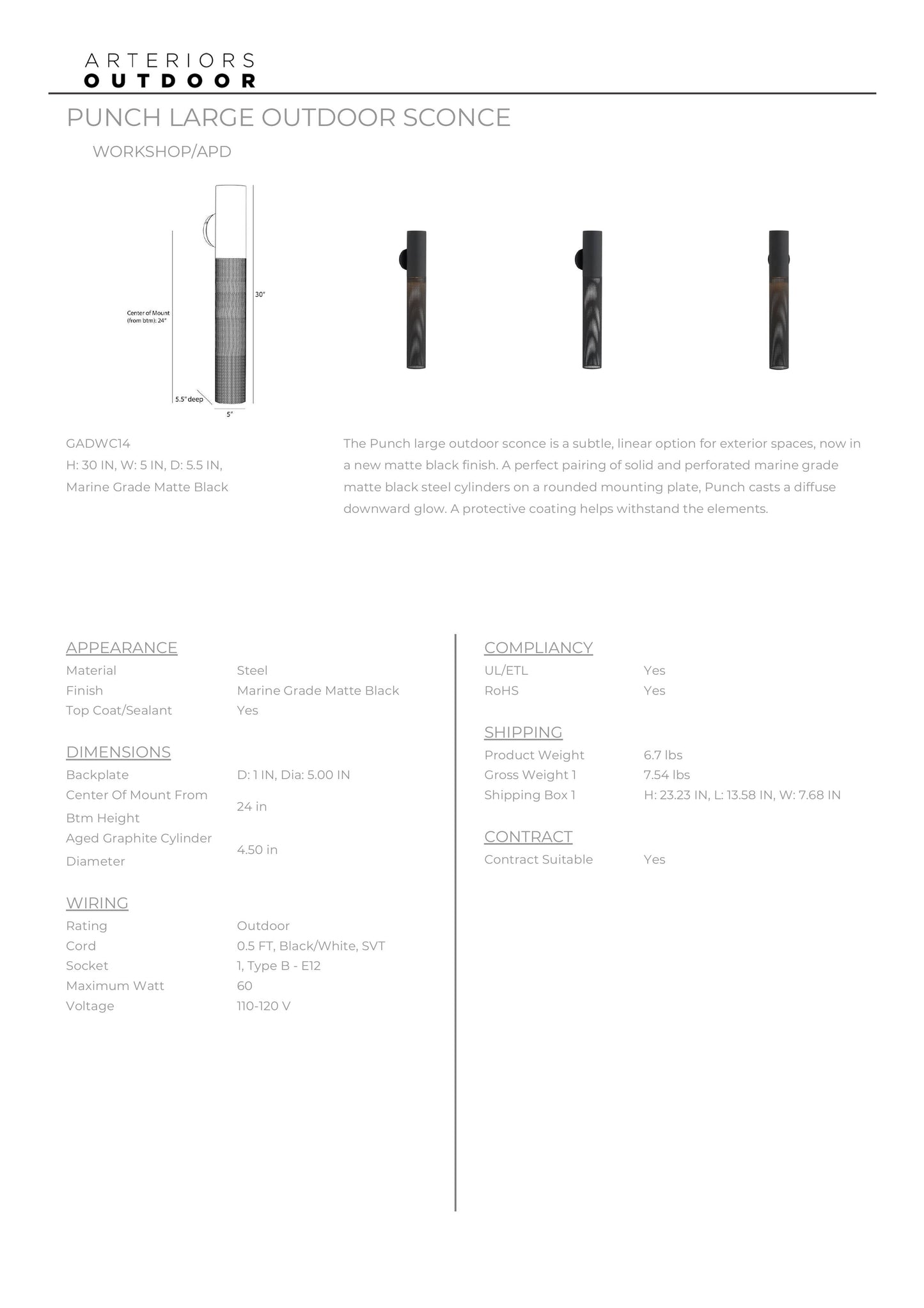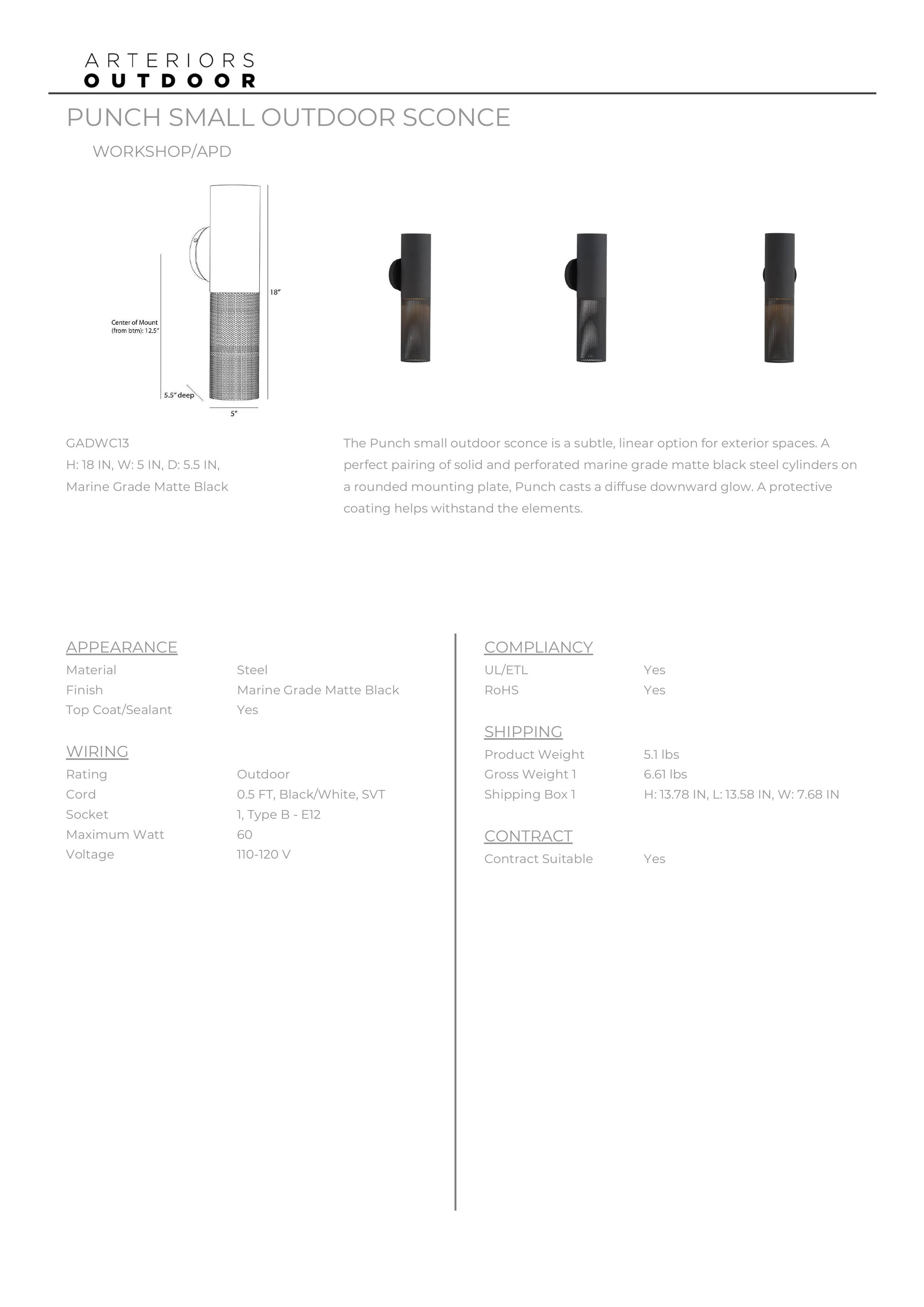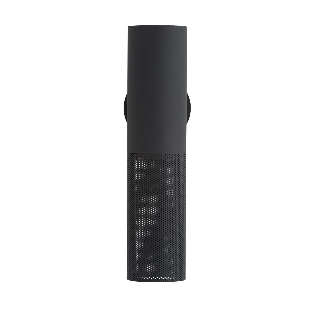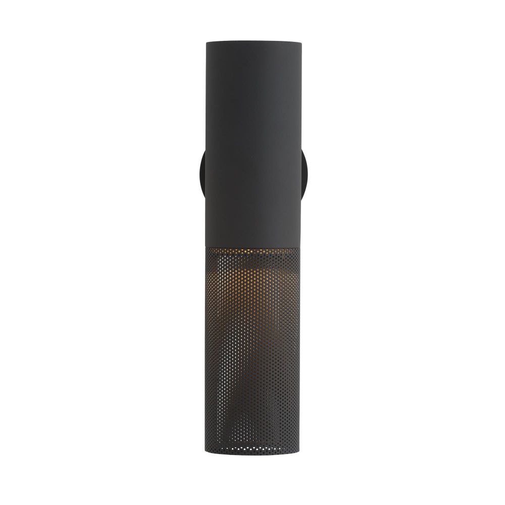 The Punch Outdoor Sconce in Matte Black by Arteriors Home is a subtle, linear option for exterior spaces. A perfect pairing of solid and perforated marine grade matte black steel cylinders on a rounded mounting plate, Punch casts a diffuse downward glow. A protective coating helps withstand the elements.