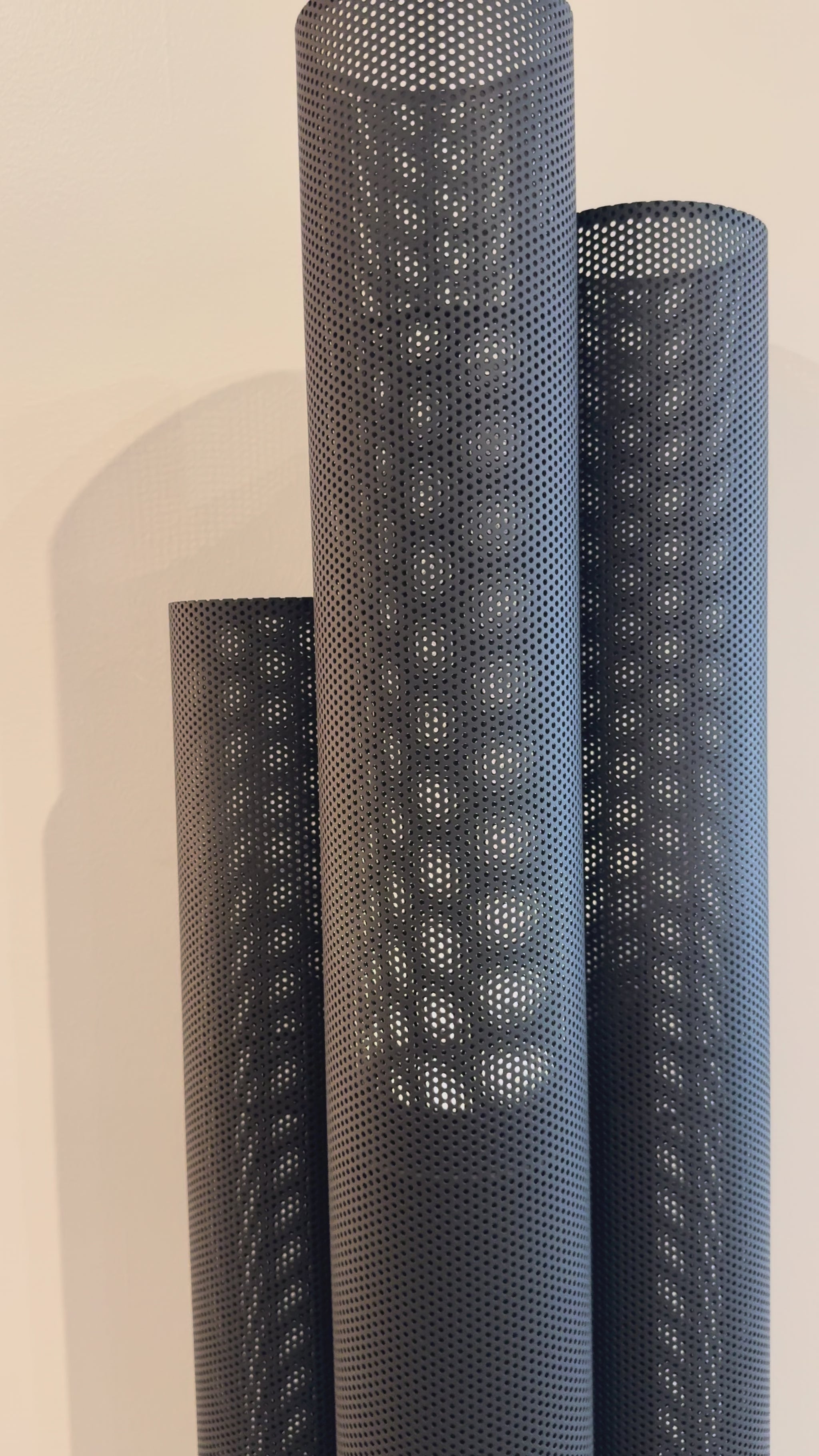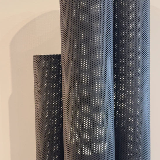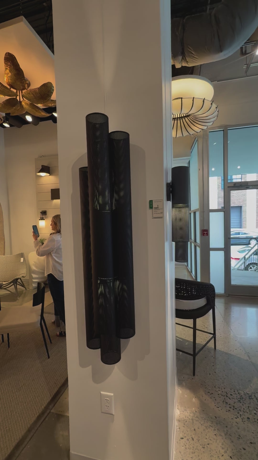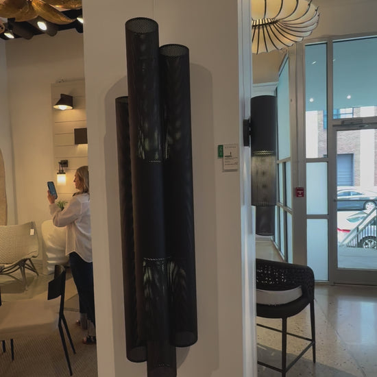 The Arteriors Home Punch Oversized Outdoor Sconce in Graphite is designed with three perforated marine grade aged graphite steel cylinders for enhanced illumination and elevated exterior spaces. Each cylinder includes bi-directional lights, emitting an upward and downward glow.