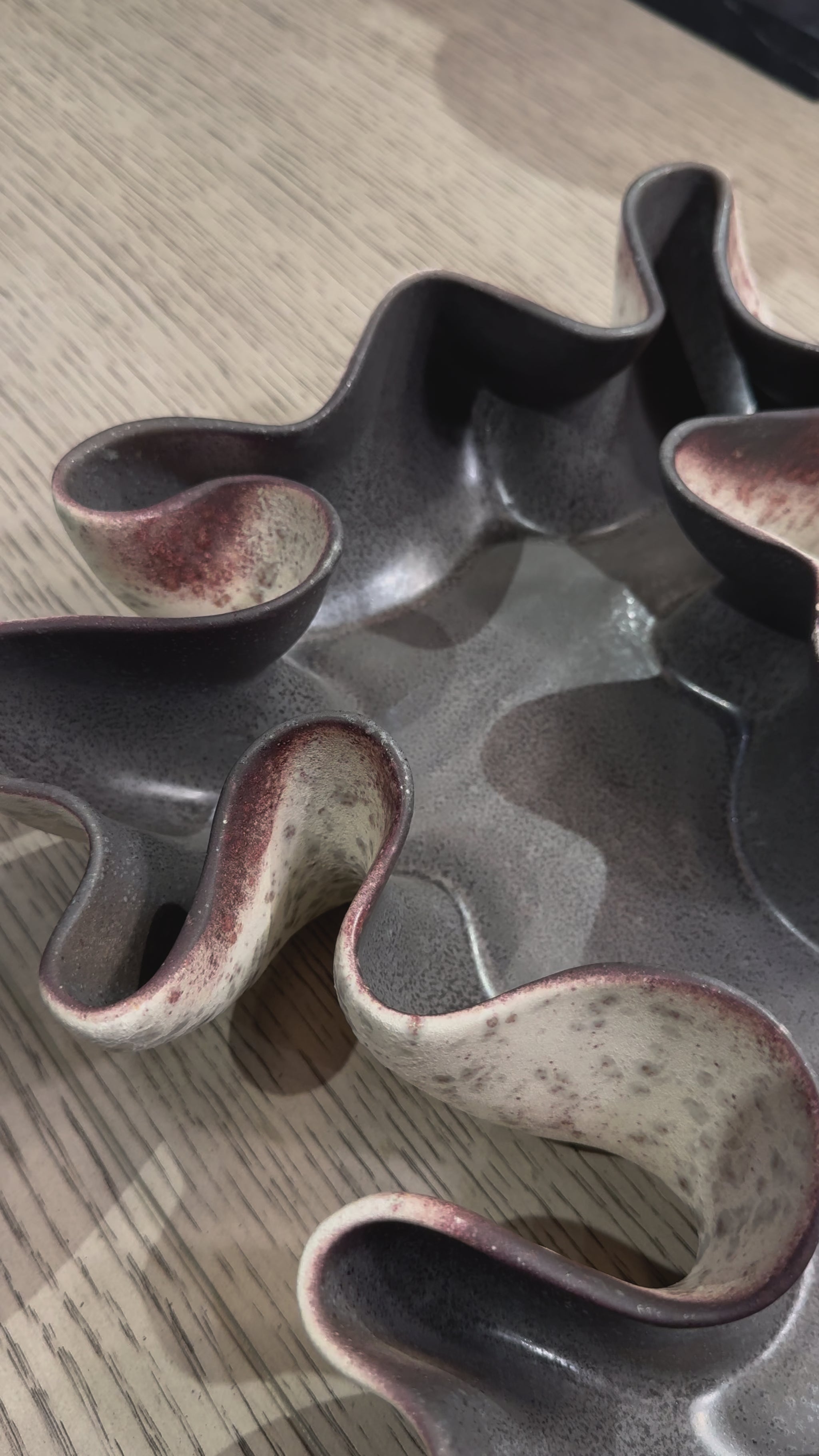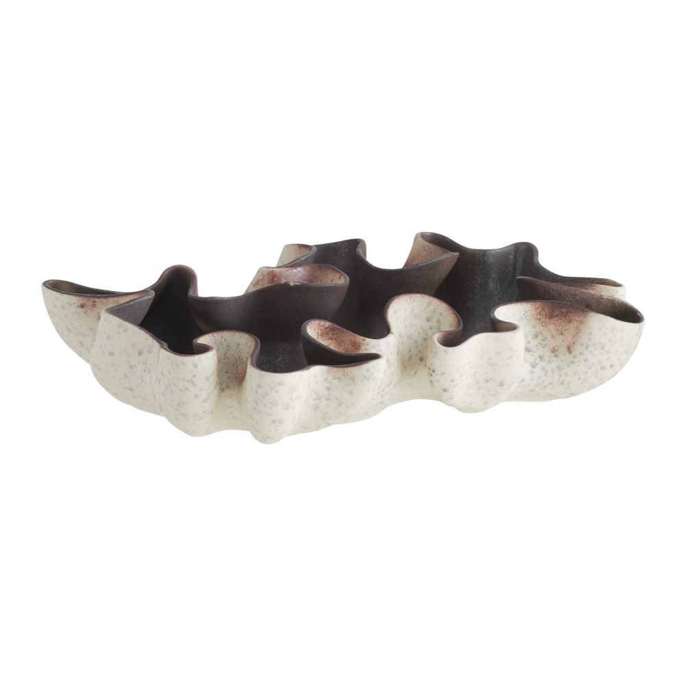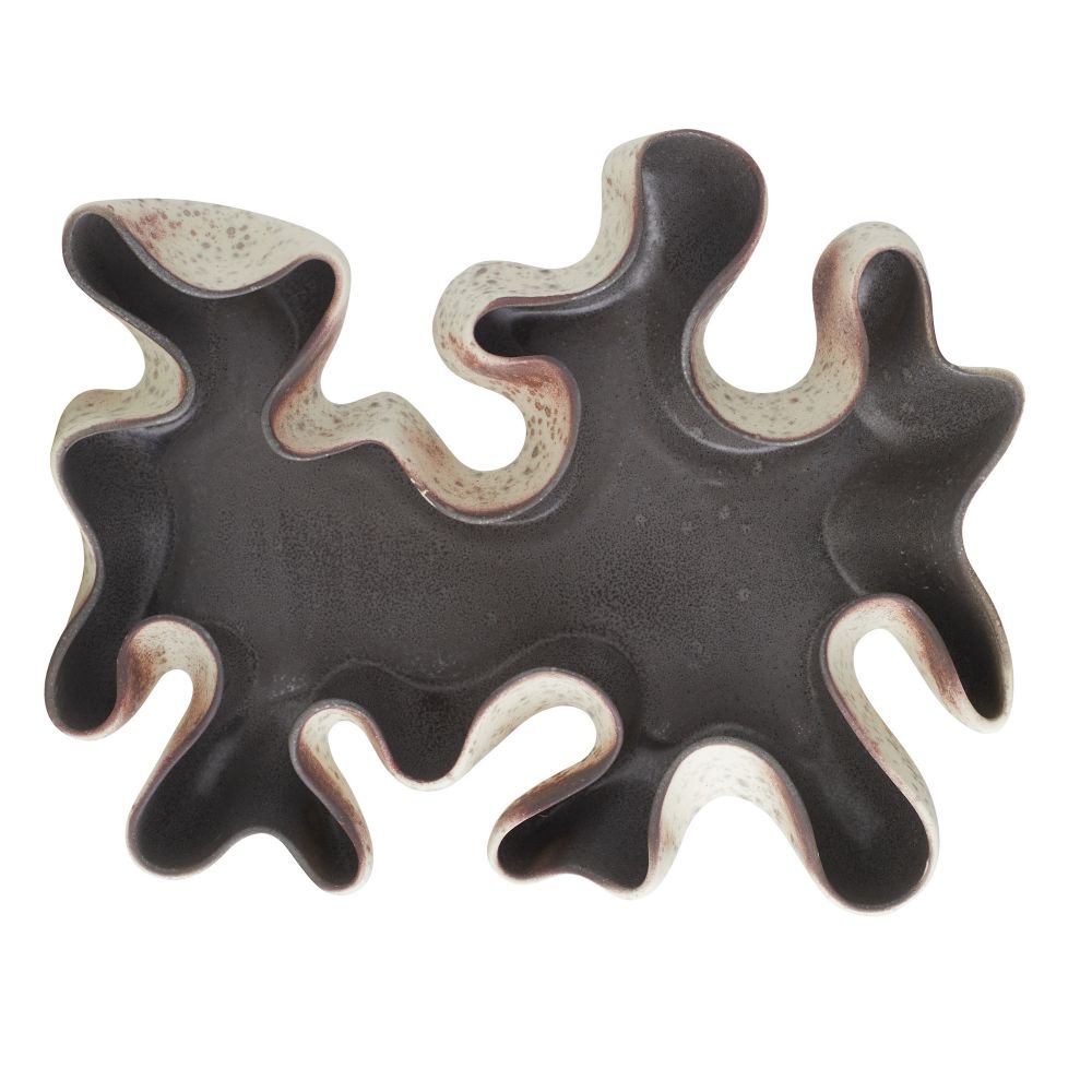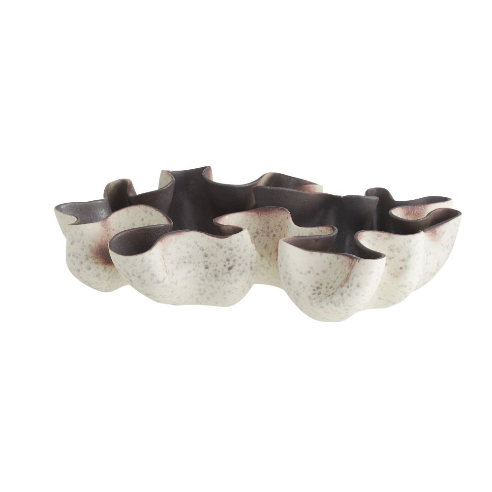 The Rontera Centerpiece in Porcelain by Arteriors Home features a freeform design inspired by branching coral. It is glazed in a new sparrow reactive shade with a gunmetal reactive interior, resulting in a stunning mix of hues and oxblood accents along each sinuous seam.