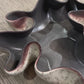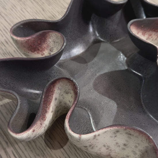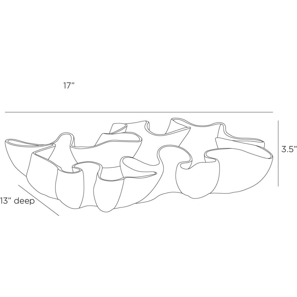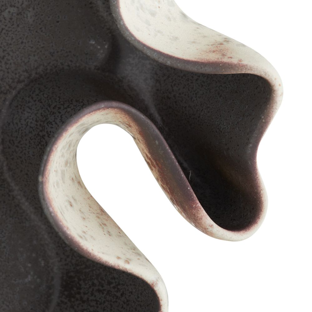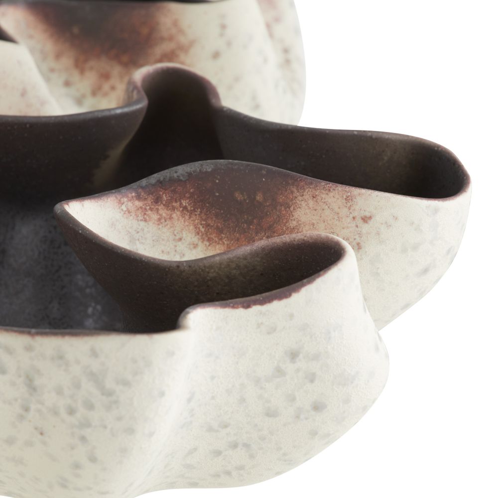 The Rontera Centerpiece in Porcelain by Arteriors Home features a freeform design inspired by branching coral. It is glazed in a new sparrow reactive shade with a gunmetal reactive interior, resulting in a stunning mix of hues and oxblood accents along each sinuous seam.
