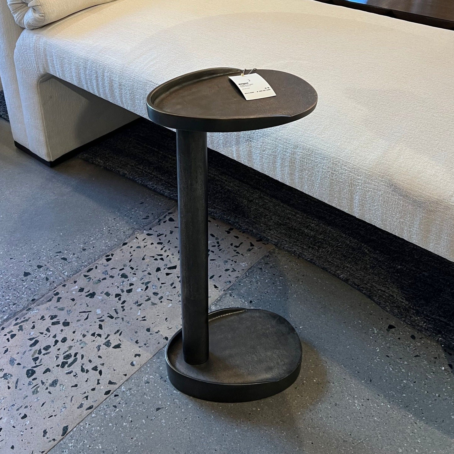 The Slade Drink Table in Graphite Aluminum  from Arteriors Home makes a stylish resting place for a martini. Graphite aluminum is molded in a teardrop shape giving the Slade Drink Table an offset silhouette. Versatile and small-scale, the pedestal accent can tuck into any space in need of a little edge.