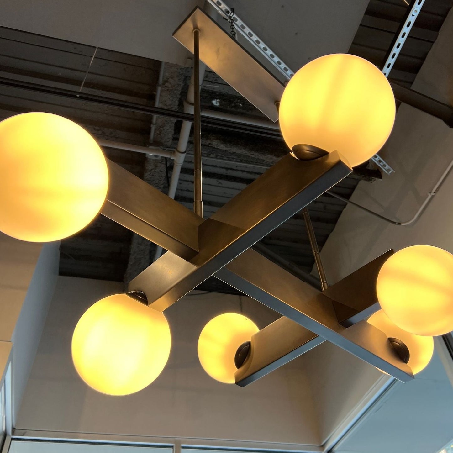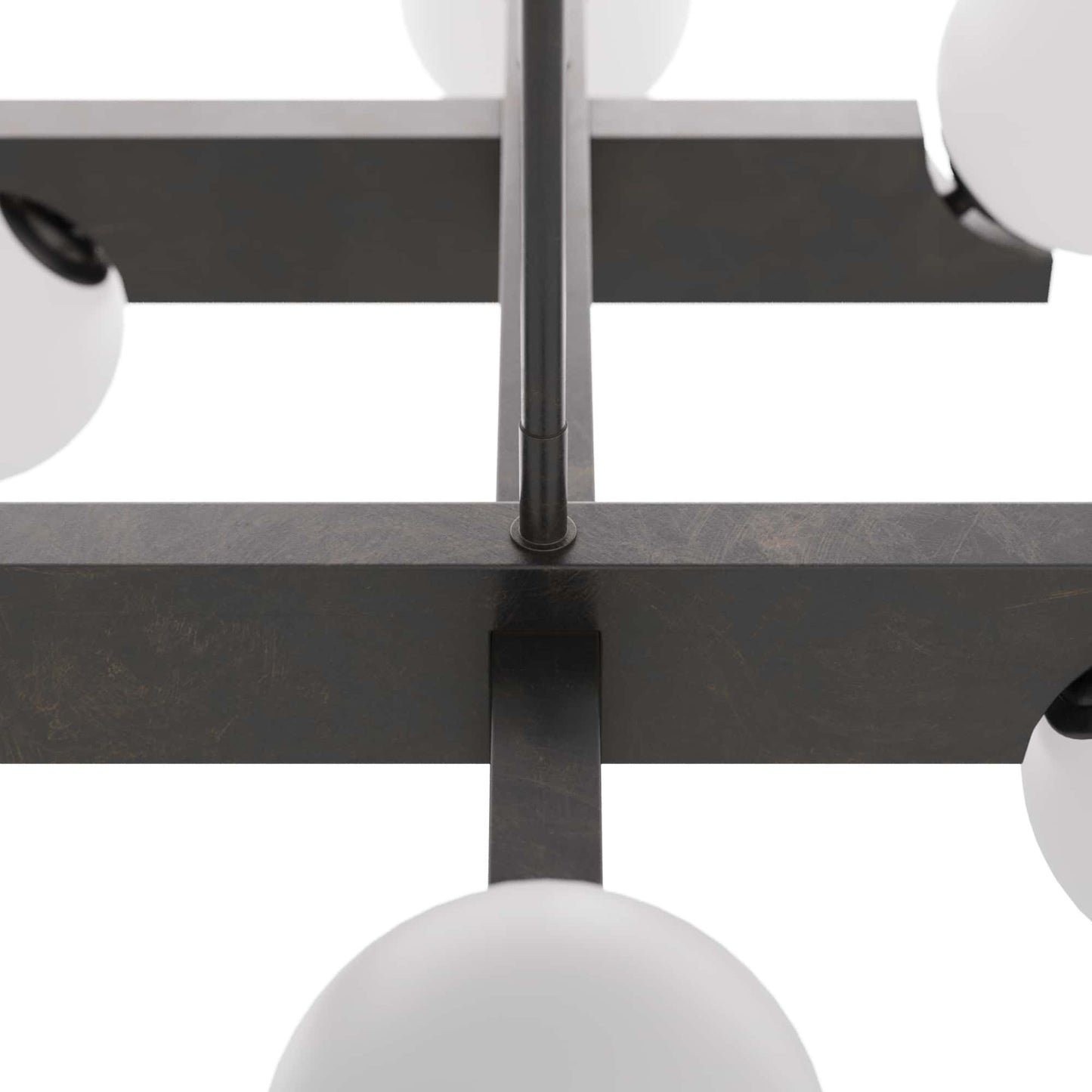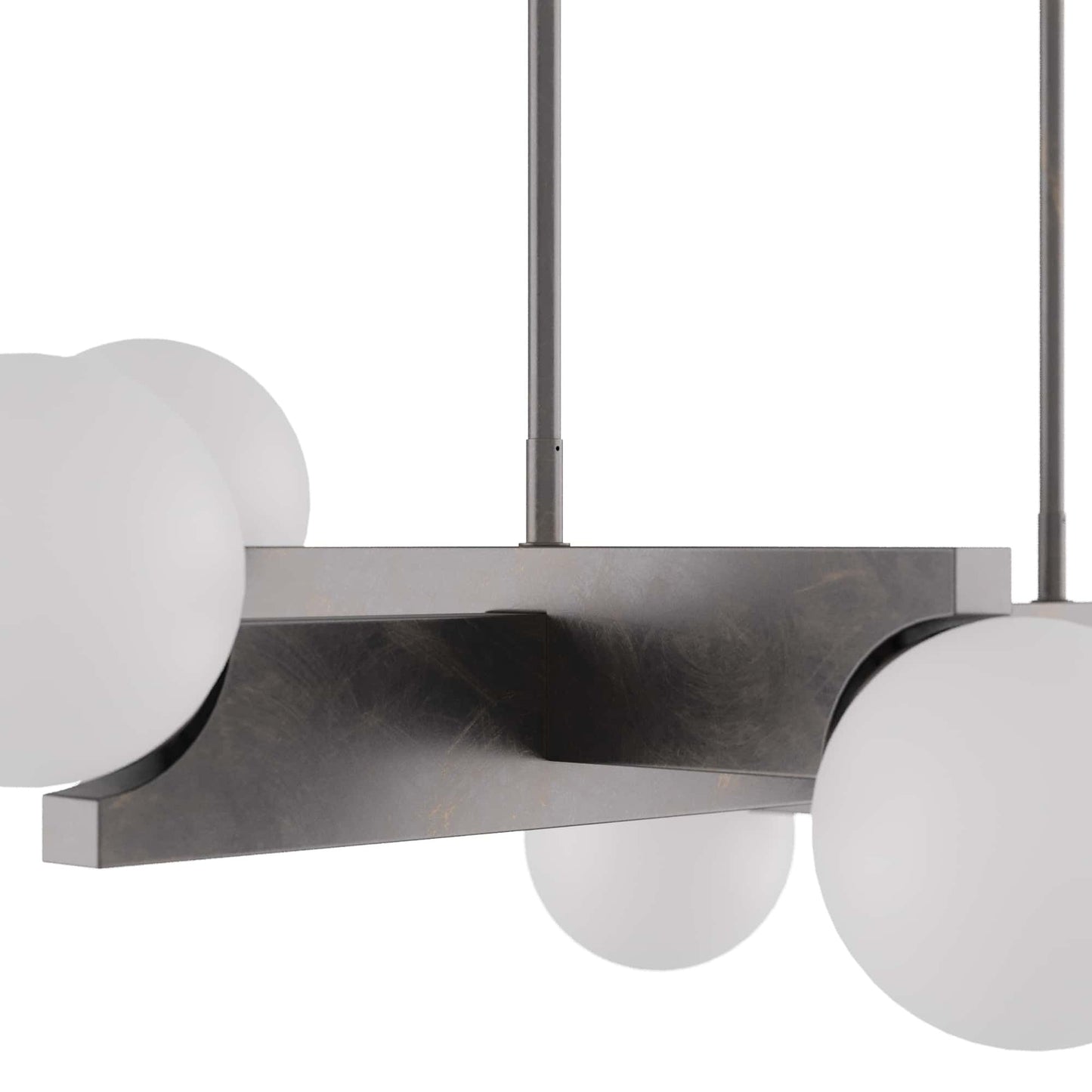This Tallow Chandelier from Arteriors Home features a bold, industrial-style design with an English Bronze finish and frosted glass globes. Its dual pipe suspension and linear canopy make for a striking addition to any space.