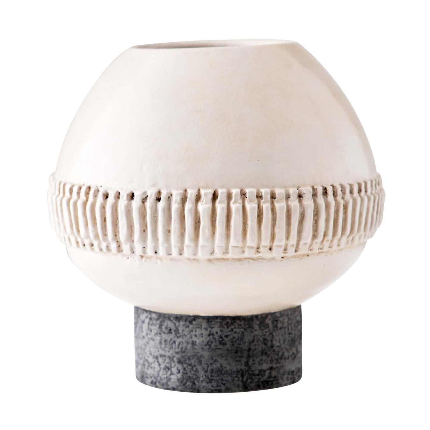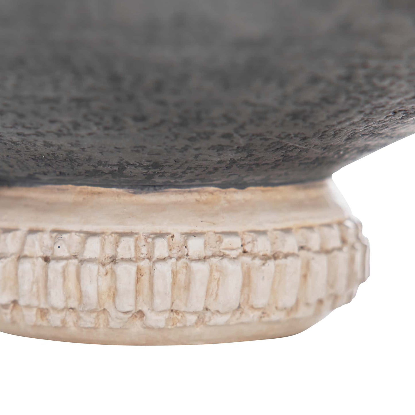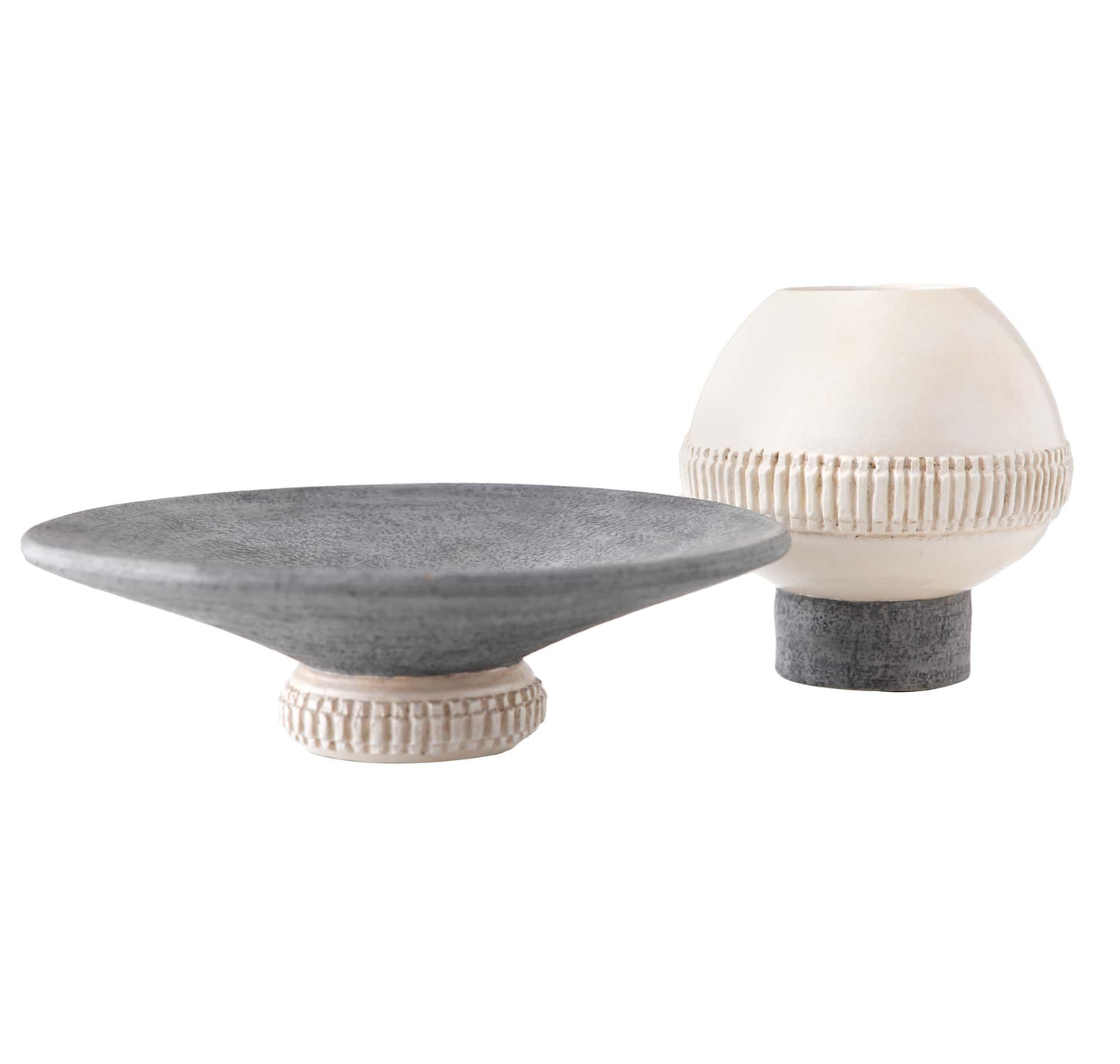 The two-tone Taza Tabletop Set from Arteriors Home bestows an artisanal character to any tabletop. The pair is designed in contrasting graphite and ivory terracotta with opposing matte and gloss finishes. Carved, textured bands, reminiscent of tramp art, decorate each piece.