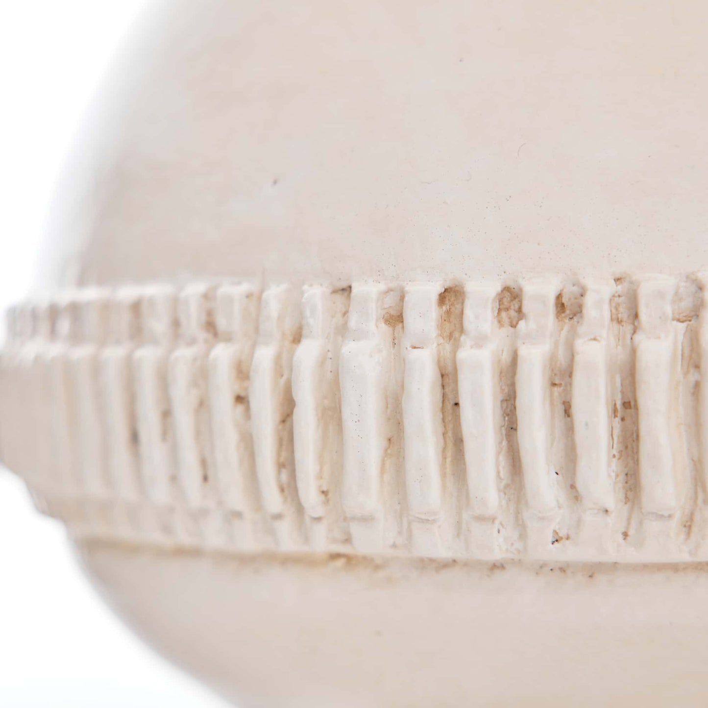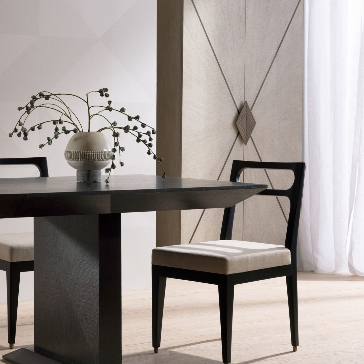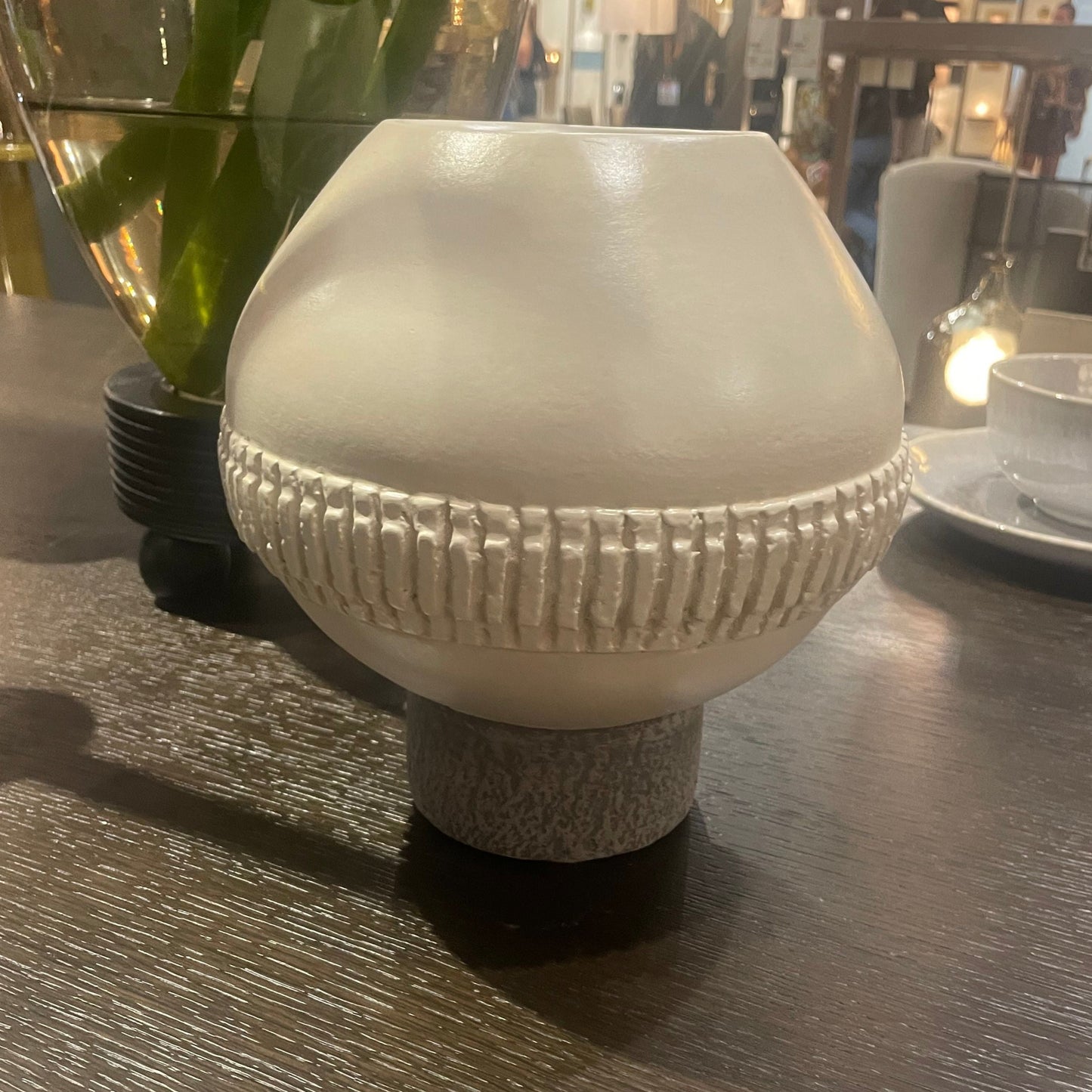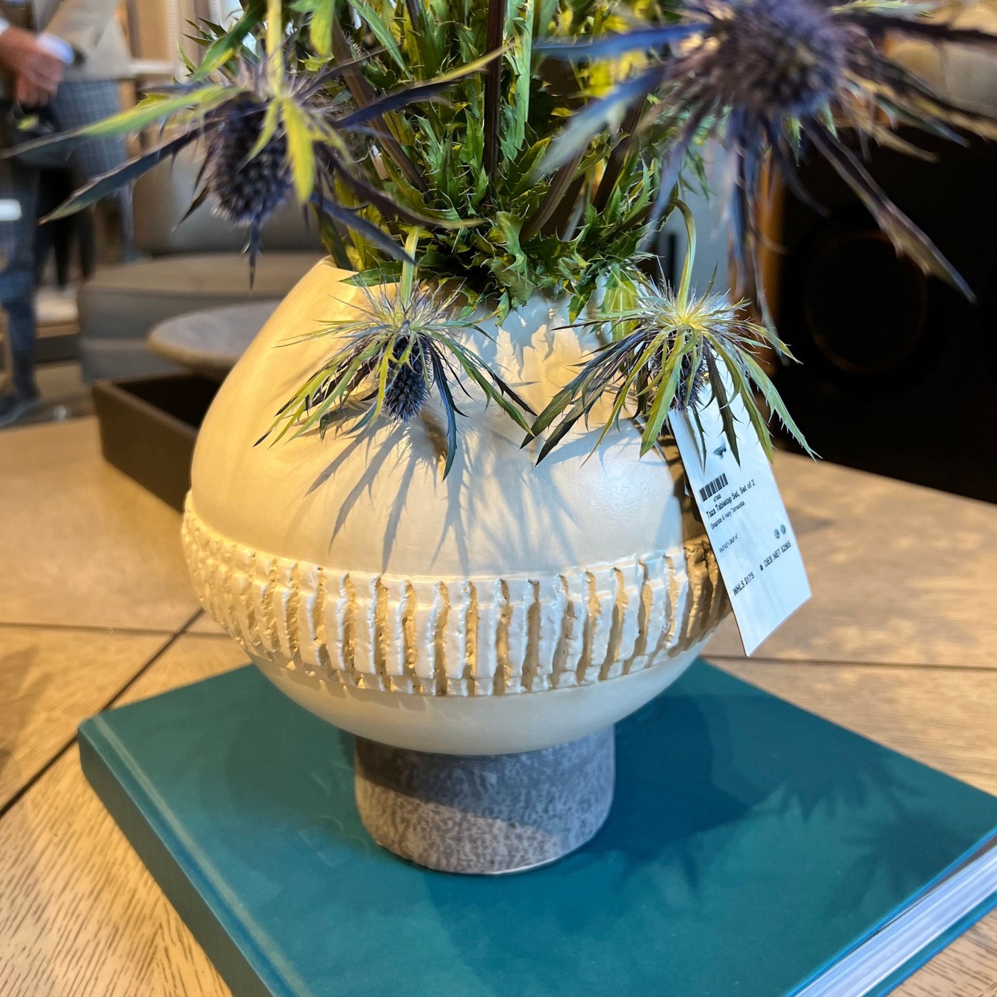 The two-tone Taza Tabletop Set from Arteriors Home bestows an artisanal character to any tabletop. The pair is designed in contrasting graphite and ivory terracotta with opposing matte and gloss finishes. Carved, textured bands, reminiscent of tramp art, decorate each piece.