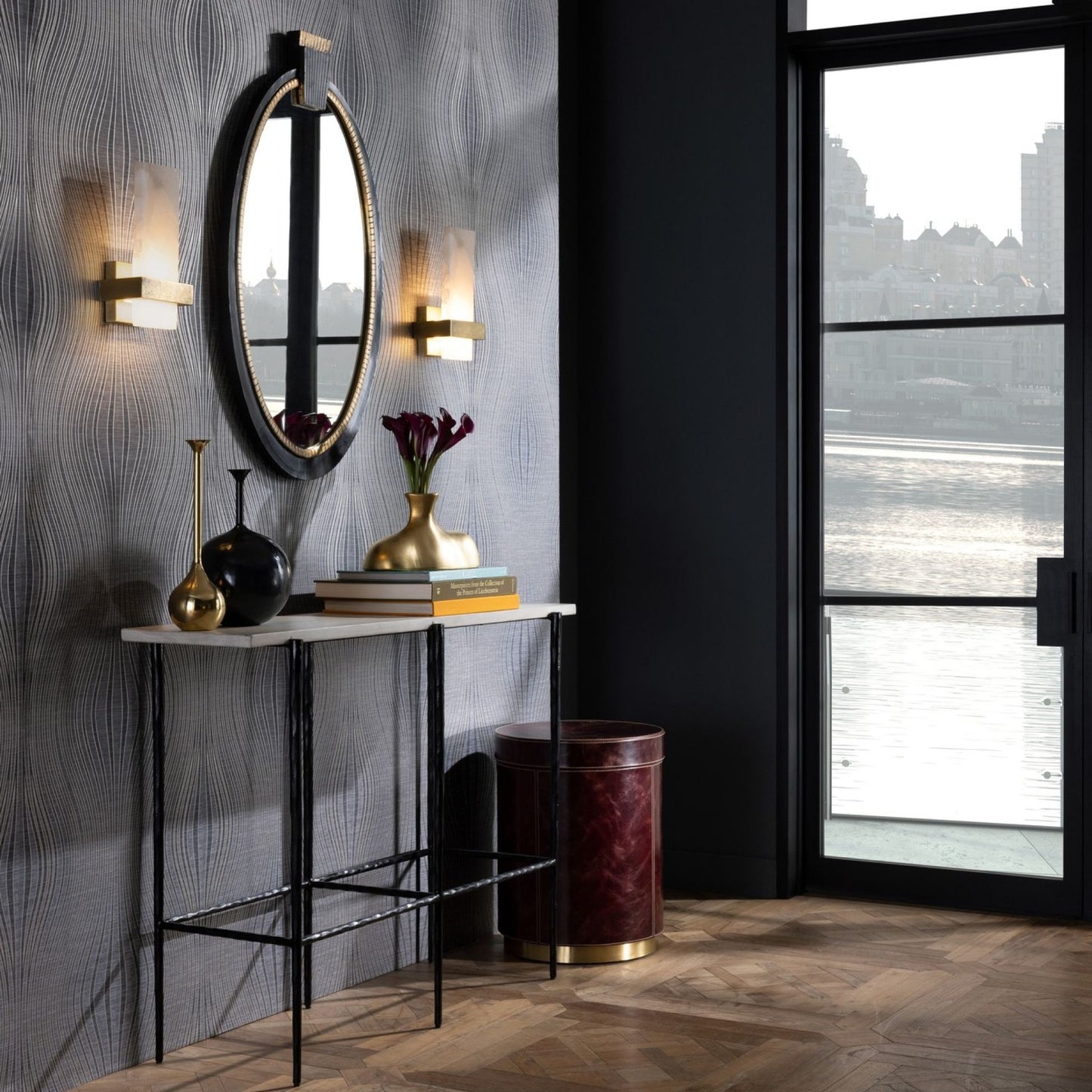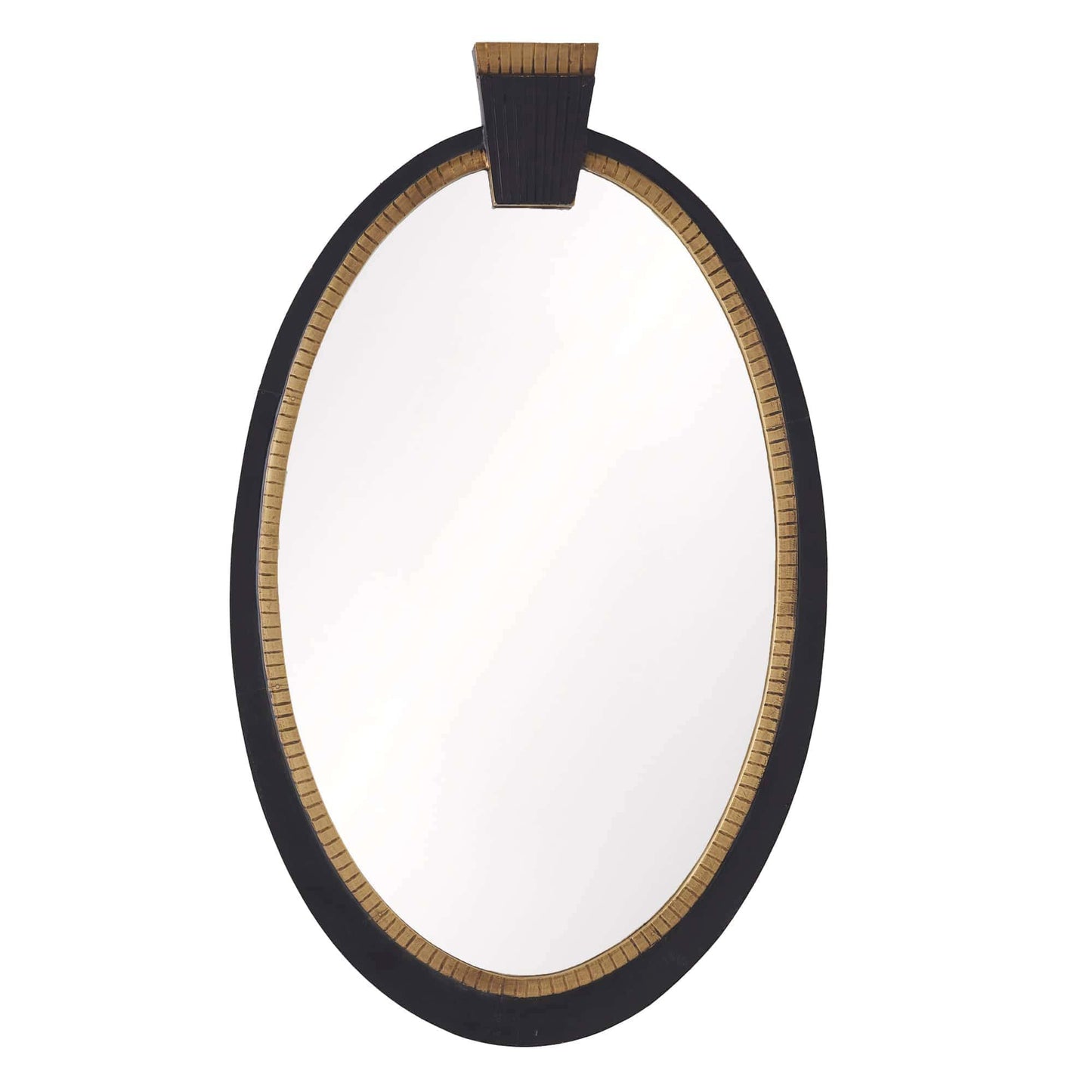 The Tedesco Mirror in Ebony Wood and Antique Brass from Arteriors Home is a versatile addition to both modern and traditional spaces. The oval accent, crafted in ebony wood, features a carved antique brass band. A coordinating carved appliqué with a cleat for hanging completes this heirloom-quality piece.