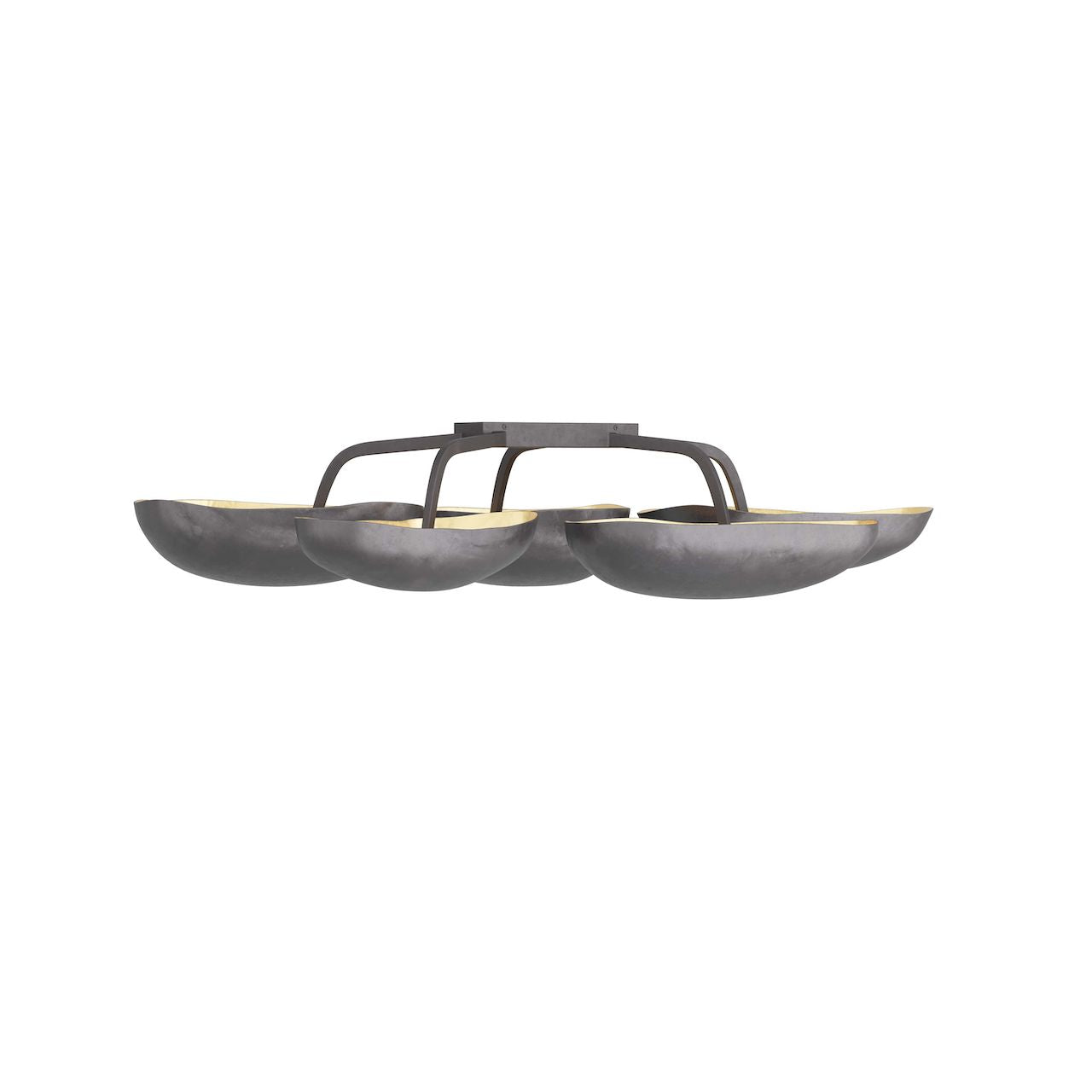From Arteriors Home, the Theo Semi-Flush Mount in Blackened Iron boasts five sculptural pod-shaped shades. The light's blackened iron construction, paired with gold-leaf-lined interiors, creates an opulent effect. These inverted shades emit a warm, upward glow, making this fixture a stunning choice for any space.