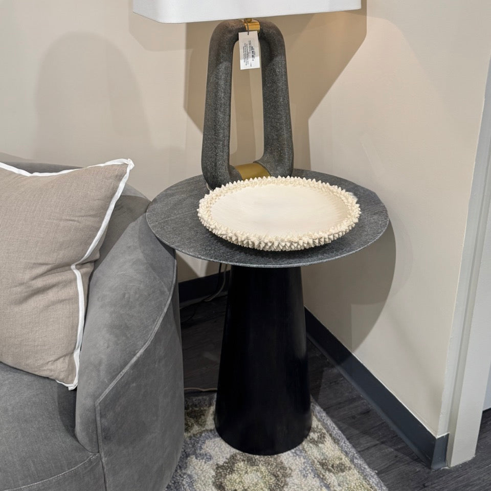 Traditional design and mixed materials compose the simple silhouette of the Theodore Side Table in Ebony Wood and Gray Marble from Arteriors Home. A round, gray solid marble top is attached to a tapered wood base that has been sandblasted in an ebony finish.