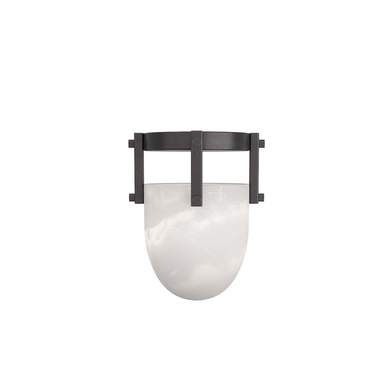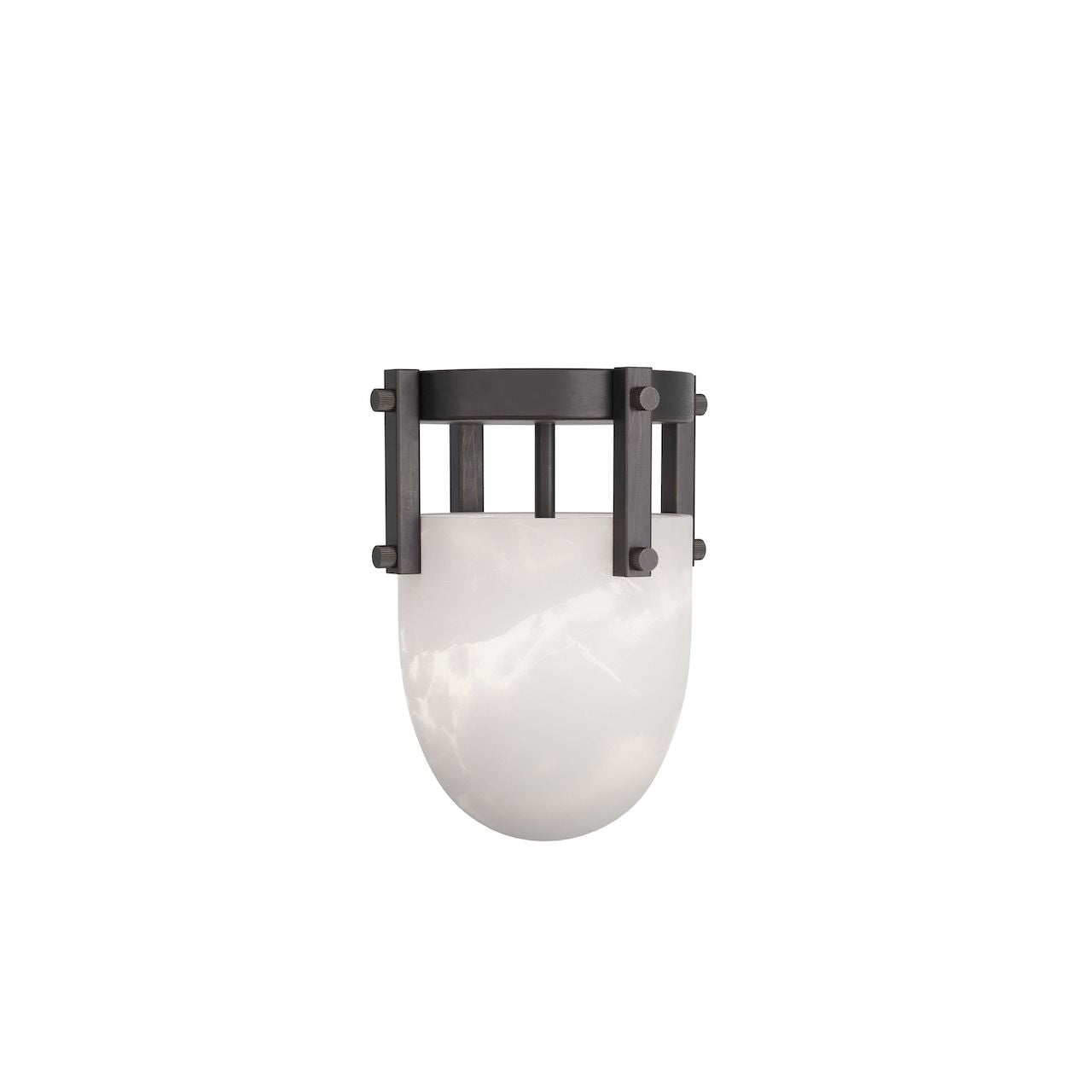 An elegant and statement-making solution for small spaces, the Toren Flush Mount in White Alabaster from Arteriors Home is brilliantly crafted in a domed, white alabaster shade suspended from a brawny frame of English bronze ironwork.