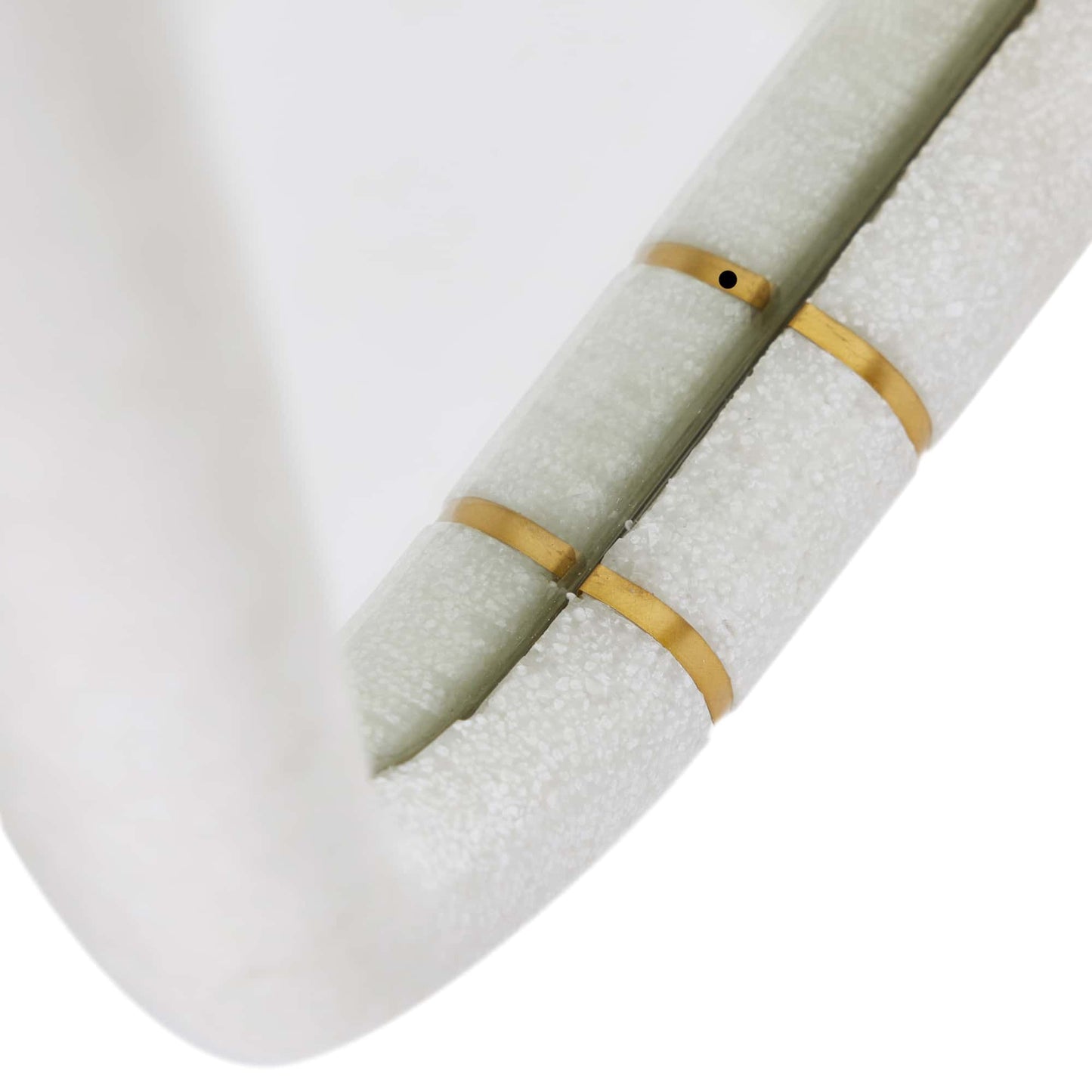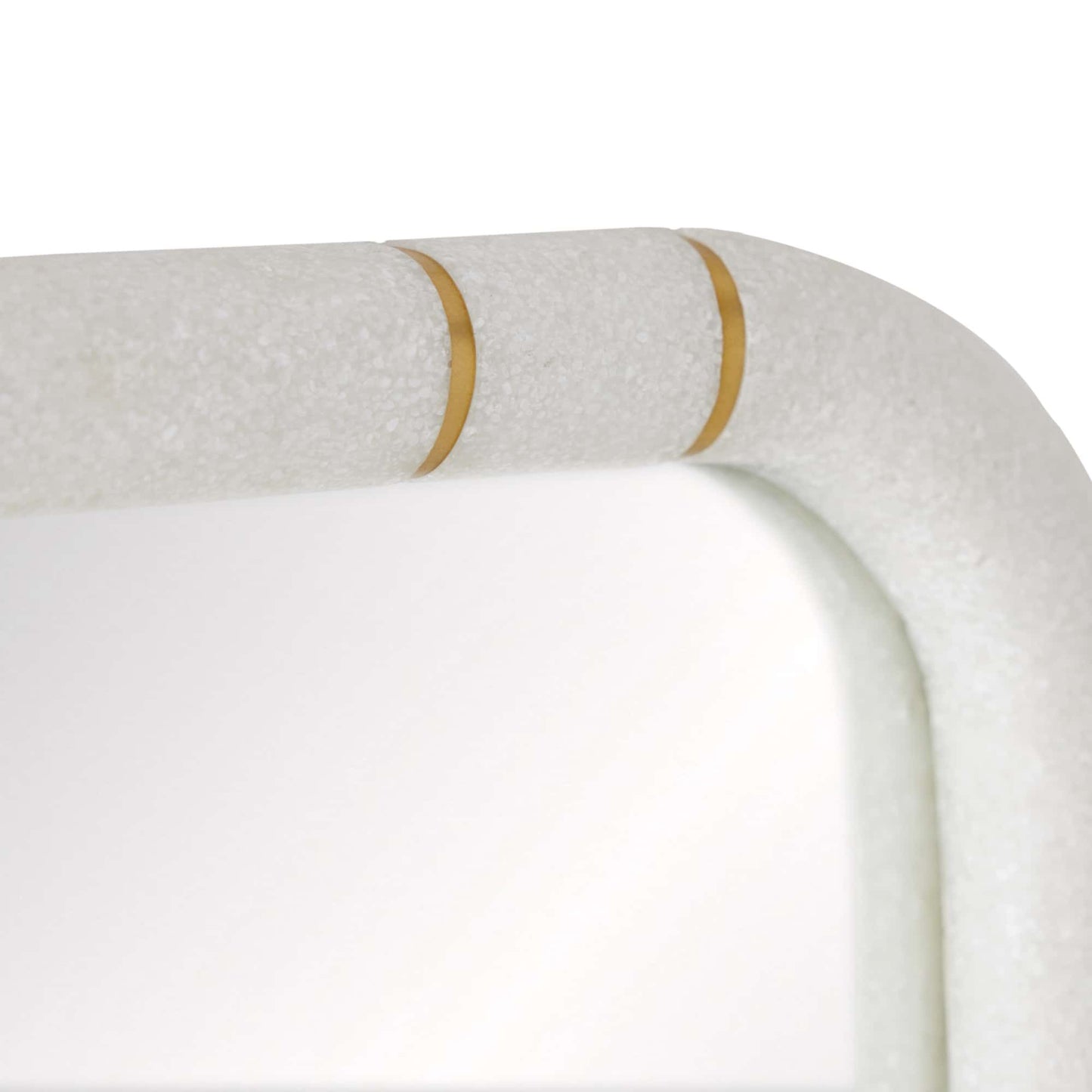 Exuding modern elegance, the Trevino Mirror in Ivory Ricestone from Arteriors Home is created in a glistening ivory ricestone composite with antique brass steel inlays that wrap around the mirror’s bullnose edge.