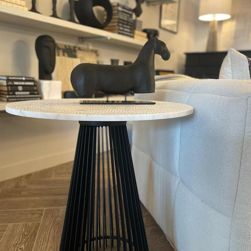 The figurative Vanderlinde Sculpture in Charcoal Ricestone from Arteriors Home is a tabletop sculpture was inspired by sculptures of antiquity, the art object is recast in porous charcoal riverstone composite and rests on a bronzed steel base.