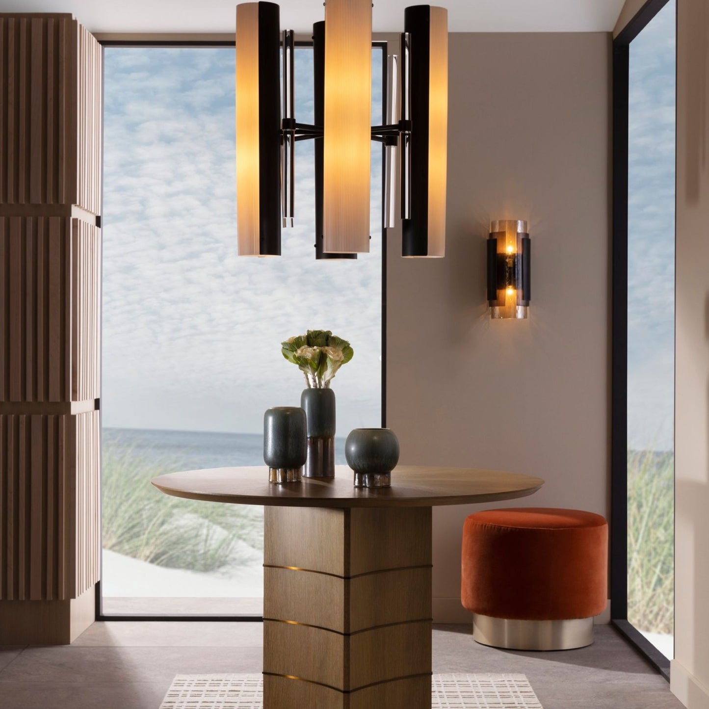 The Vivian Sconce in Bronze Iron and Smoke Glass from Arteriors Home showcases an elegant layered design of textured champagne and smoke glass. The glass sleeves are arranged in overlapping, staggered sizes, reminiscent of jewelry, with a bronze iron cuff enveloping the glass column.