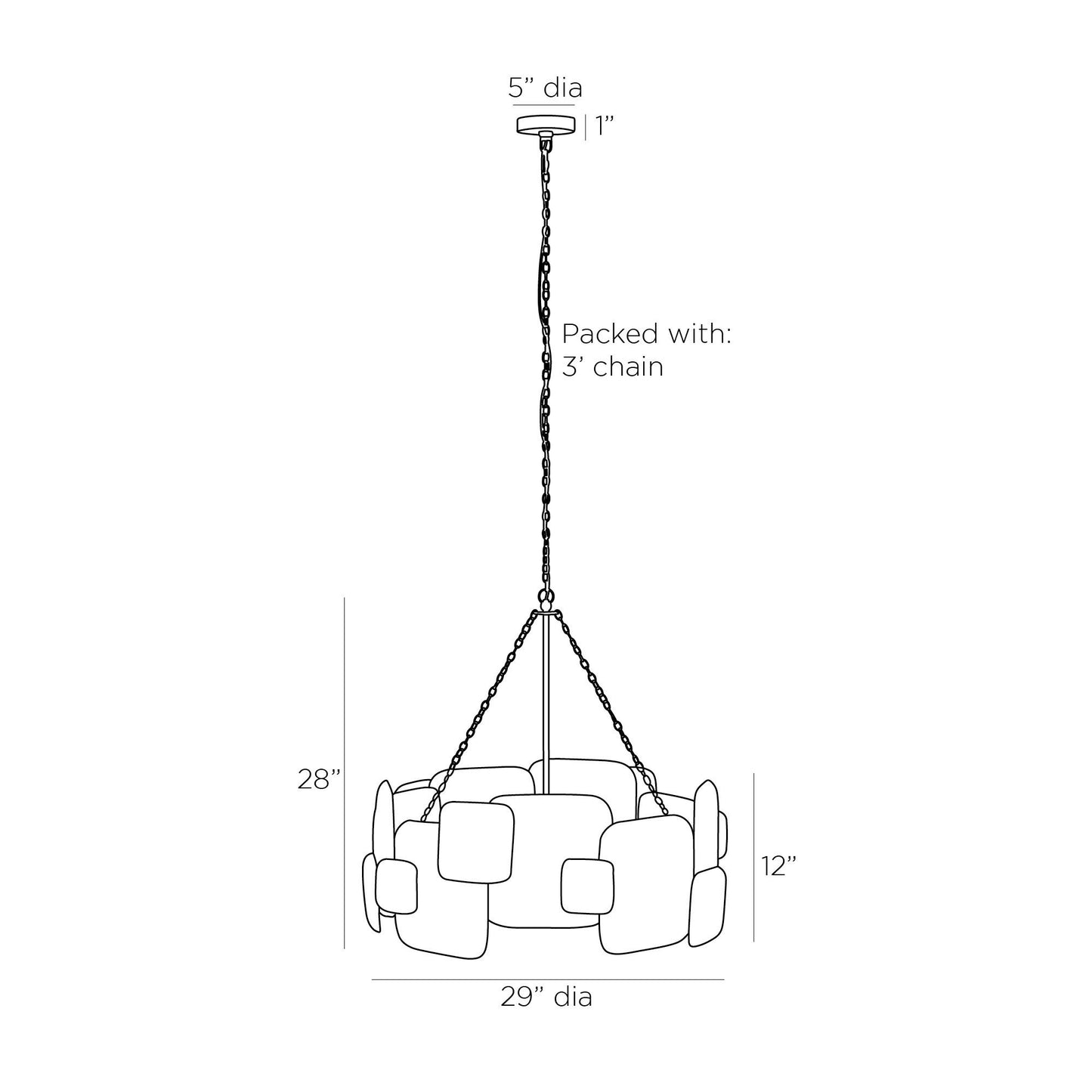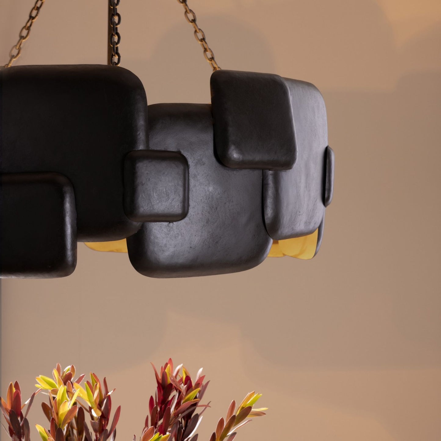 In any space, the brutalist-style Waylon Chandelier in Blackened Iron from Arteriors Home demands attention. The hulking fixture is forged in a drum silhouette of blackened iron, with overlapping, pillowy forms. The chandelier is fashioned with a pipe and chain link suspension, also in blackened iron. Finish will vary.