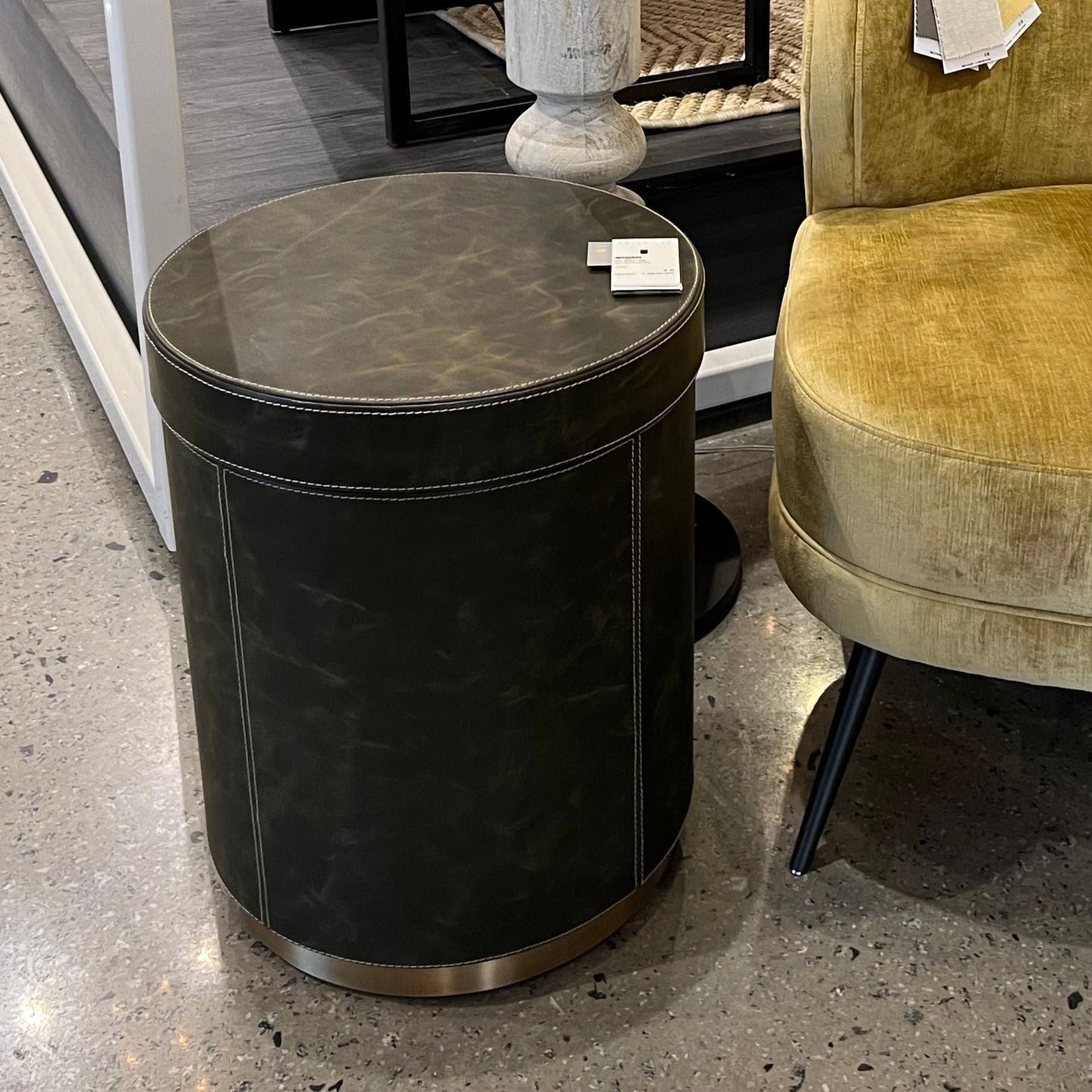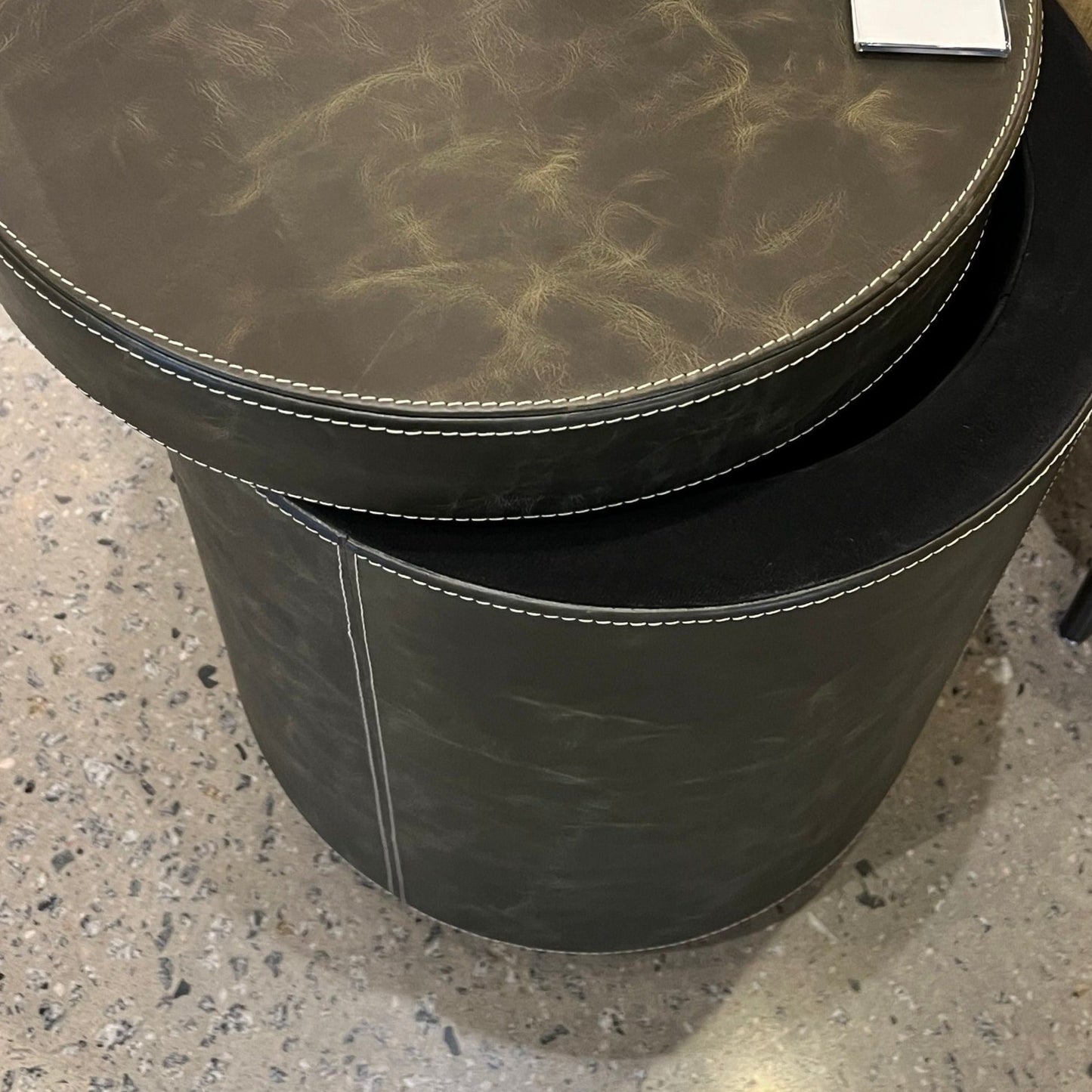 The Wes Accent Table from Arteriors Home in Moss Leather does double duty as a table as well as a cache for storing throws and the like. This handsome accent piece is created in moss colored leather with contrasting stitching and a lid that lifts to reveal a black suede-lined storage inside.