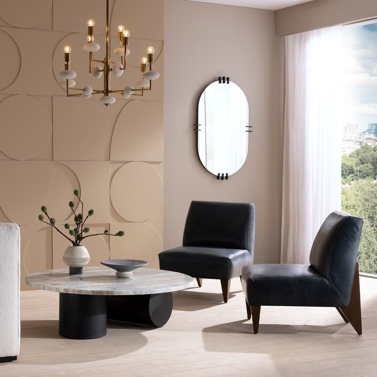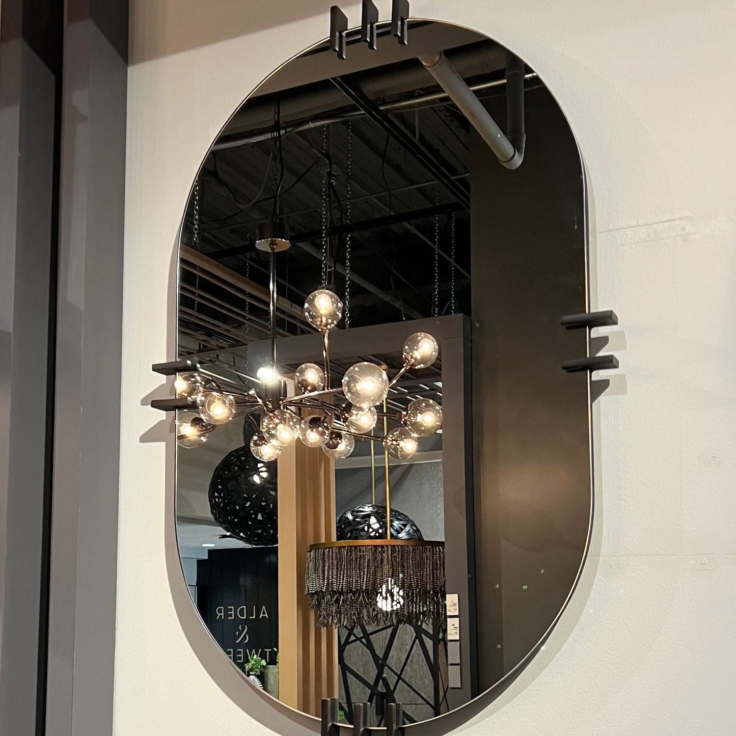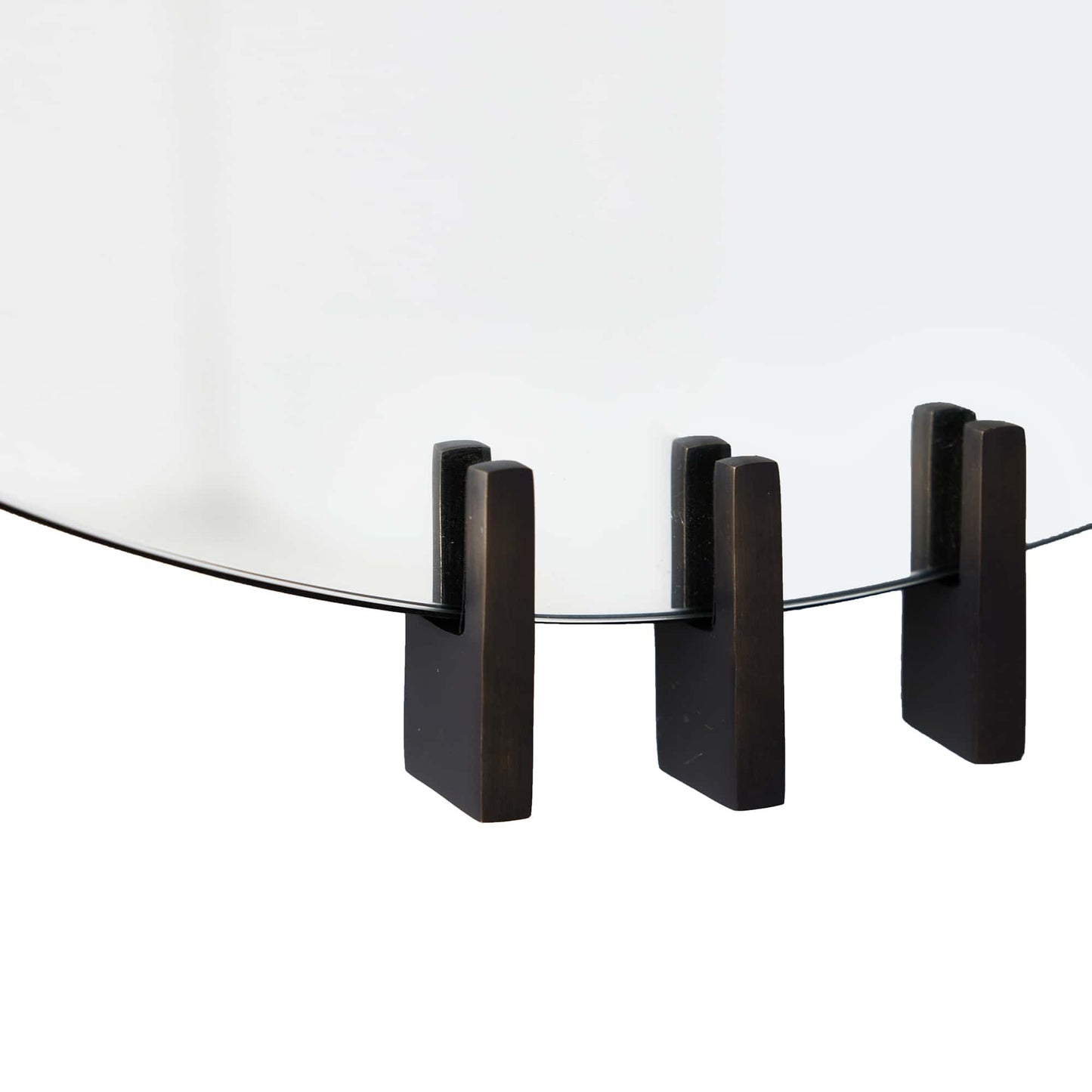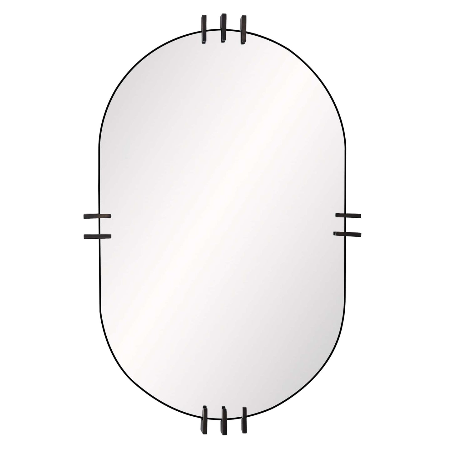 Arteriors Home's Wilder Mirror Bronzed Iron draws inspiration from cabochon jewelry settings, with bronzed-iron prongs on either side securing the mirror in place. The mirror's curved shape is encased in a slim band of bronze iron metal.