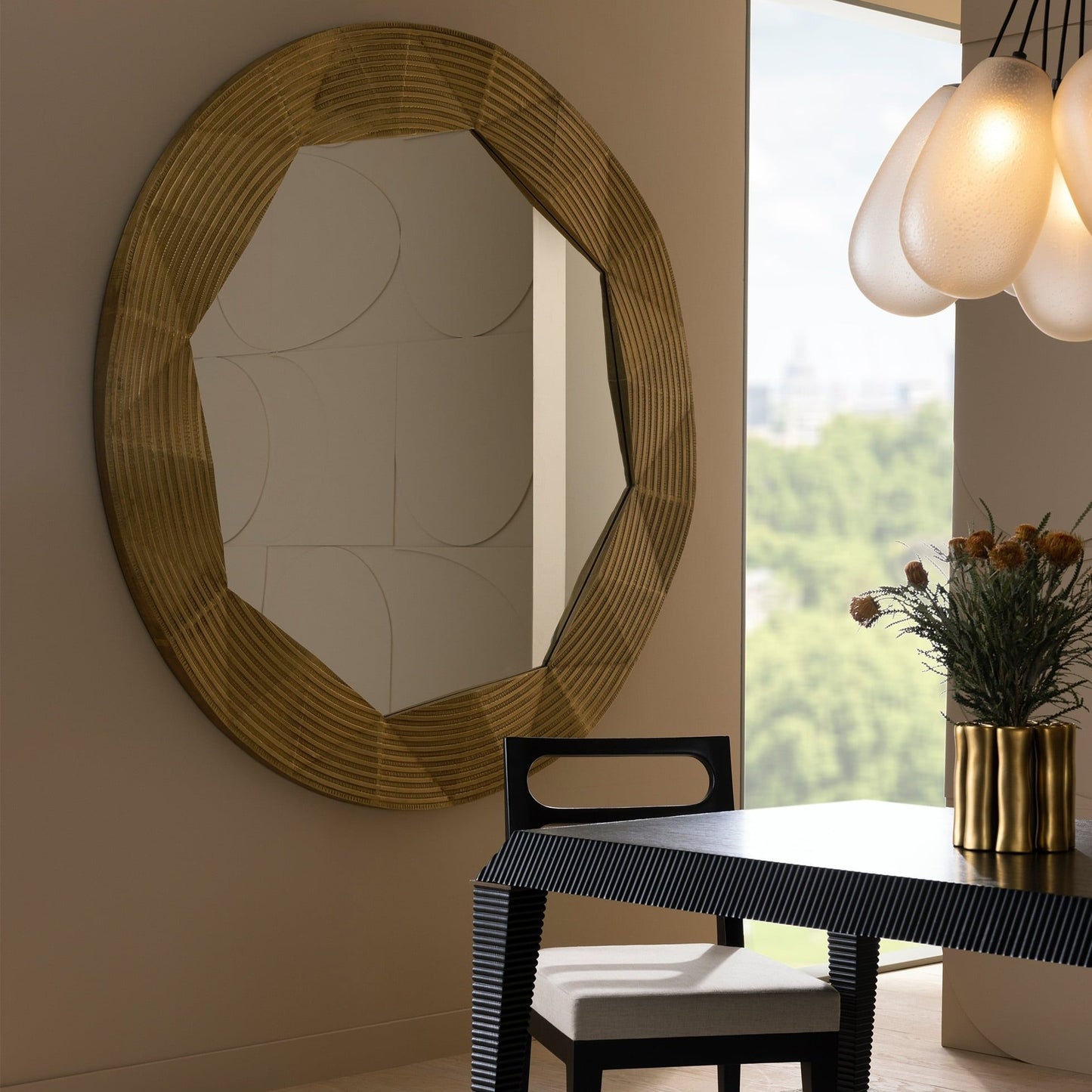 The generously scaled Wilma Mirror in Antique Brass from Arteriors Home is a statement-maker in any space it resides. Designed with a mid-century sensibility, the round mirror is clad in lustrous antique brass with concentric lines and faceting detailing.