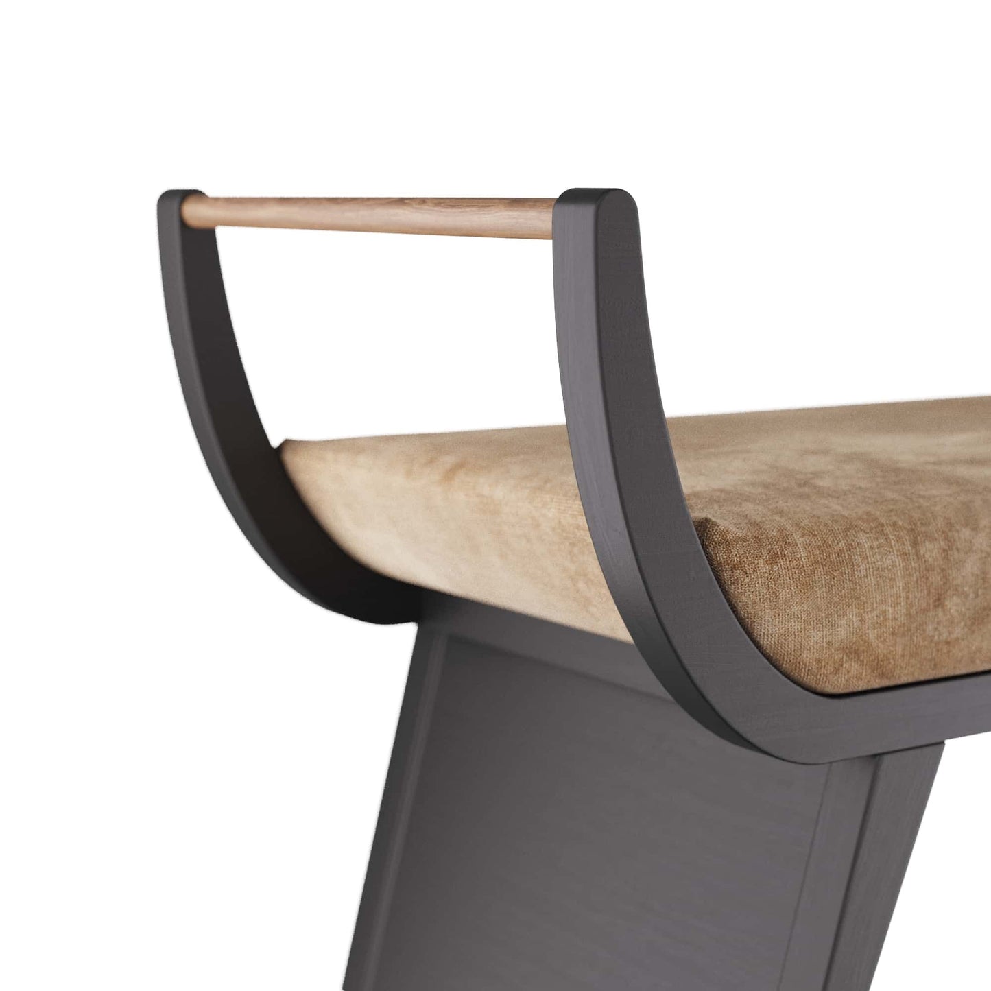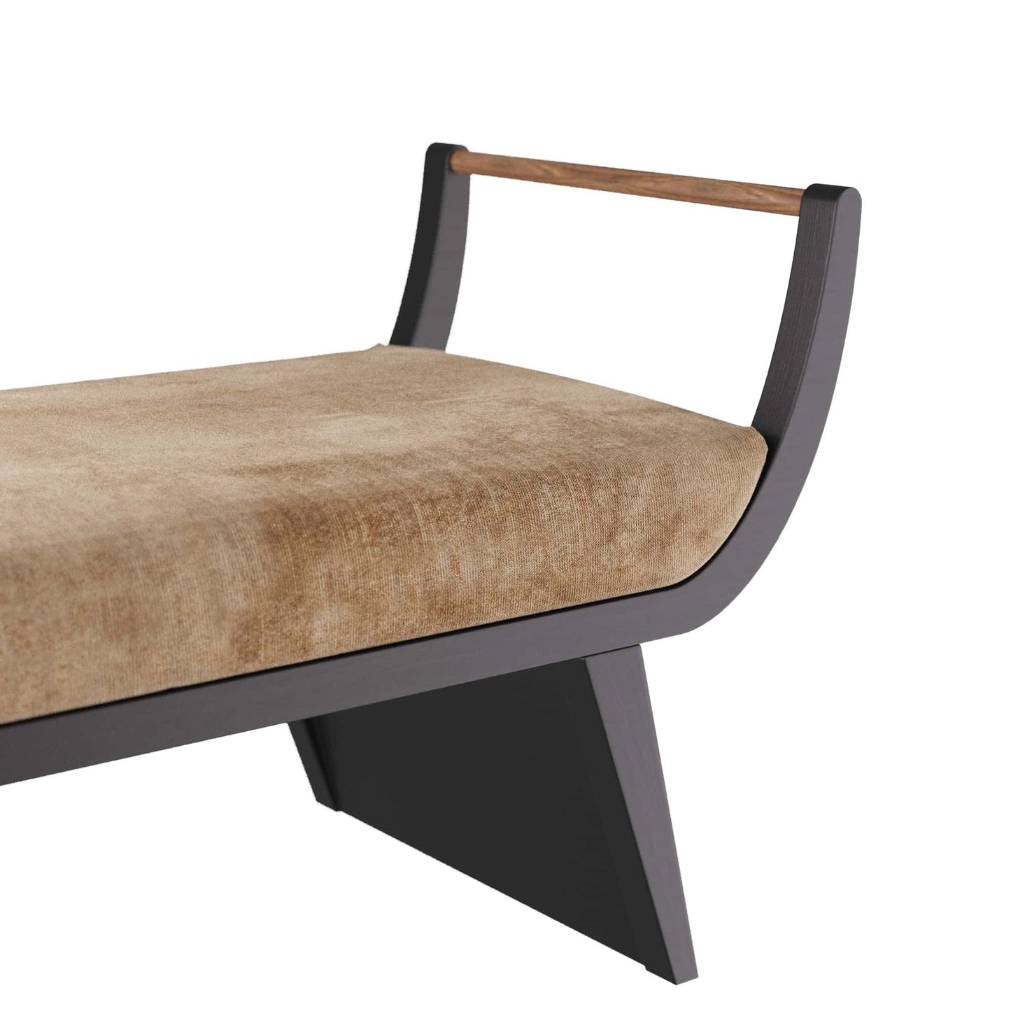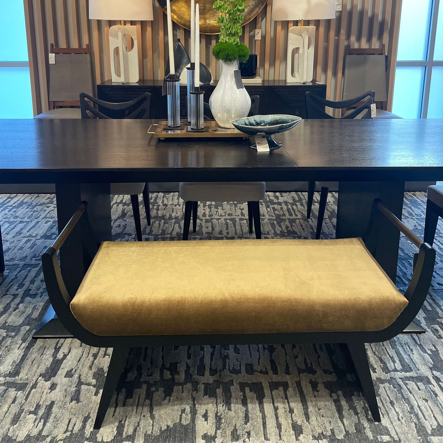Elegantly appointed in a lustrous harvest velvet, the midcentury-influenced Winston Bench in Harvest Velvet from Arteriors Home dresses up any space. Modern and timeless, the seat is designed with sled legs in ebonized acacia wood and features brass-clad arm detailing. Finish will vary.
