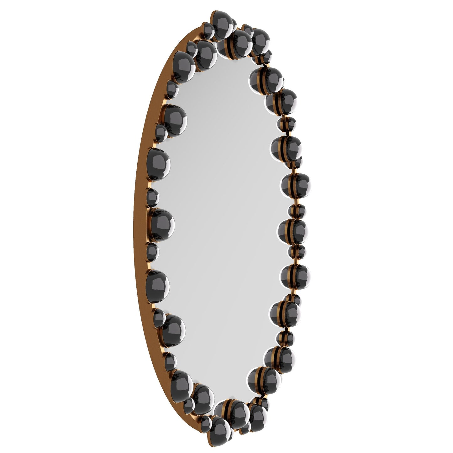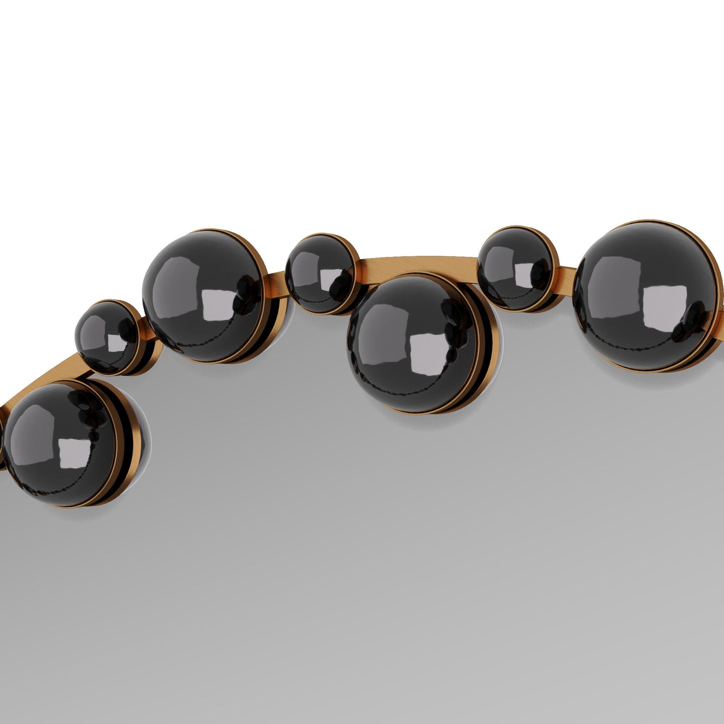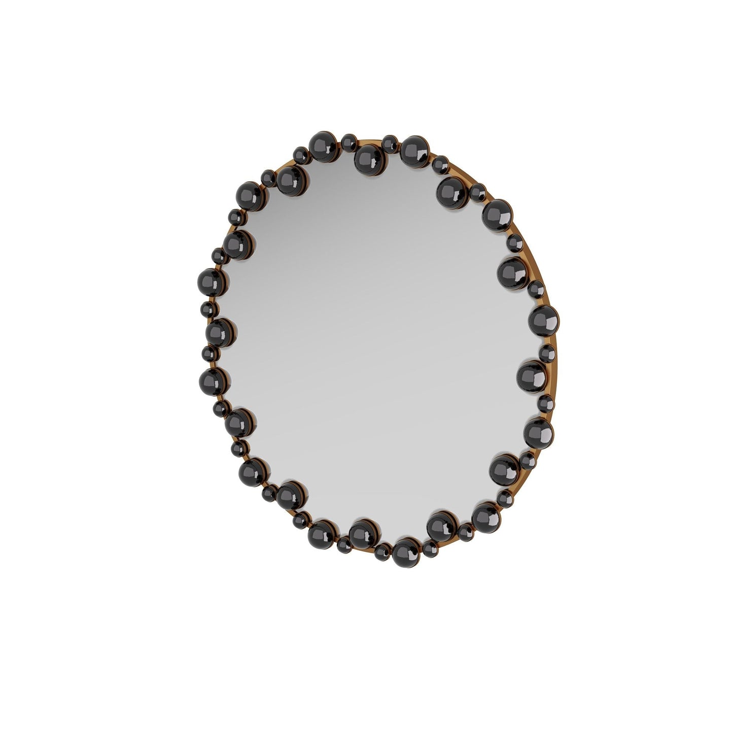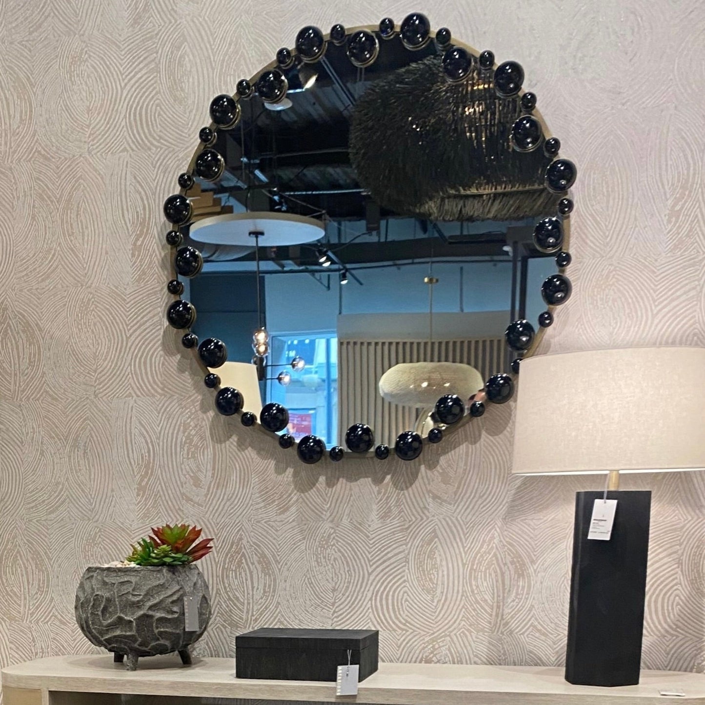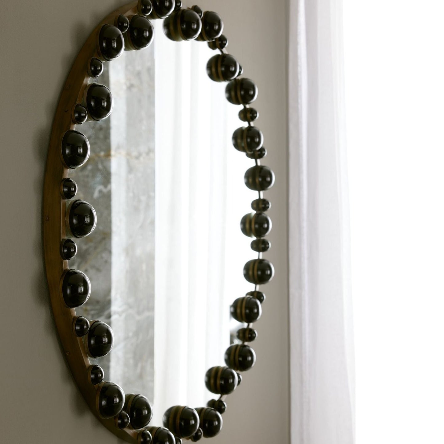 Crafted with a blend of elegant elements and natural shapes, the Arteriors Home's Zaldana Mirror in Black Glass exudes a playful sophistication. Drawing inspiration from jewelry design, the roundel is framed by effervescent dome-shaped spheres of different sizes. All encased in antique brass iron.